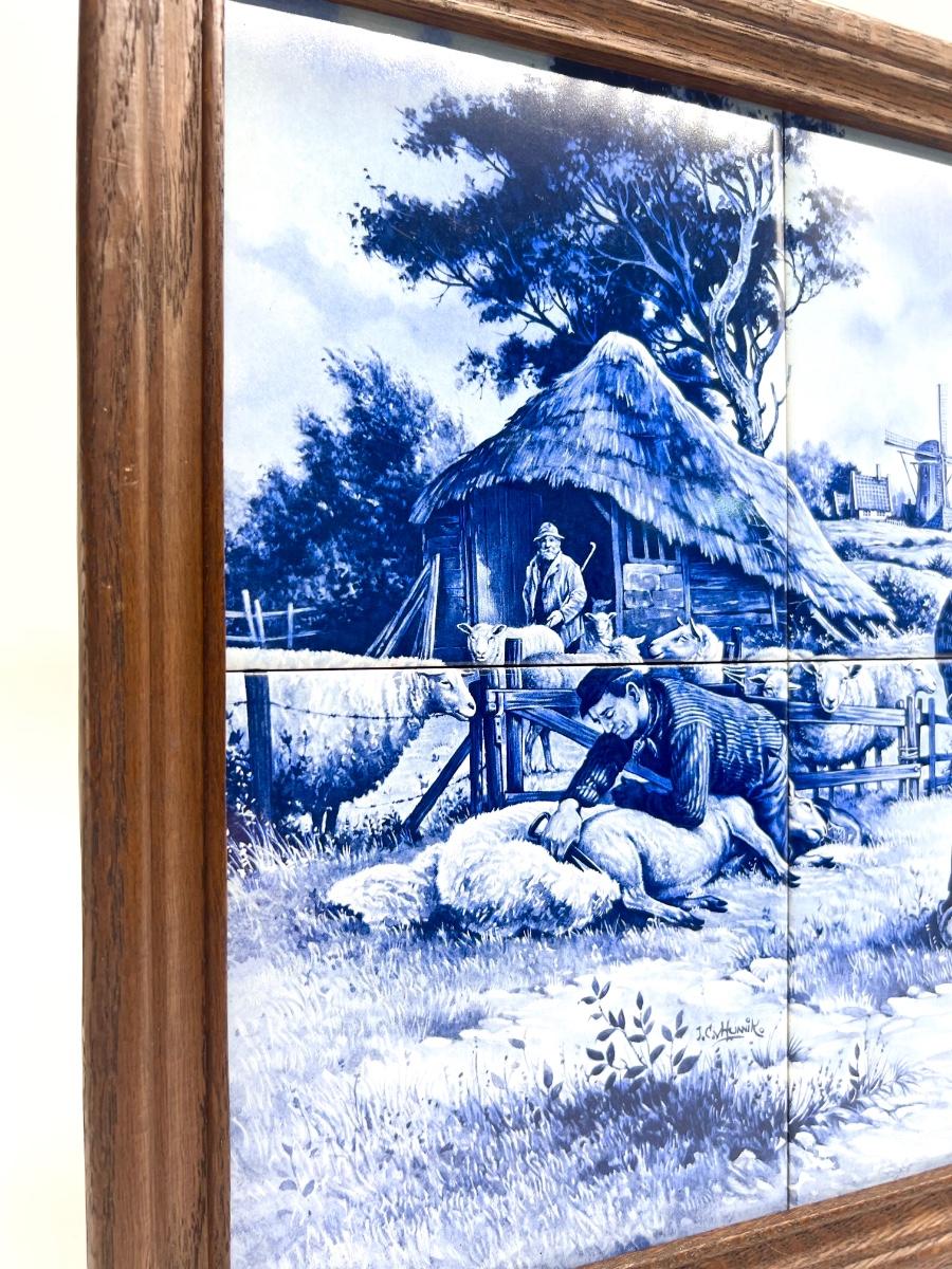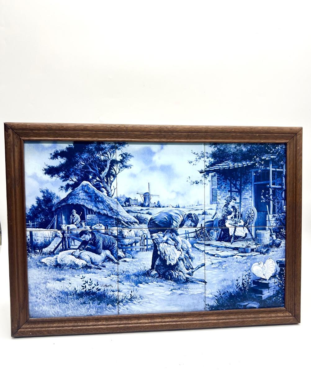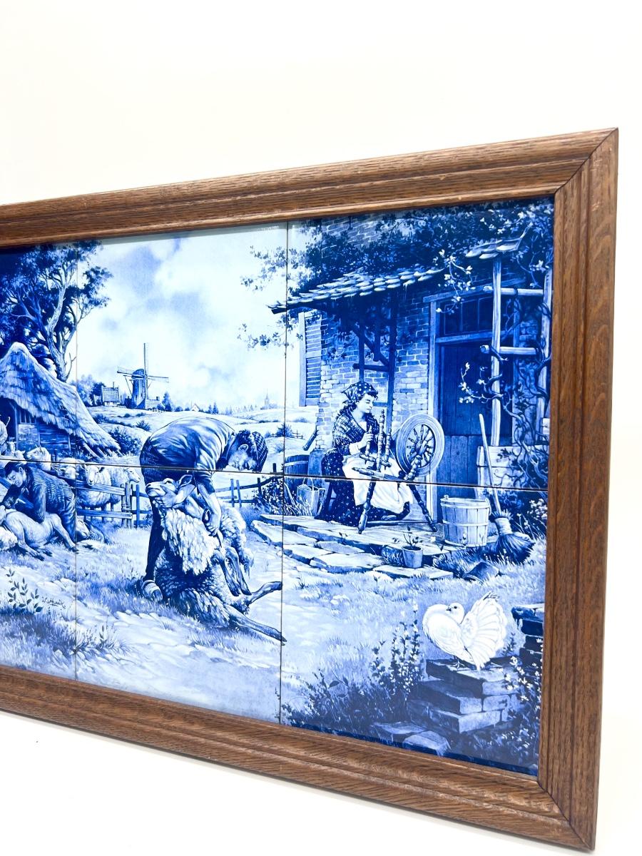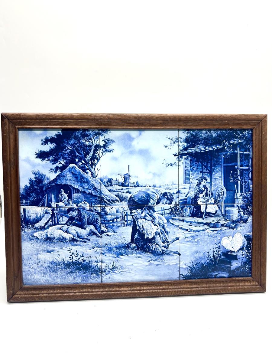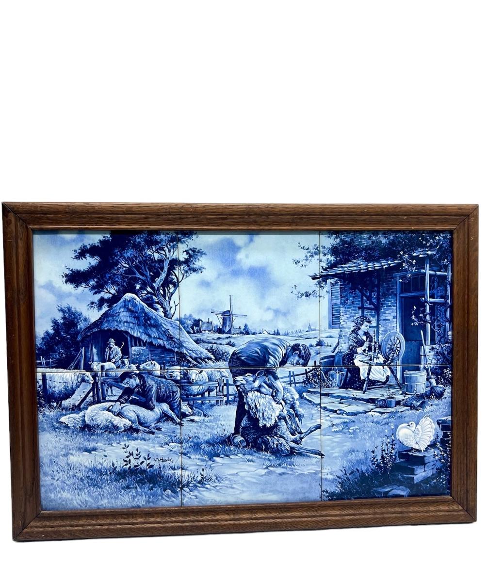 Large Handpainted Delft Tile Panels Glazed Tiles & Wooden Panel backing from Holland, Measures 6 tiles. Measures 14 inches tall and 20 inches wide.