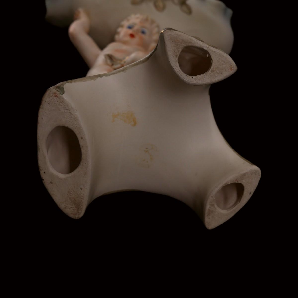Large Victorian era style cherub boy holding dish. Charming boy has makeup and florid complexion, floral motifs throughout piece. Hand-painted ceramic with no issues found. Superb condition! Total piece measures approximately L 9" x H 17" x W 6", packaged lot weighs 5 lbs. (D103)