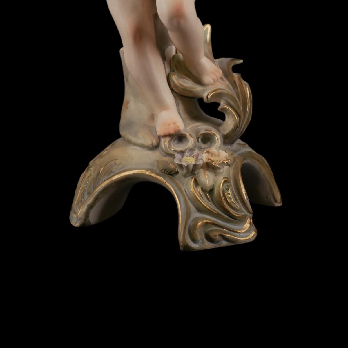 Large Victorian era style cherub boy holding dish. Charming boy has makeup and florid complexion, floral motifs throughout piece. Hand-painted ceramic with no issues found. Superb condition! Total piece measures approximately L 9" x H 17" x W 6", packaged lot weighs 5 lbs. (D103)