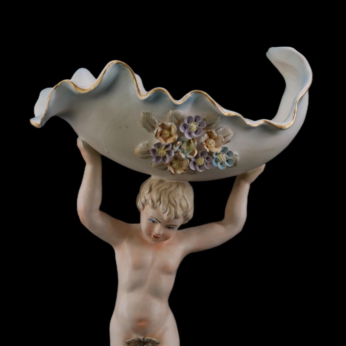 Large Victorian era style cherub boy holding dish. Charming boy has makeup and florid complexion, floral motifs throughout piece. Hand-painted ceramic with no issues found. Superb condition! Total piece measures approximately L 9" x H 17" x W 6", packaged lot weighs 5 lbs. (D103)