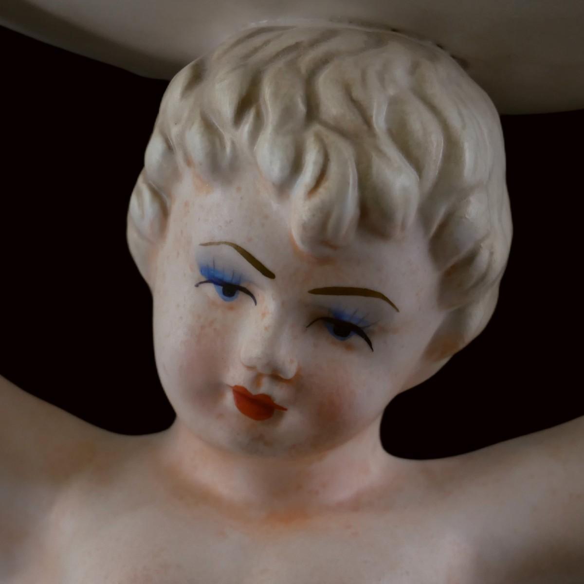 Large Victorian era style cherub boy holding dish. Charming boy has makeup and florid complexion, floral motifs throughout piece. Hand-painted ceramic with no issues found. Superb condition! Total piece measures approximately L 9" x H 17" x W 6", packaged lot weighs 5 lbs. (D103)