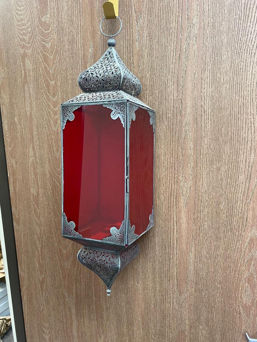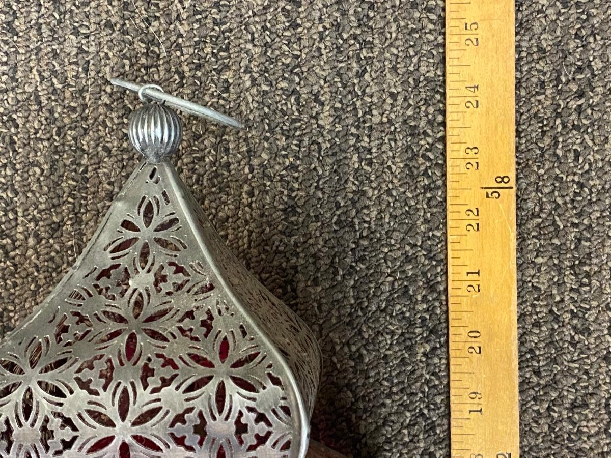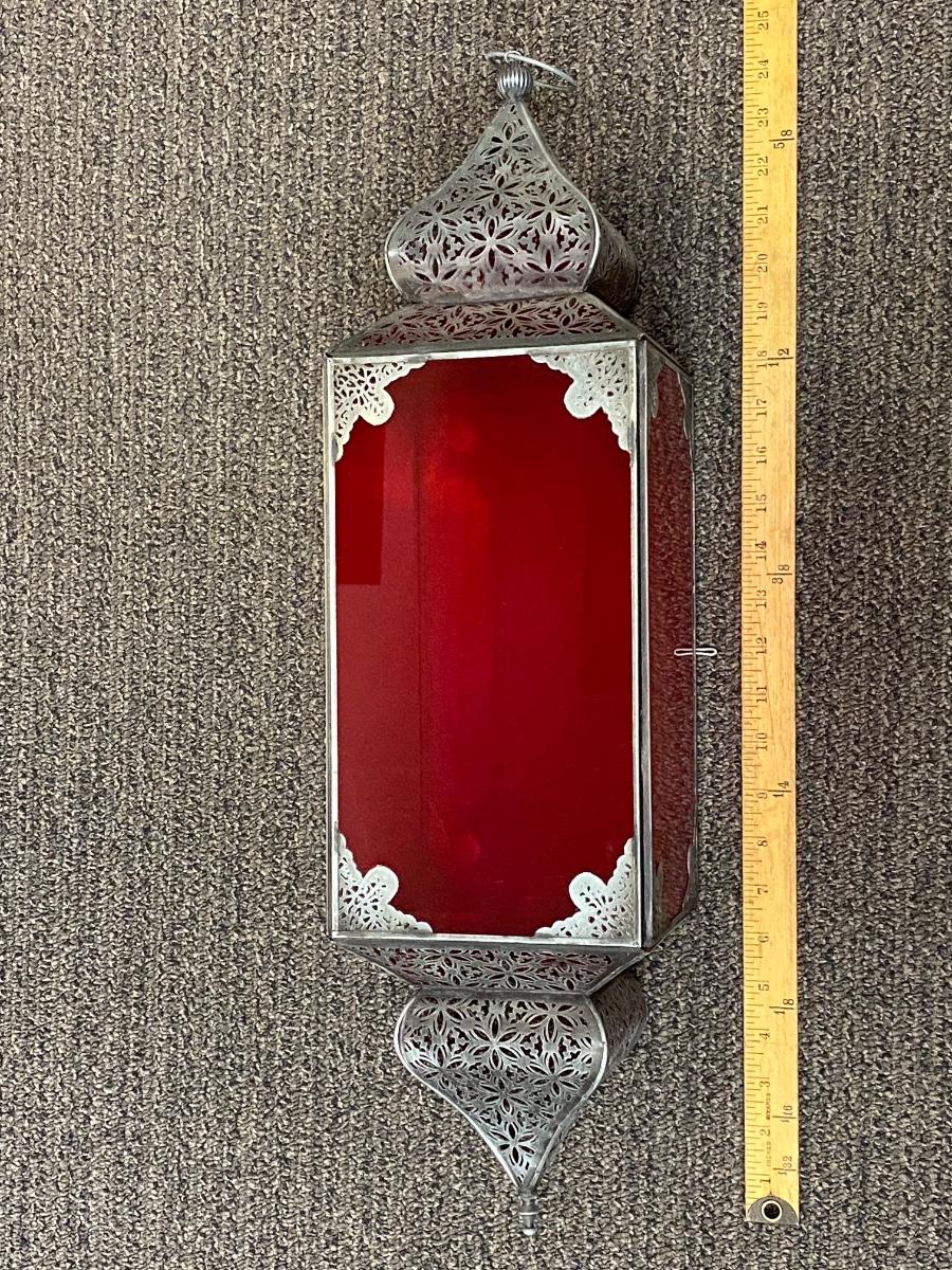 Large Moroccan style candle holding lantern. About 24" length. Silvertone metal with red glass panels, hinged door opens for candle access. Would hold a tealight or votive easily, you could probably put a taller candle in it but it would have to be skinny like a votive. In good condition.