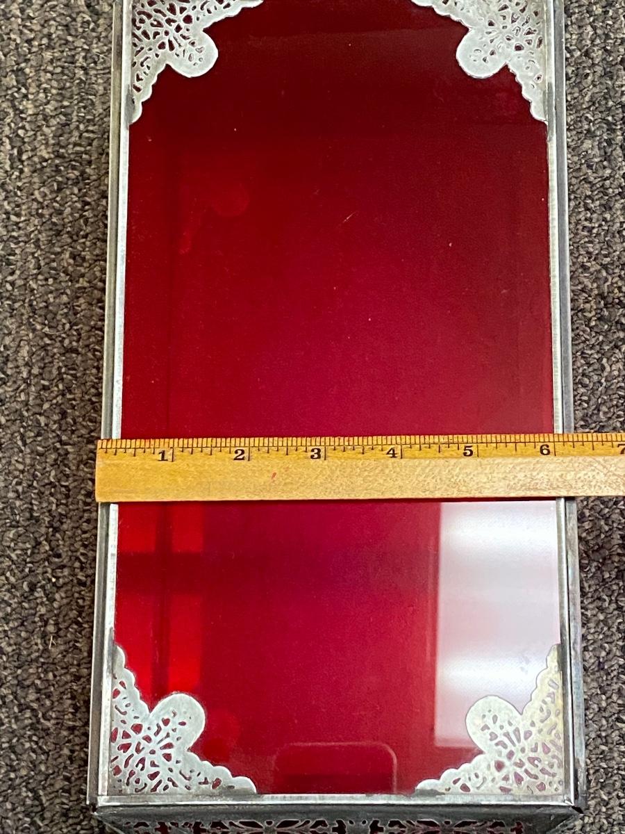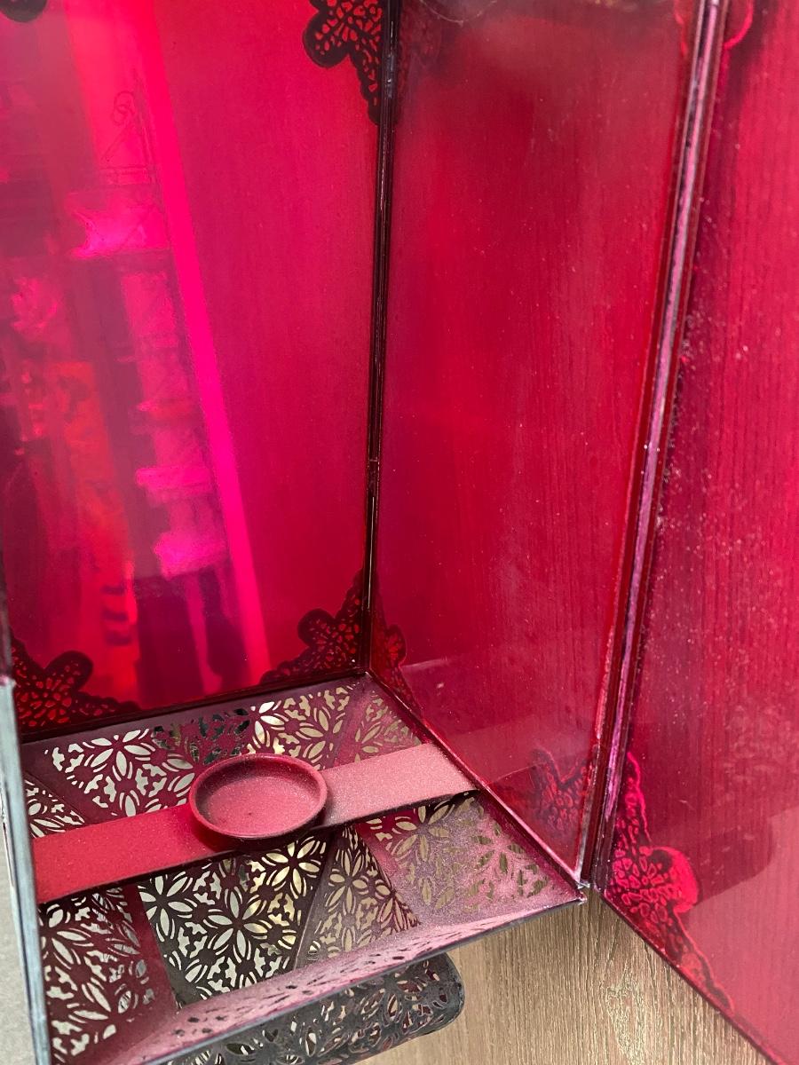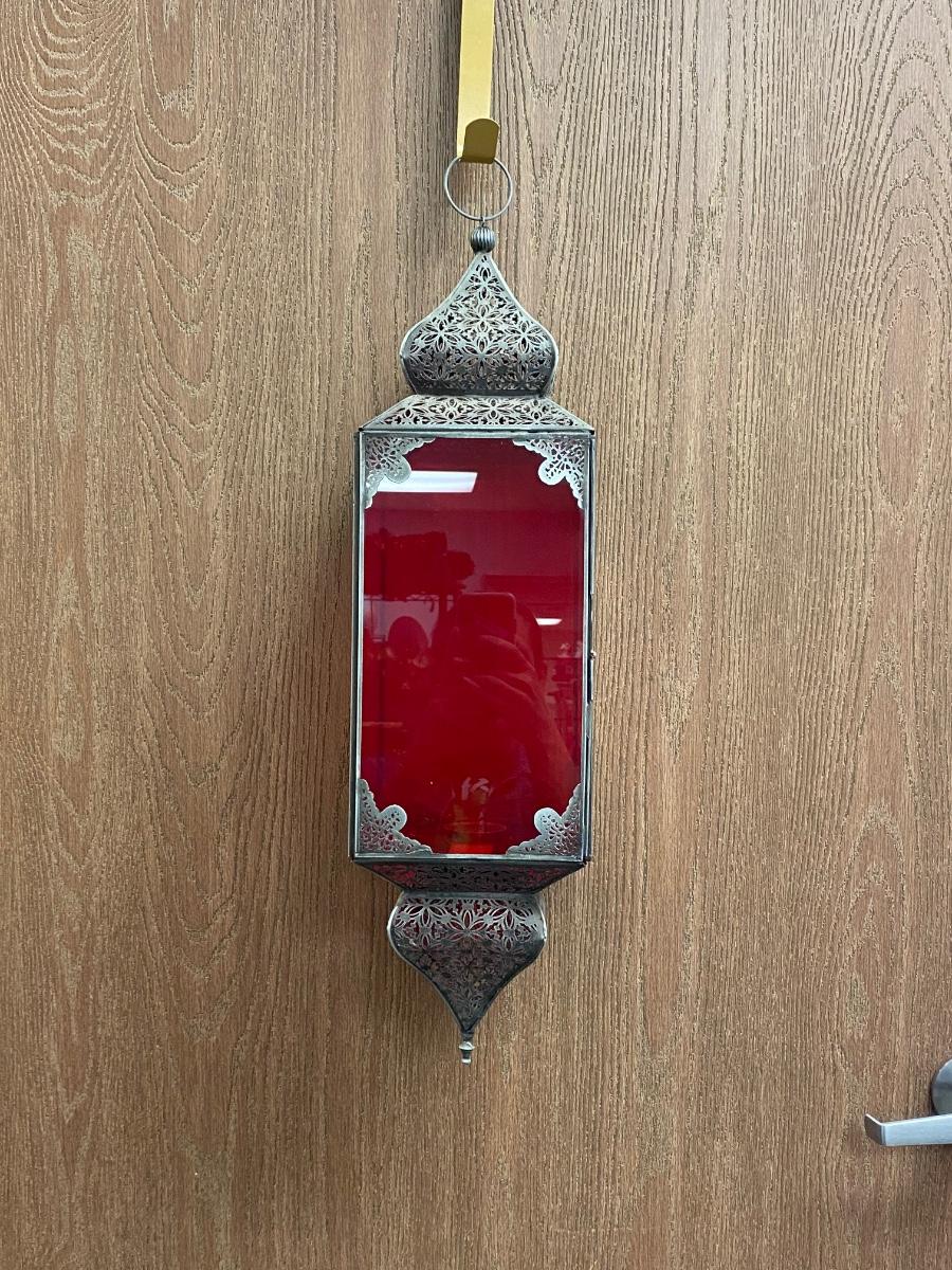 Large Moroccan style candle holding lantern. About 24" length. Silvertone metal with red glass panels, hinged door opens for candle access. Would hold a tealight or votive easily, you could probably put a taller candle in it but it would have to be skinny like a votive. In good condition.