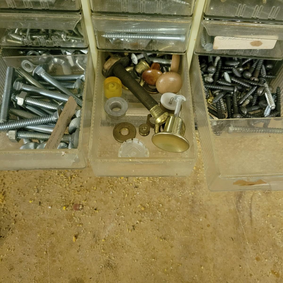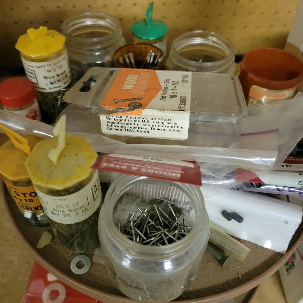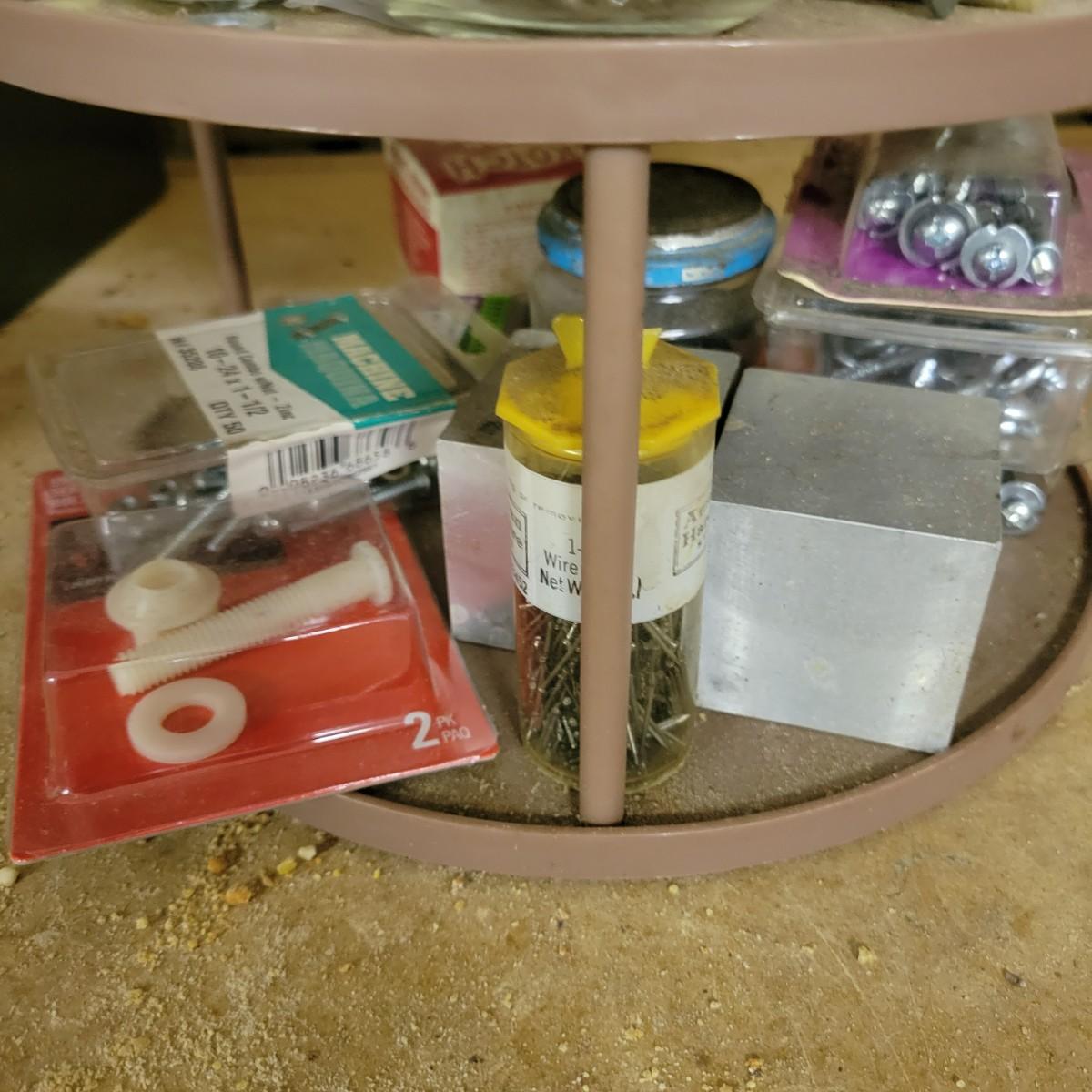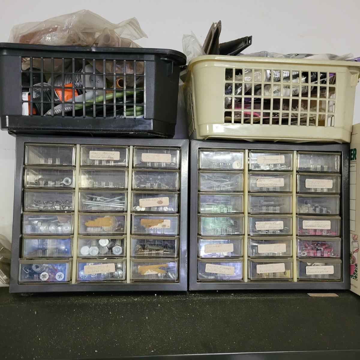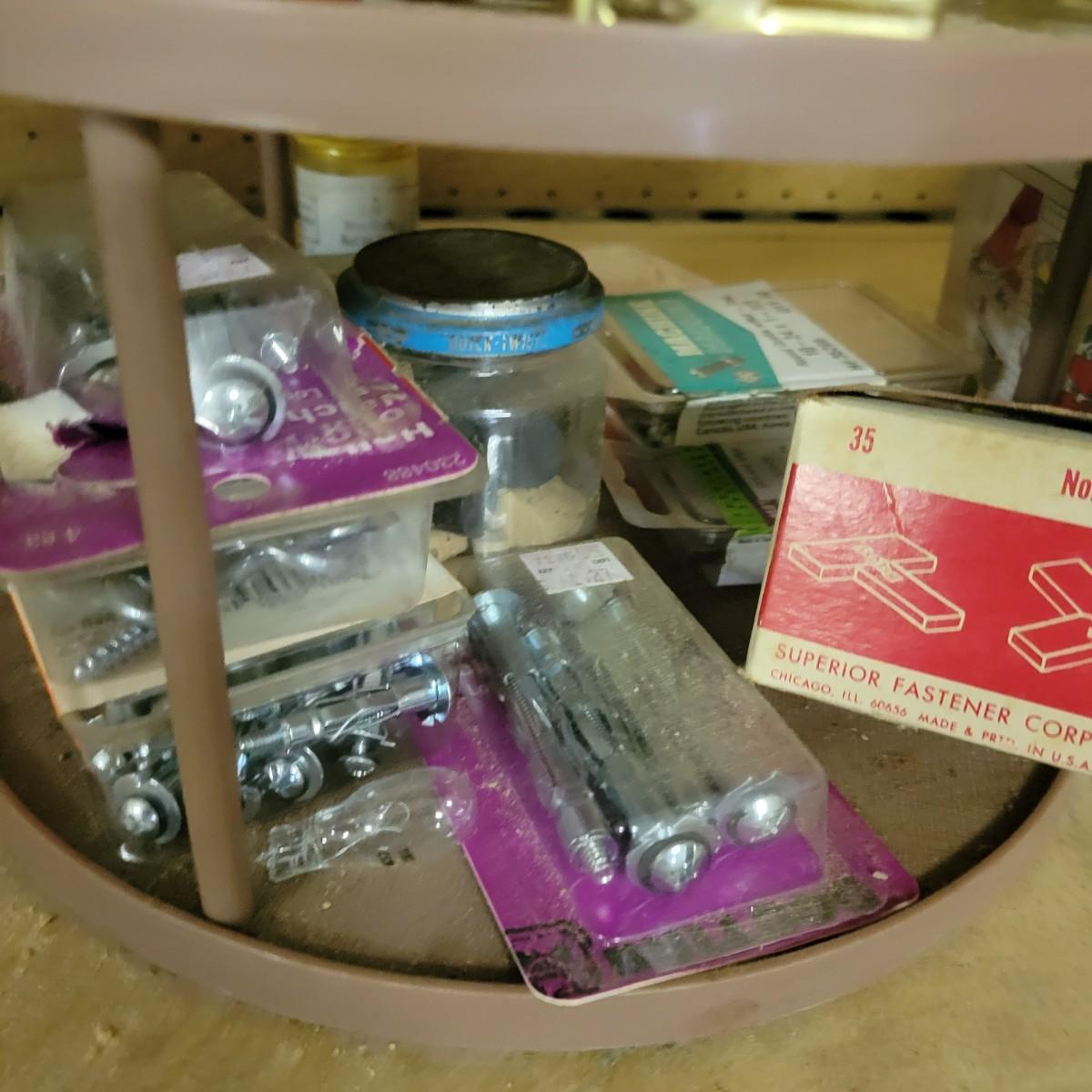 A large assortment of hardware that includes two hill caddies, a two tiered lazy Susan and multiple baskets full of odds and ends. Lot includes various fastners, screws, tape and so much more. See attached photos for full inventory. Caddies measure approximately 10" x 6" x 9.5"H. Local pickup only