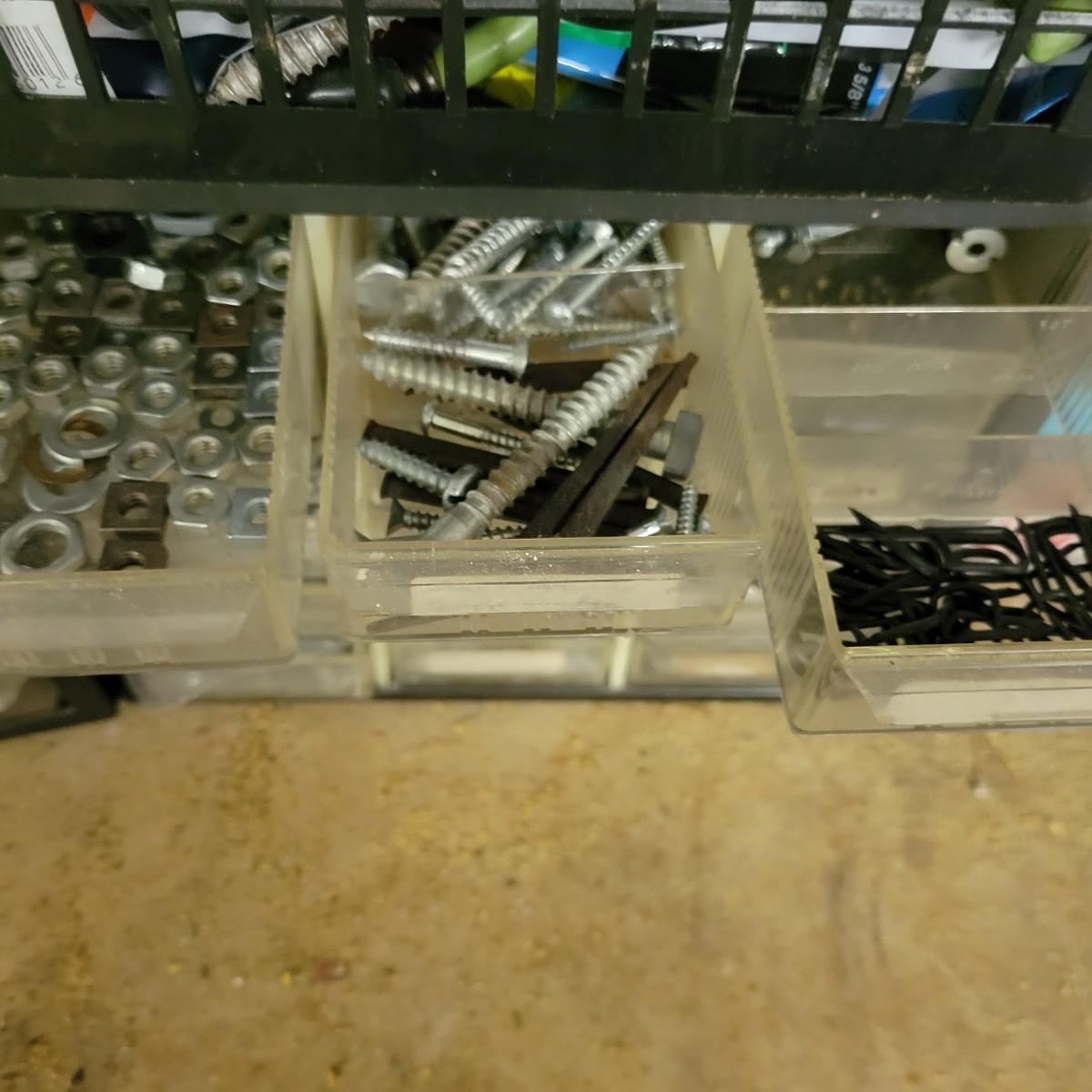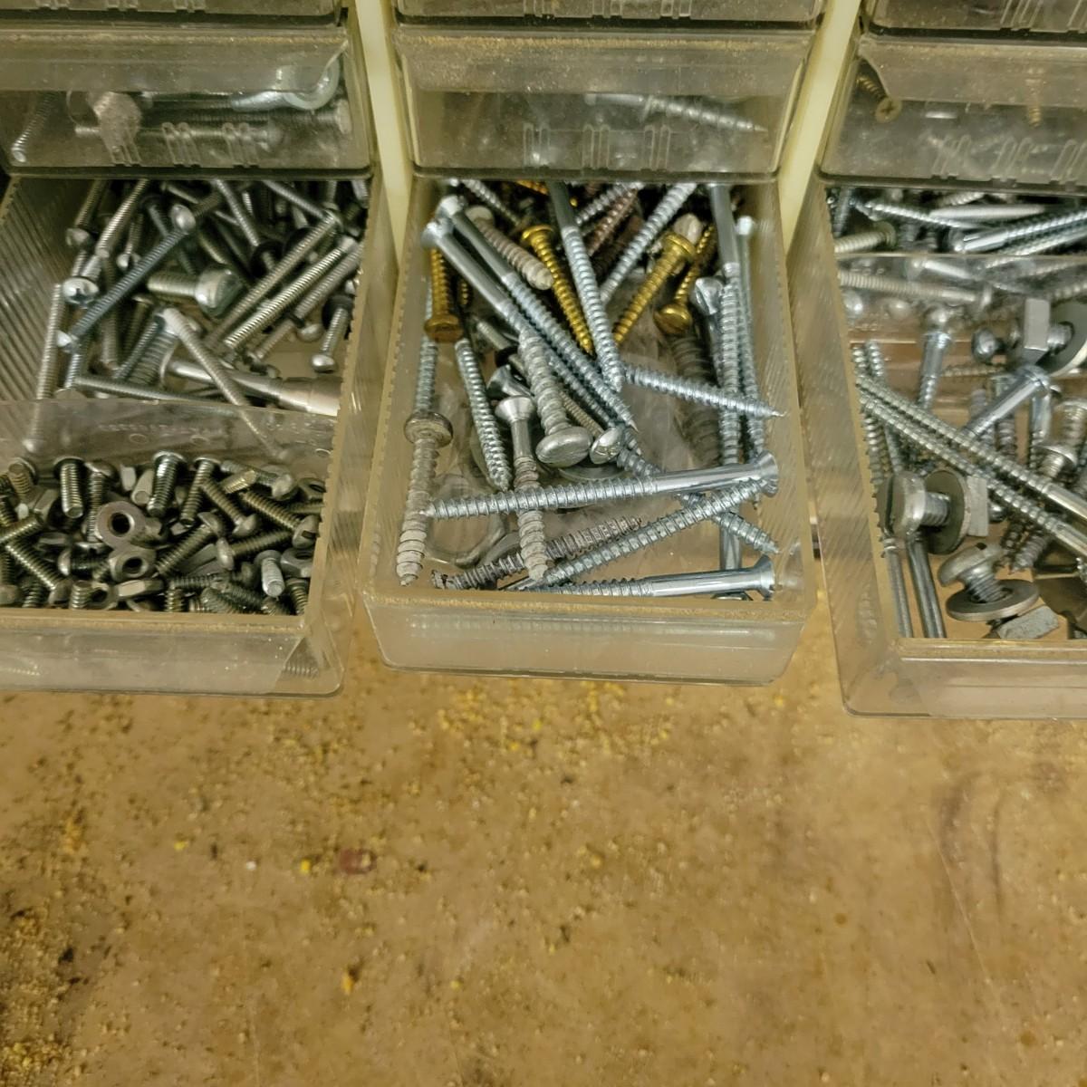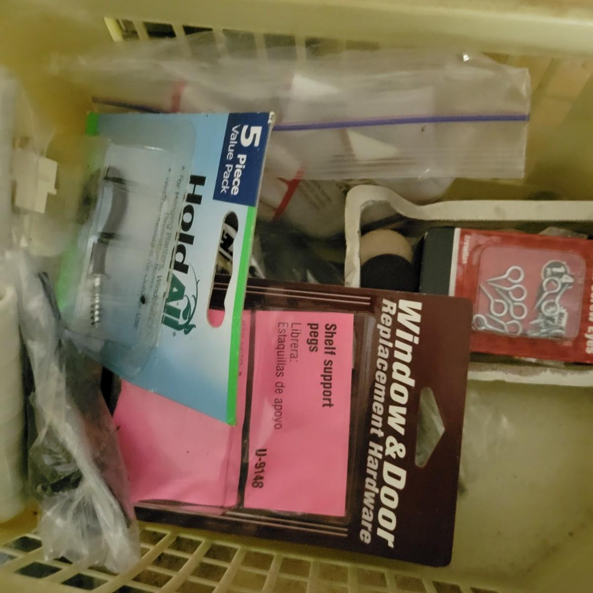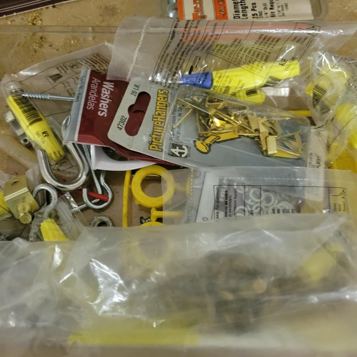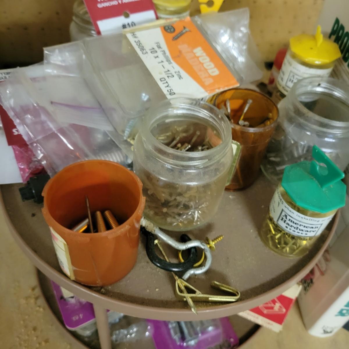 A large assortment of hardware that includes two hill caddies, a two tiered lazy Susan and multiple baskets full of odds and ends. Lot includes various fastners, screws, tape and so much more. See attached photos for full inventory. Caddies measure approximately 10" x 6" x 9.5"H. Local pickup only