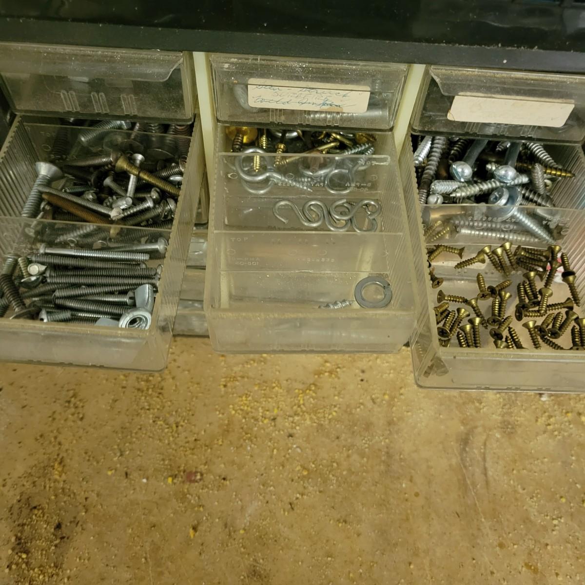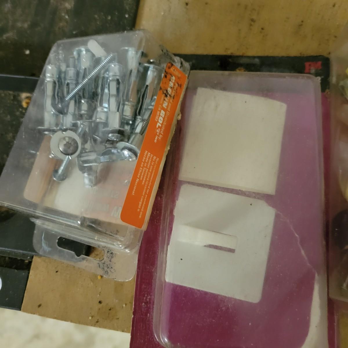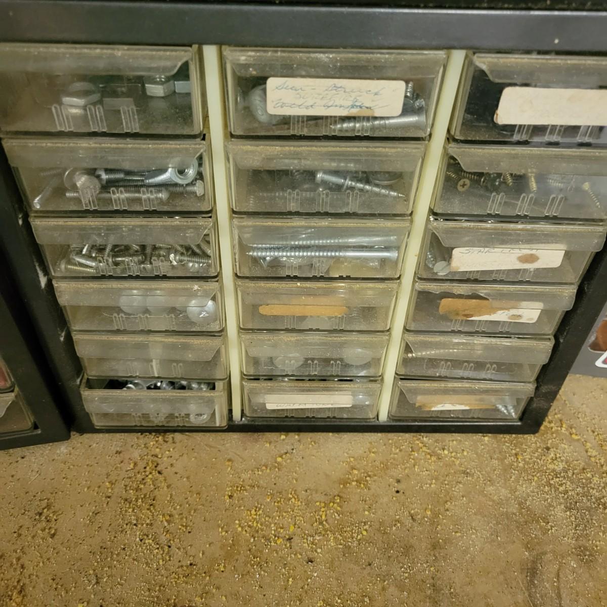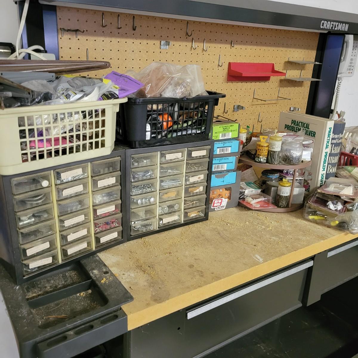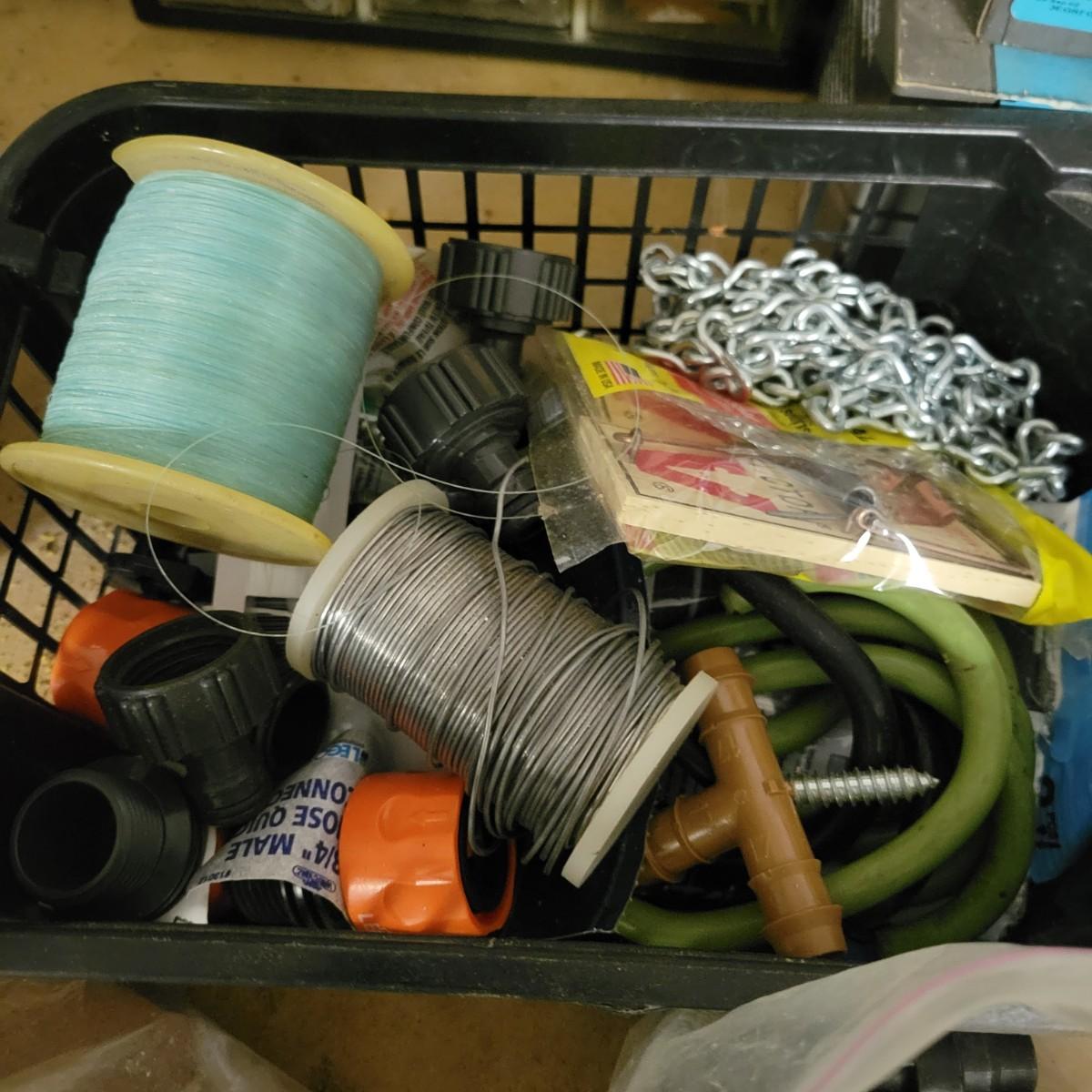 A large assortment of hardware that includes two hill caddies, a two tiered lazy Susan and multiple baskets full of odds and ends. Lot includes various fastners, screws, tape and so much more. See attached photos for full inventory. Caddies measure approximately 10" x 6" x 9.5"H. Local pickup only