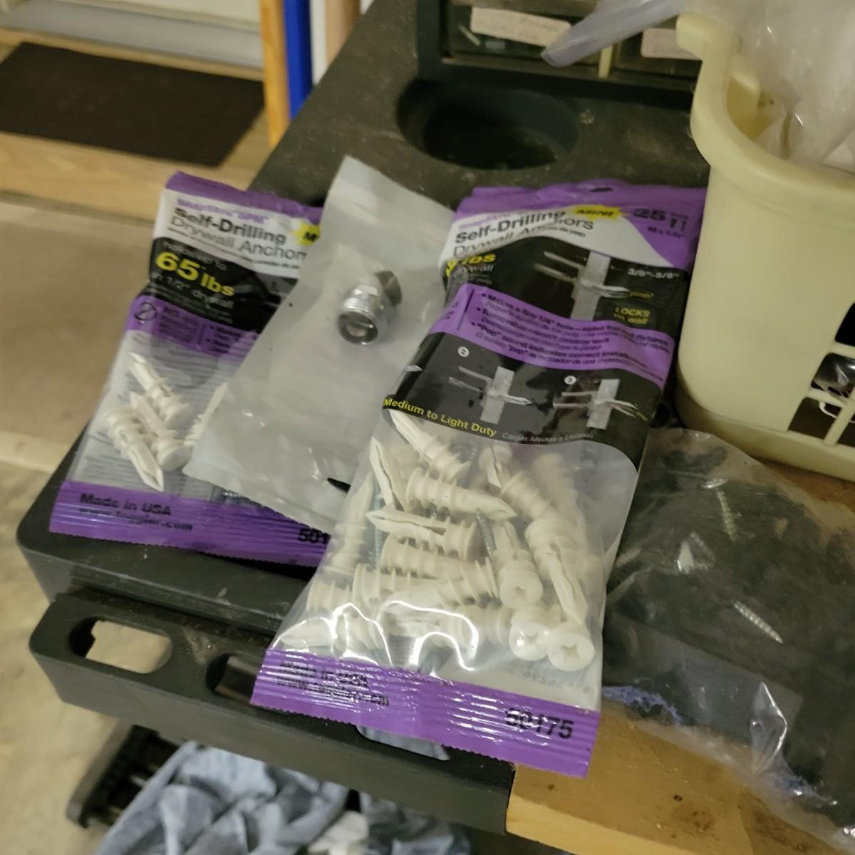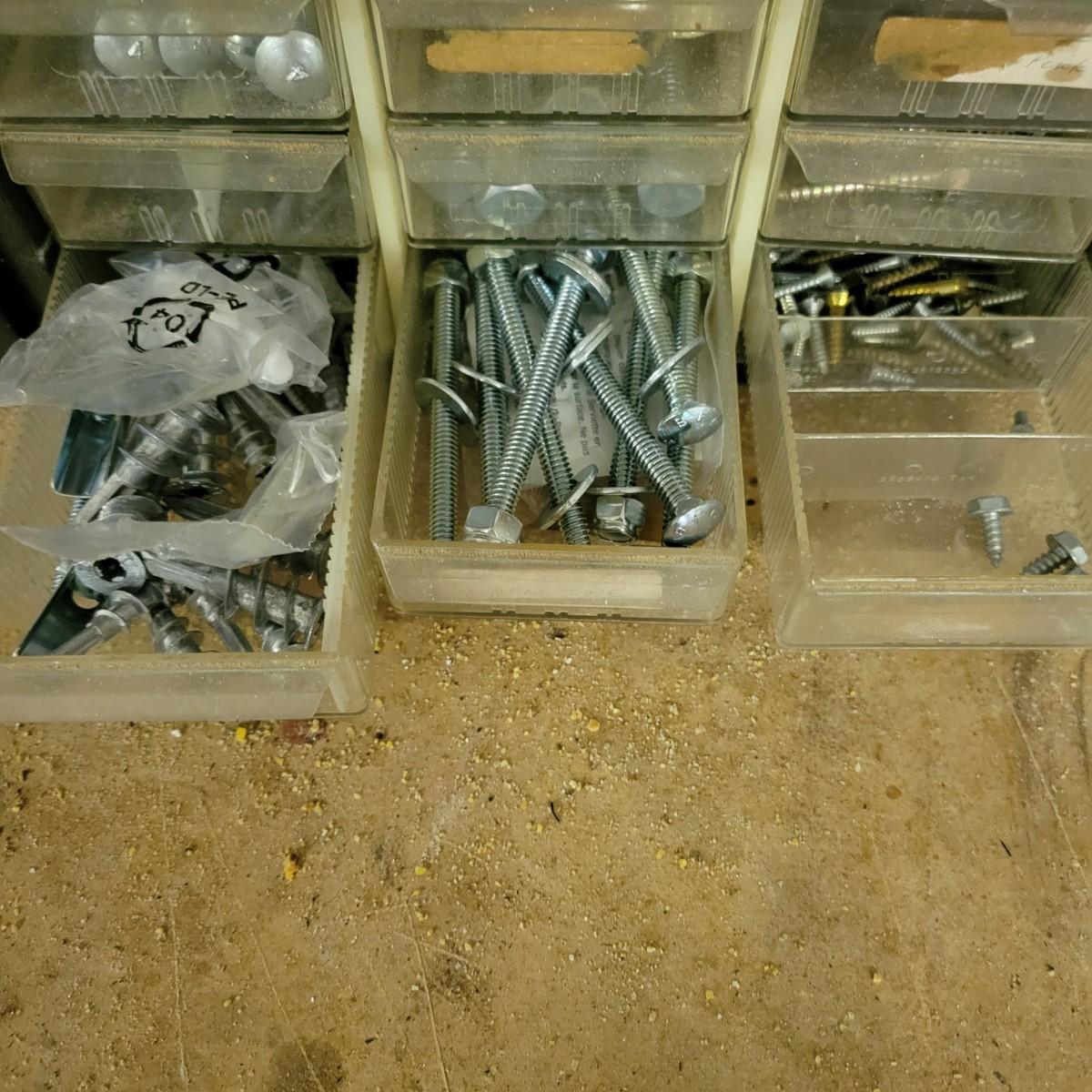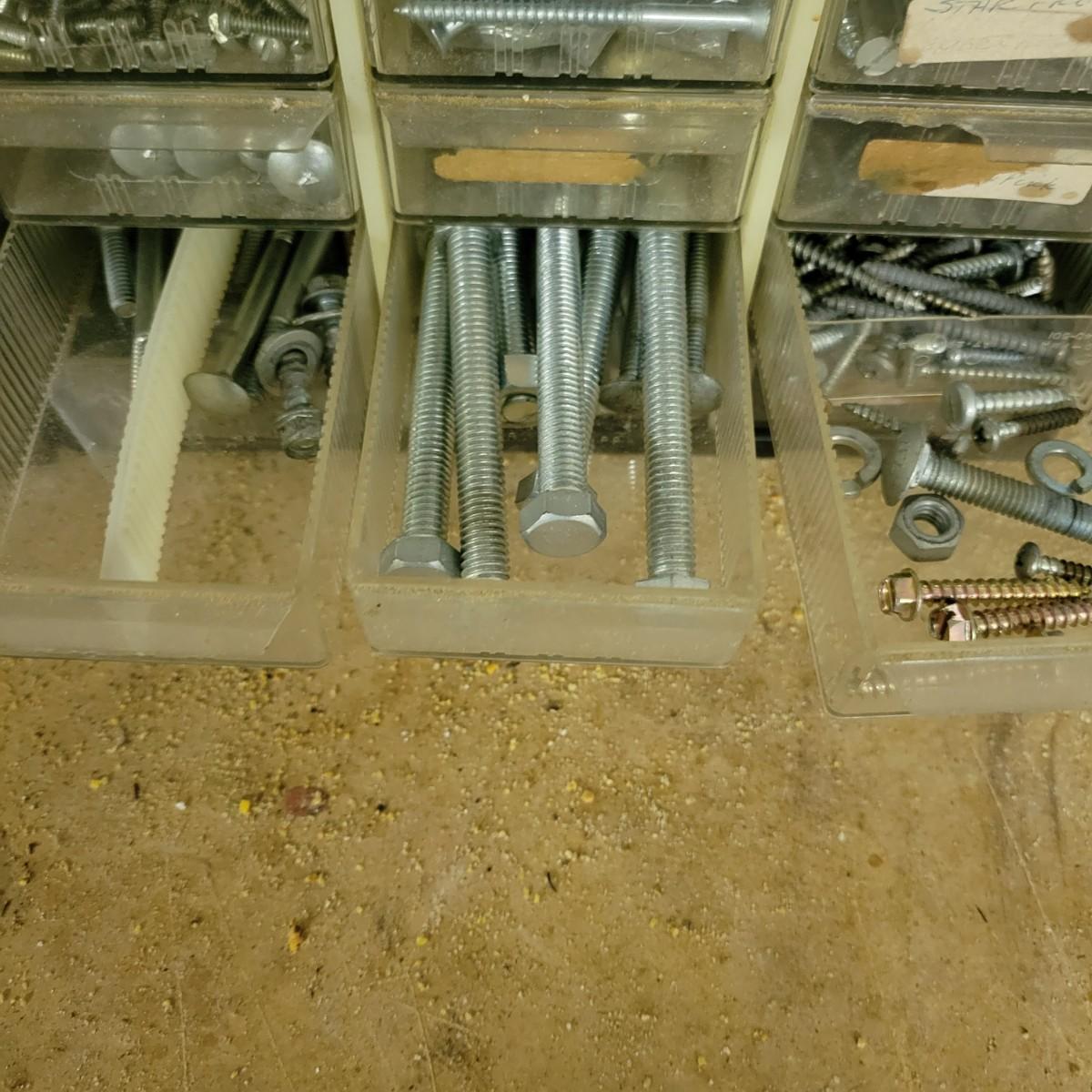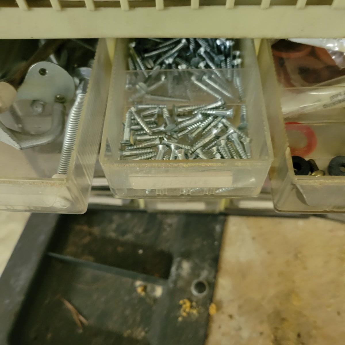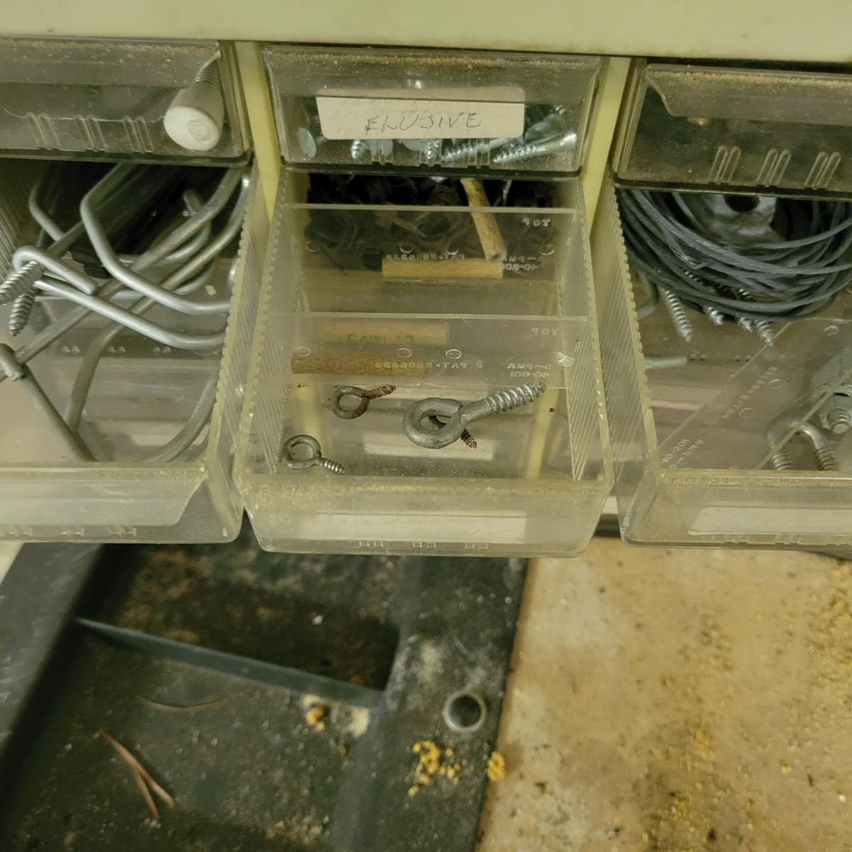 A large assortment of hardware that includes two hill caddies, a two tiered lazy Susan and multiple baskets full of odds and ends. Lot includes various fastners, screws, tape and so much more. See attached photos for full inventory. Caddies measure approximately 10" x 6" x 9.5"H. Local pickup only