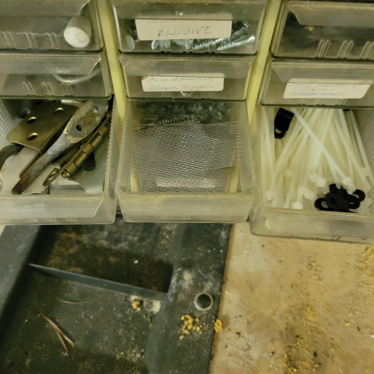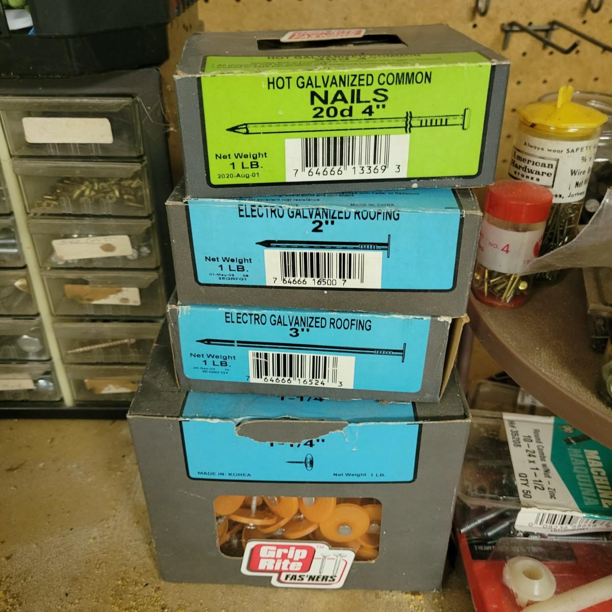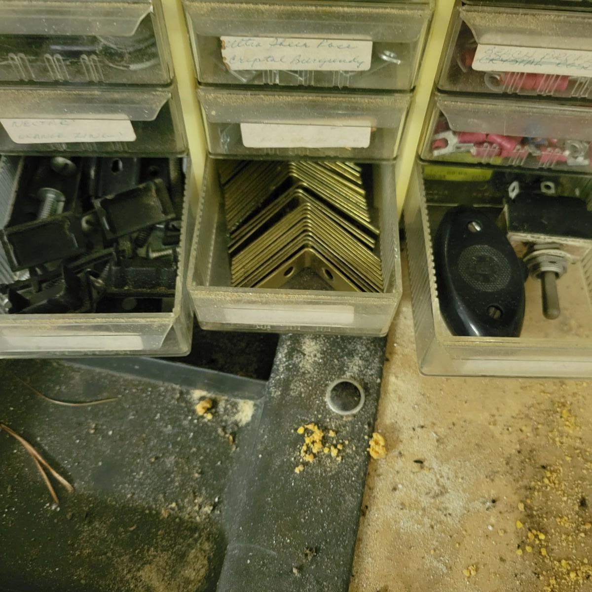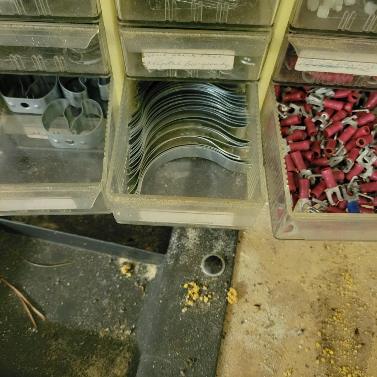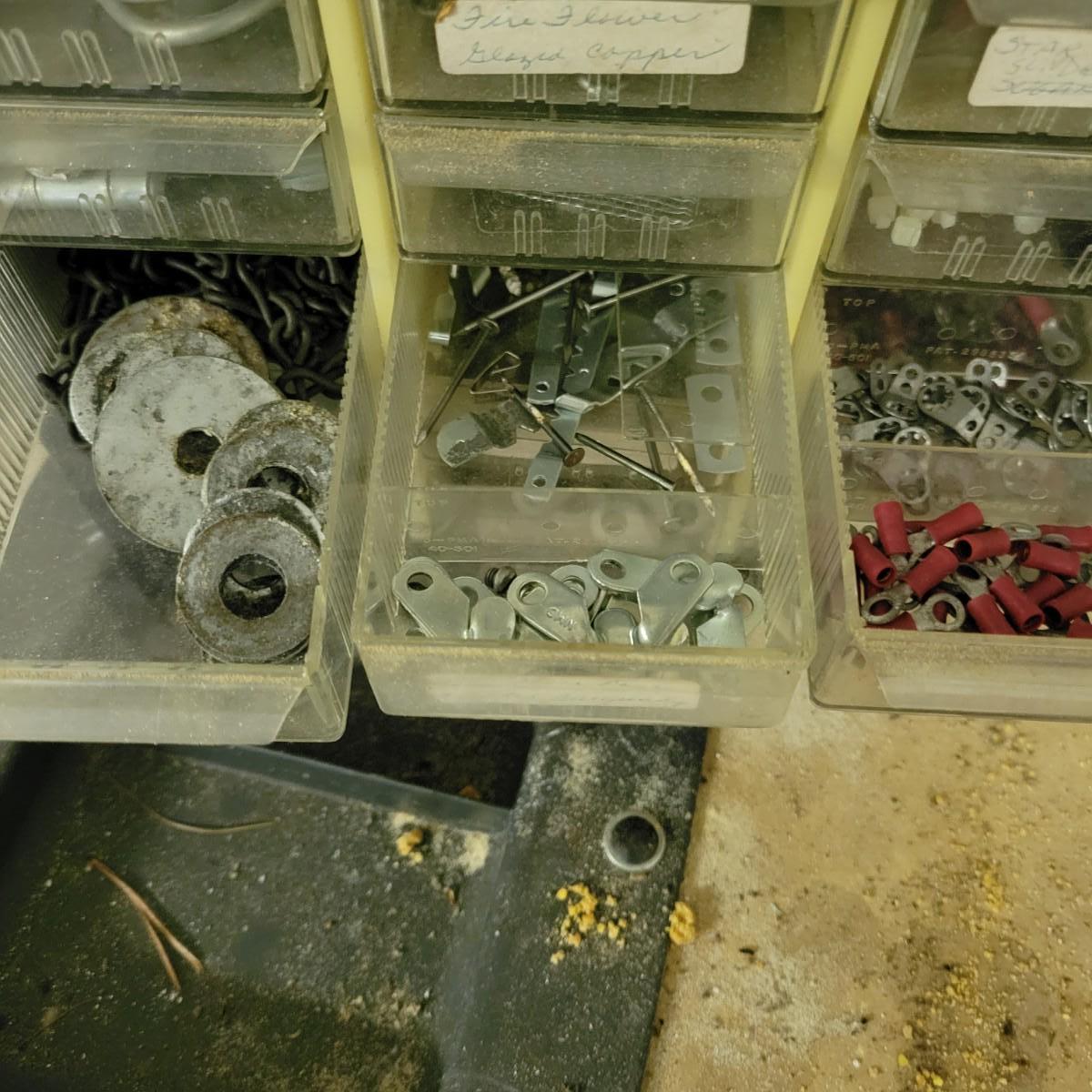 A large assortment of hardware that includes two hill caddies, a two tiered lazy Susan and multiple baskets full of odds and ends. Lot includes various fastners, screws, tape and so much more. See attached photos for full inventory. Caddies measure approximately 10" x 6" x 9.5"H. Local pickup only