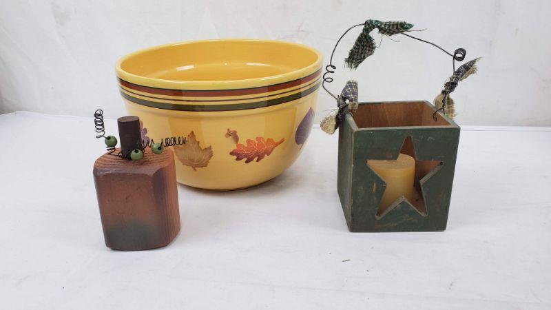 Large Harvest Bowl, Small Wooden Pumpkin, & Wood Star Candle Holder