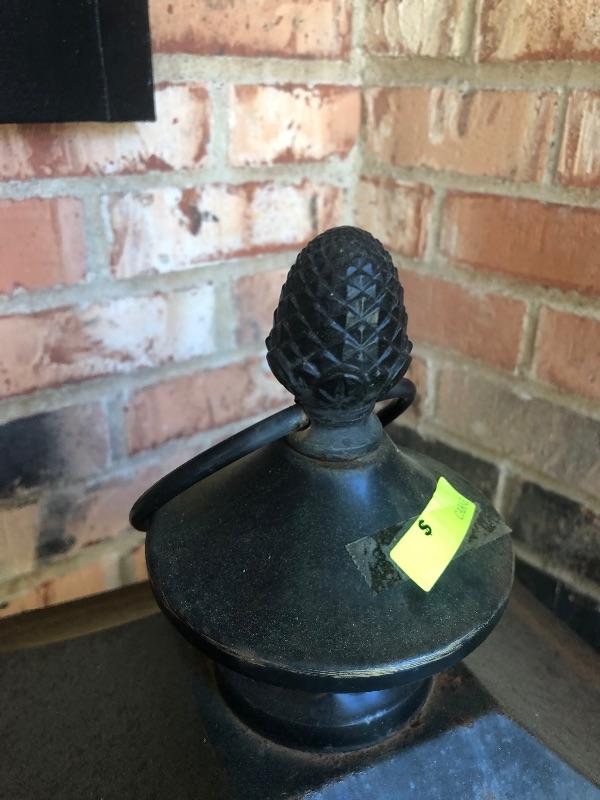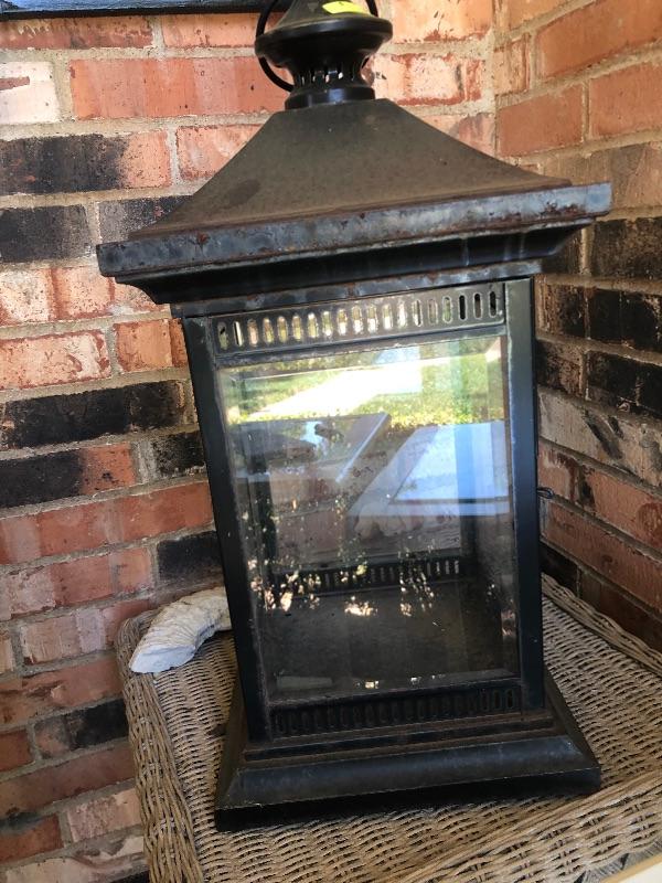 Heavy outdoor lantern made of metal and glass with decorative top know