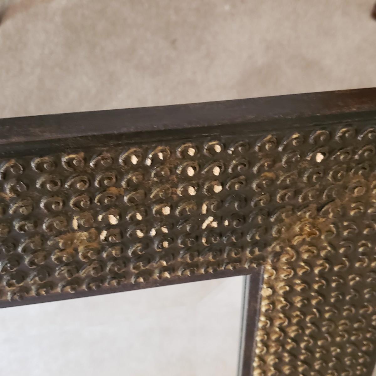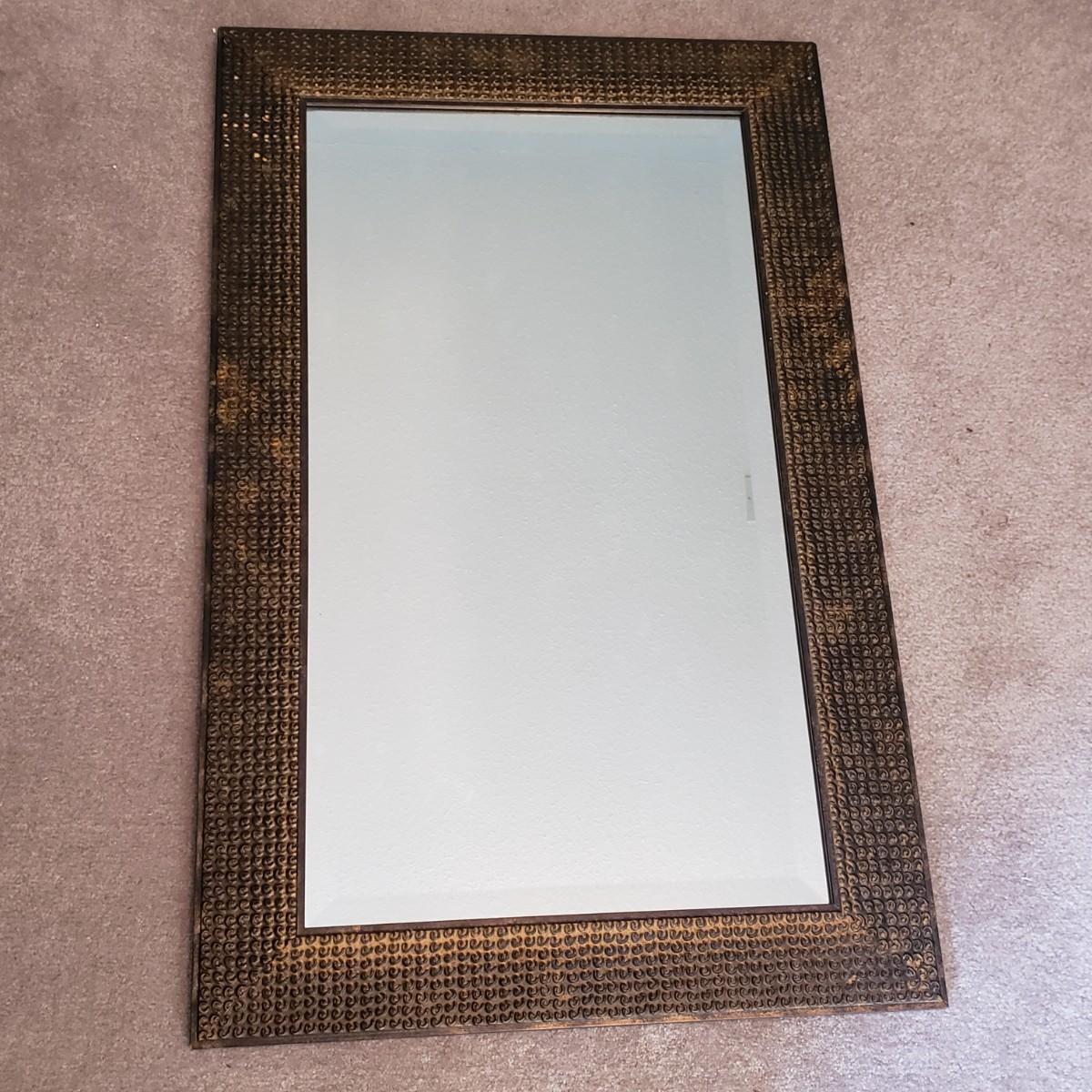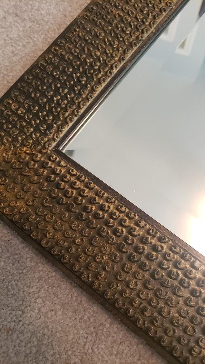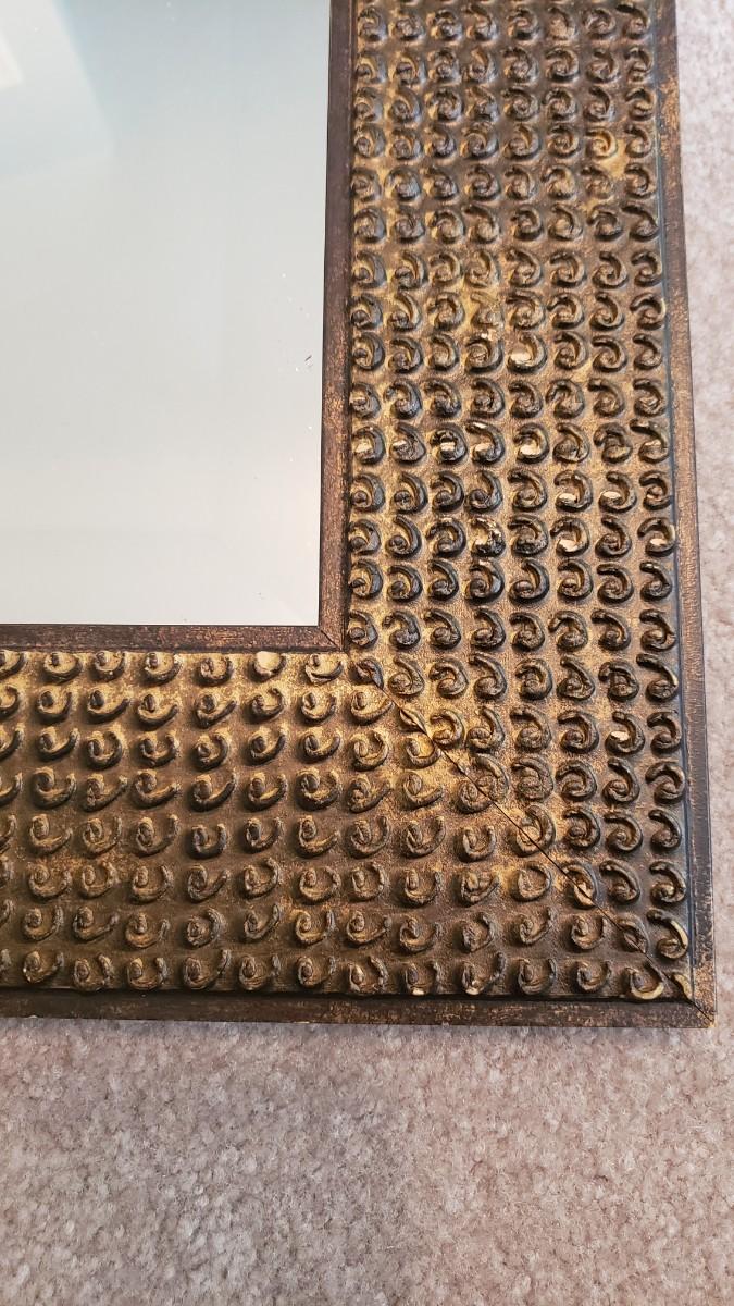 This large, rather heavy mirror measures 24" x 39"H. The mirror is beveled around the edges. The raised wooden frame features small decorative scrolls. One corner of the scrolls have chipping, see picture.