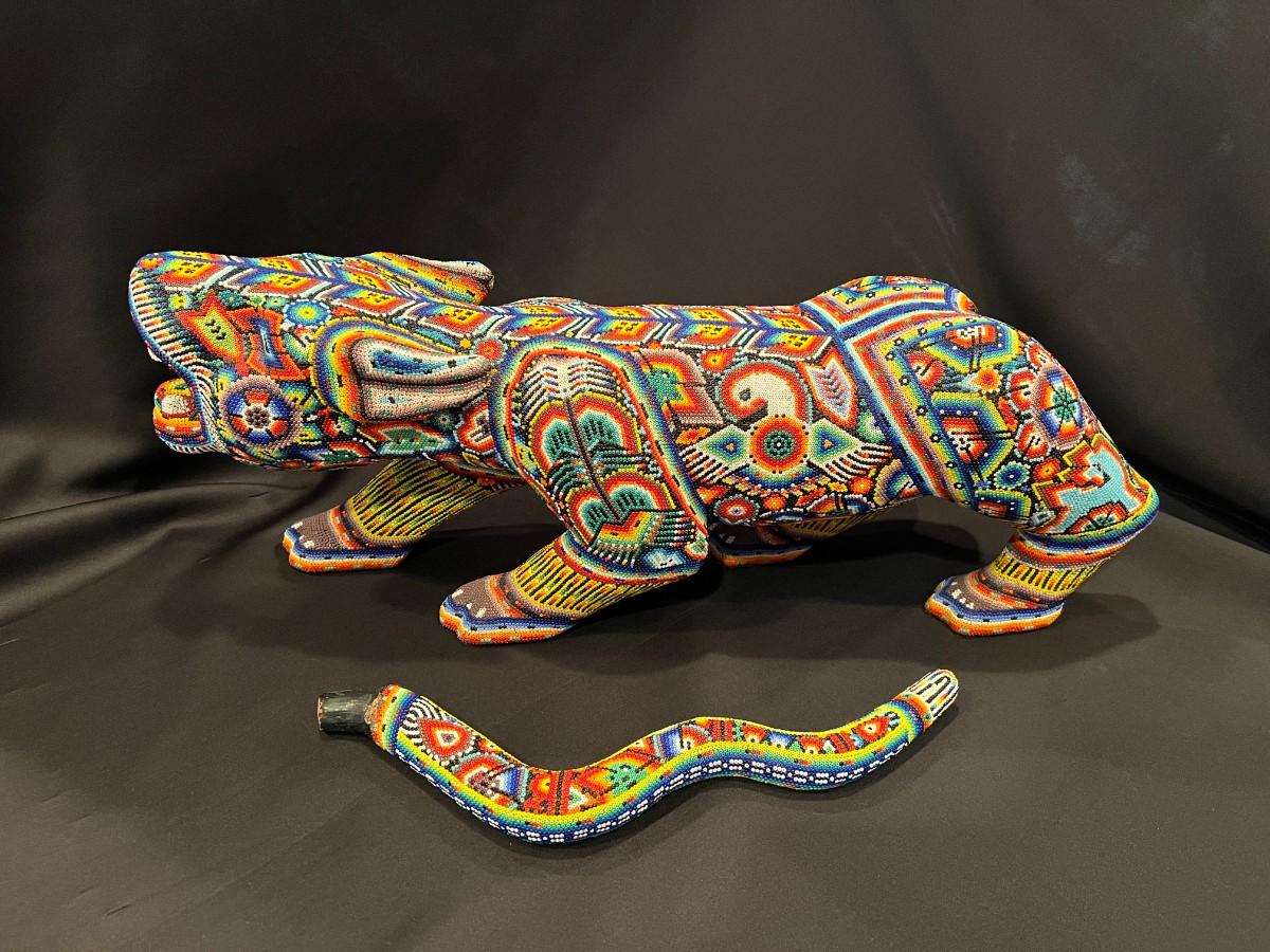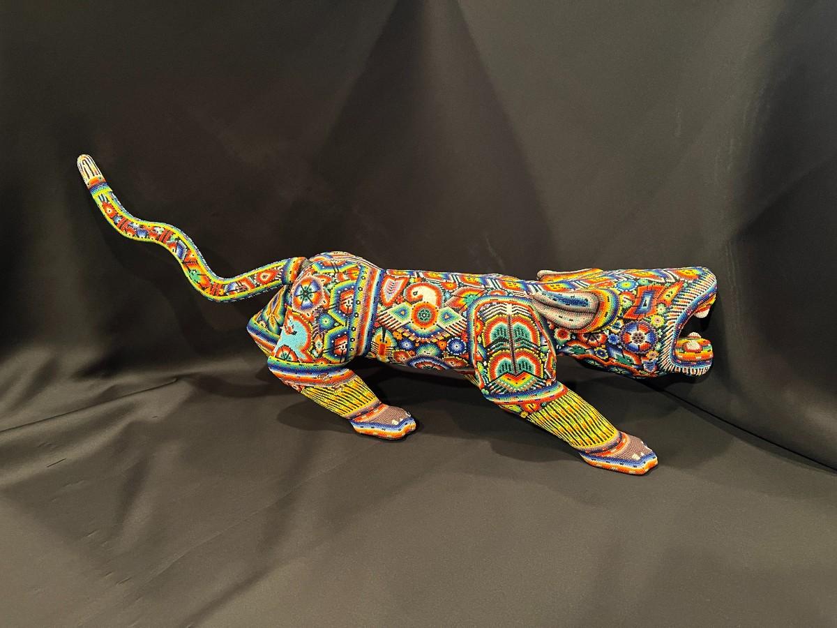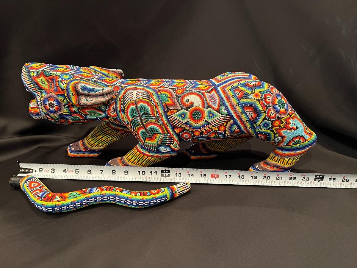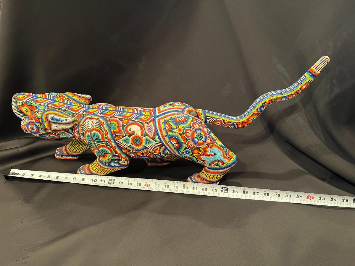 Vibrant extra large Huichol indigenous Mexico Native American beaded art statue. Spectacular color and detail in the beading. The body of the jaguar measures 24 inches and the tail is 14 inches on its own; attached the full figurine measures 34 inches. Very good condition, with a few places where beads have worn off (shown in photos).