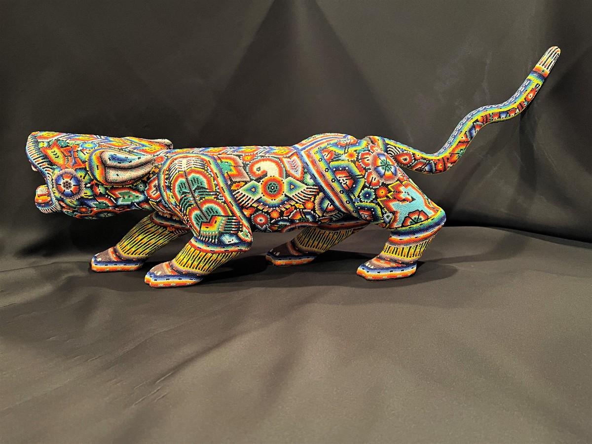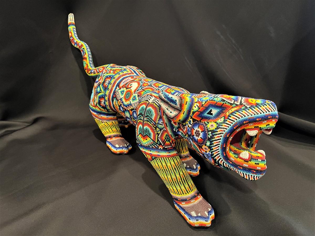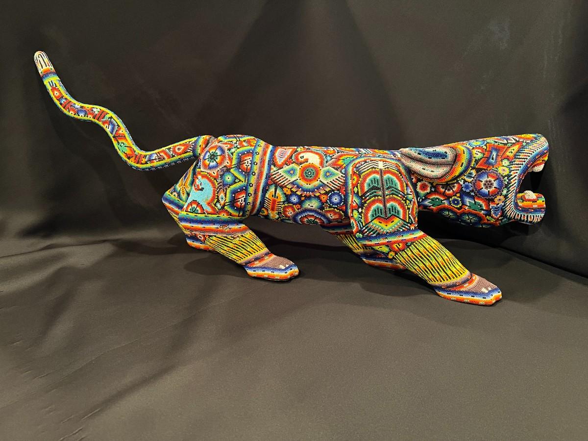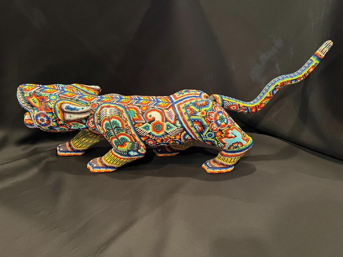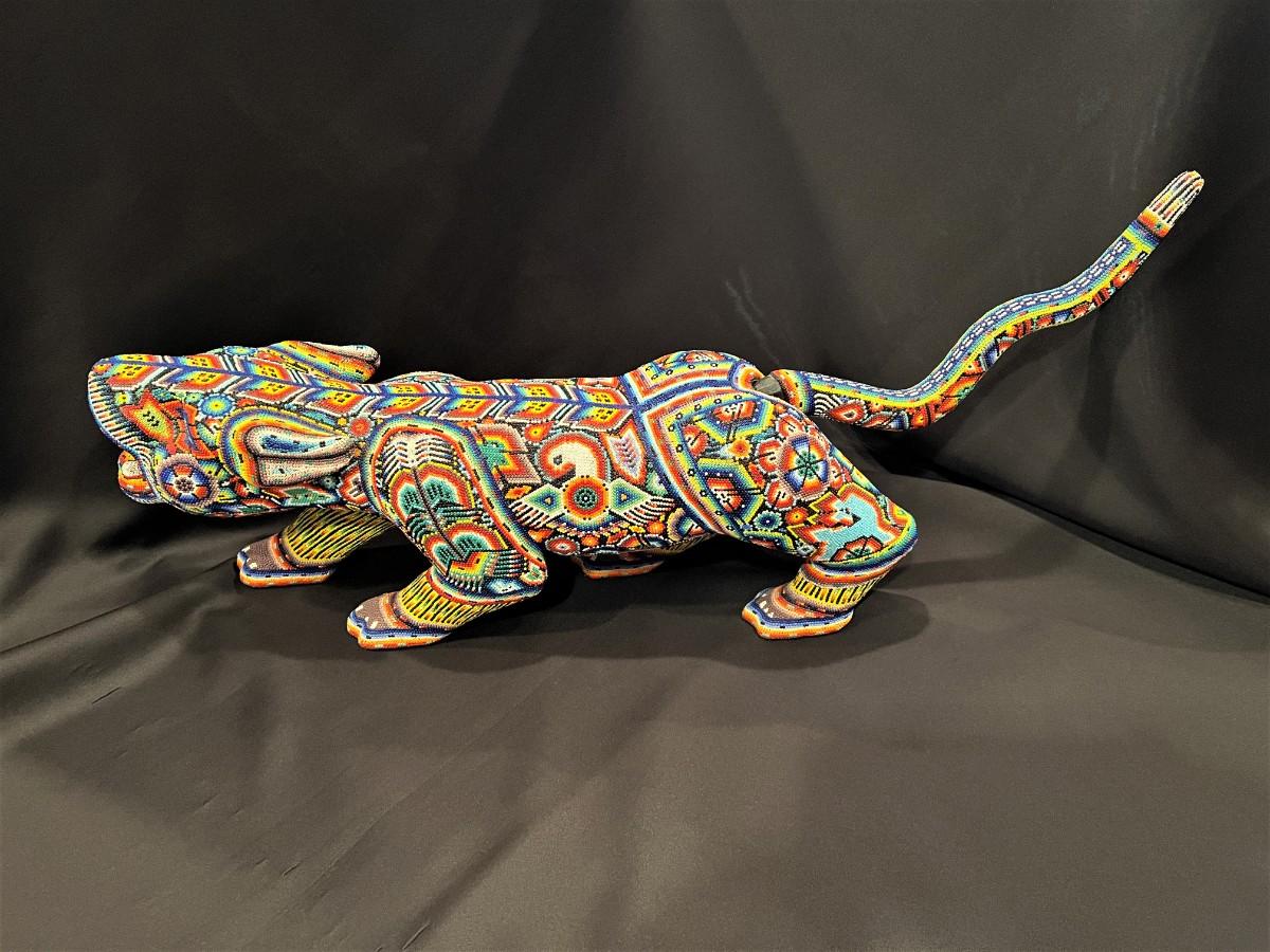 Vibrant extra large Huichol indigenous Mexico Native American beaded art statue. Spectacular color and detail in the beading. The body of the jaguar measures 24 inches and the tail is 14 inches on its own; attached the full figurine measures 34 inches. Very good condition, with a few places where beads have worn off (shown in photos).
