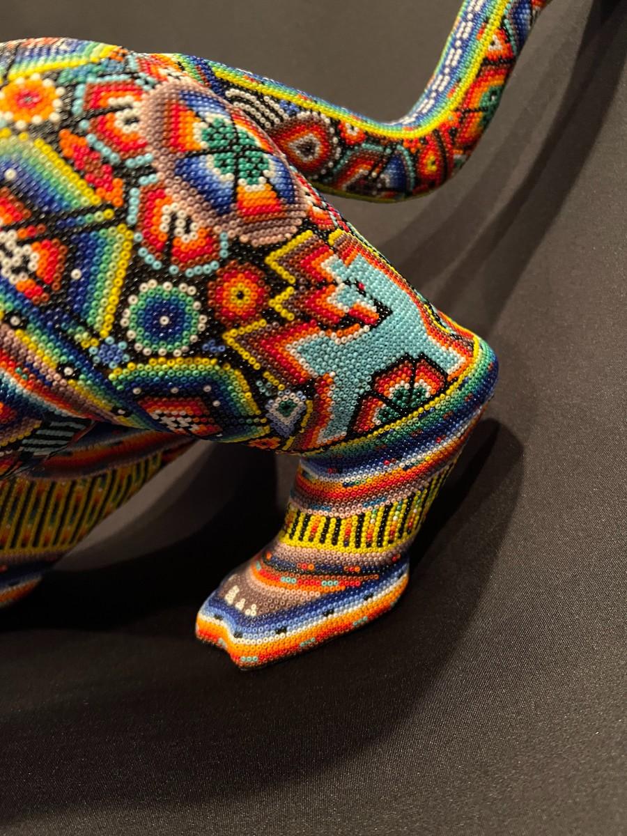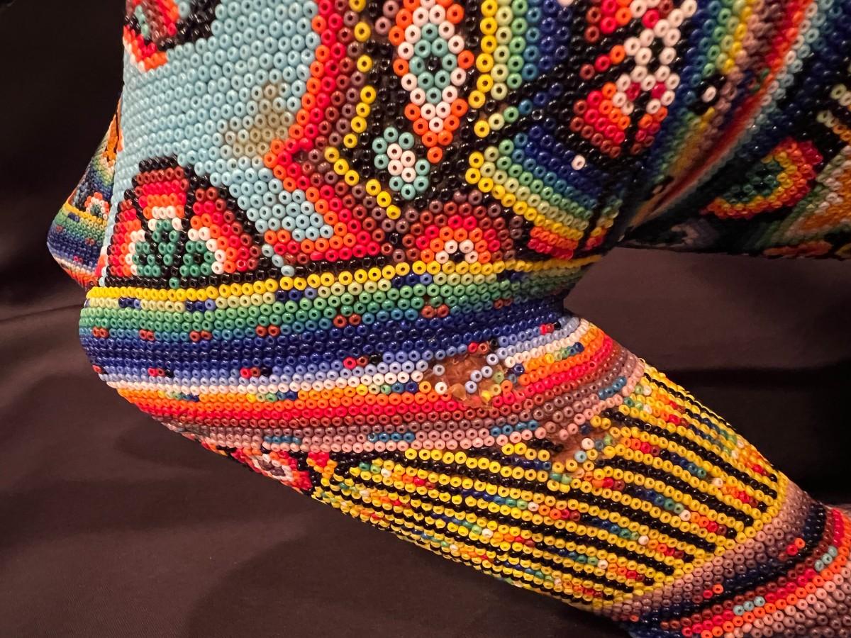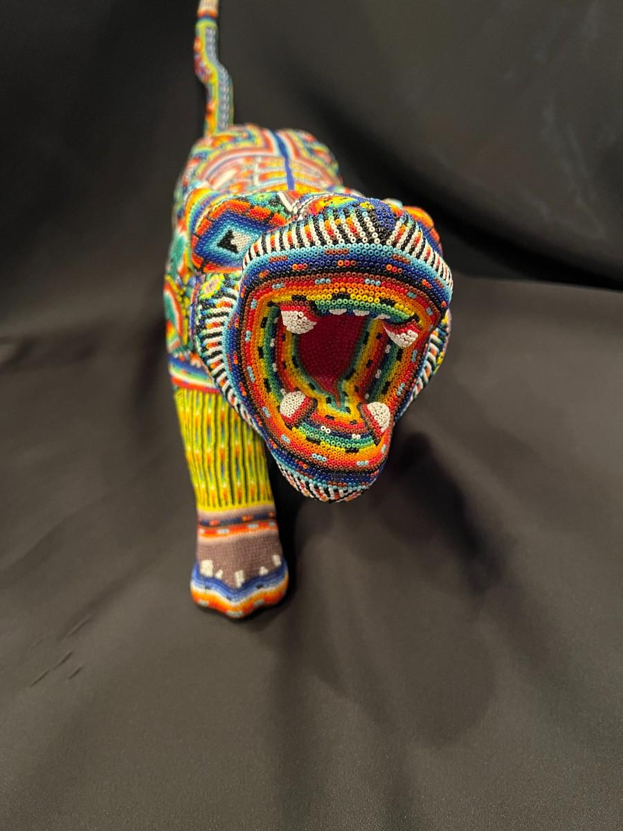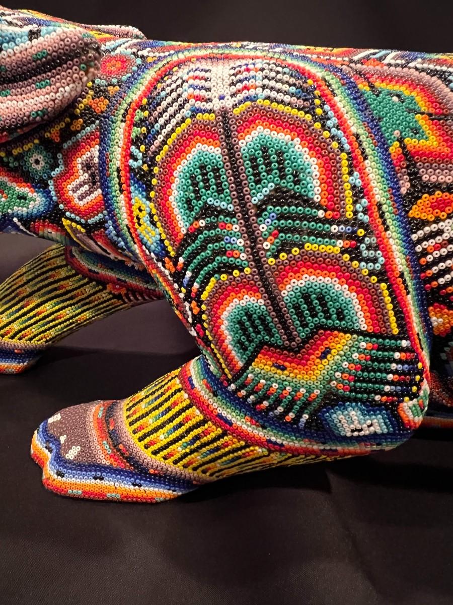 Vibrant extra large Huichol indigenous Mexico Native American beaded art statue. Spectacular color and detail in the beading. The body of the jaguar measures 24 inches and the tail is 14 inches on its own; attached the full figurine measures 34 inches. Very good condition, with a few places where beads have worn off (shown in photos).