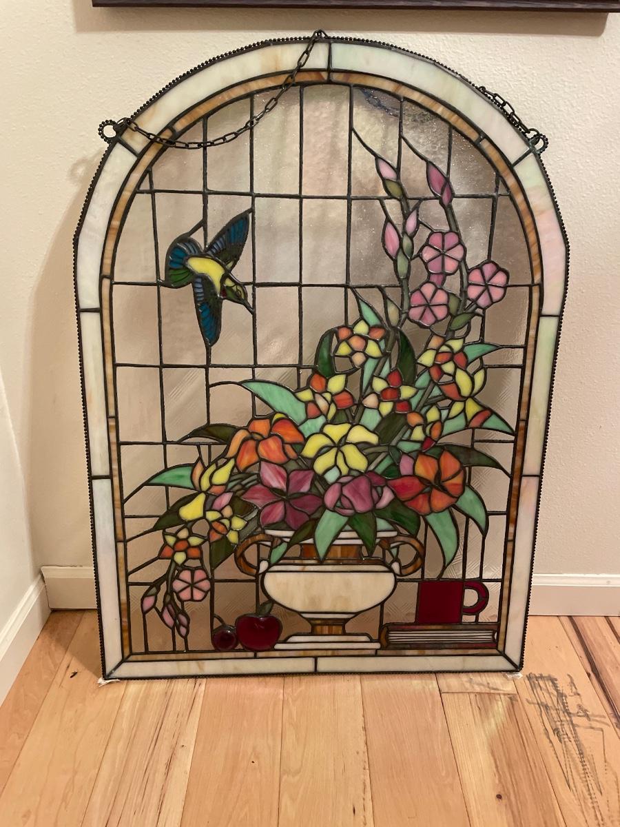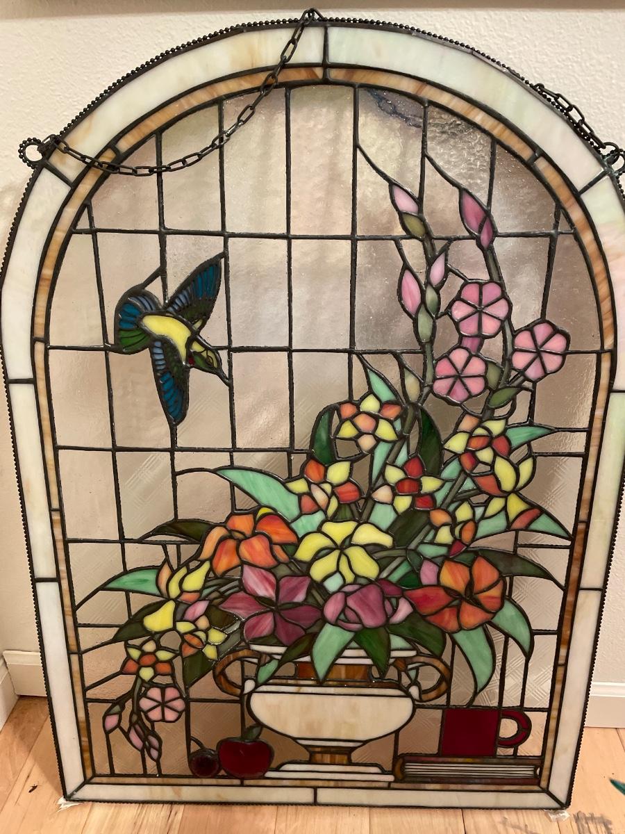 Large hummingbird with flowers stained glass & small glass hummingbird