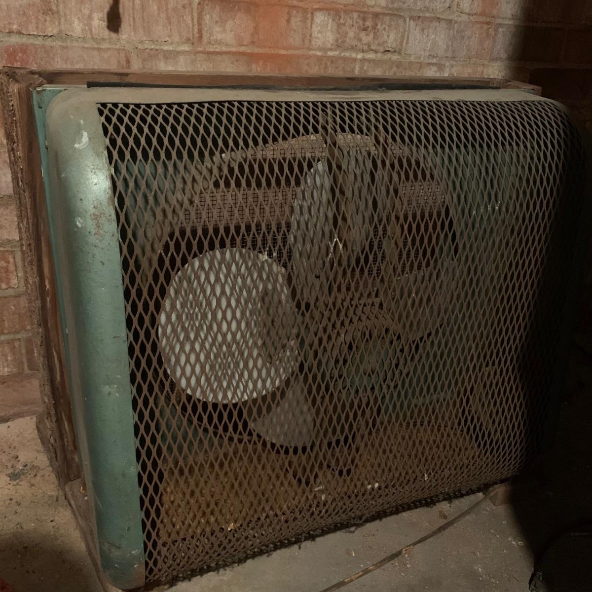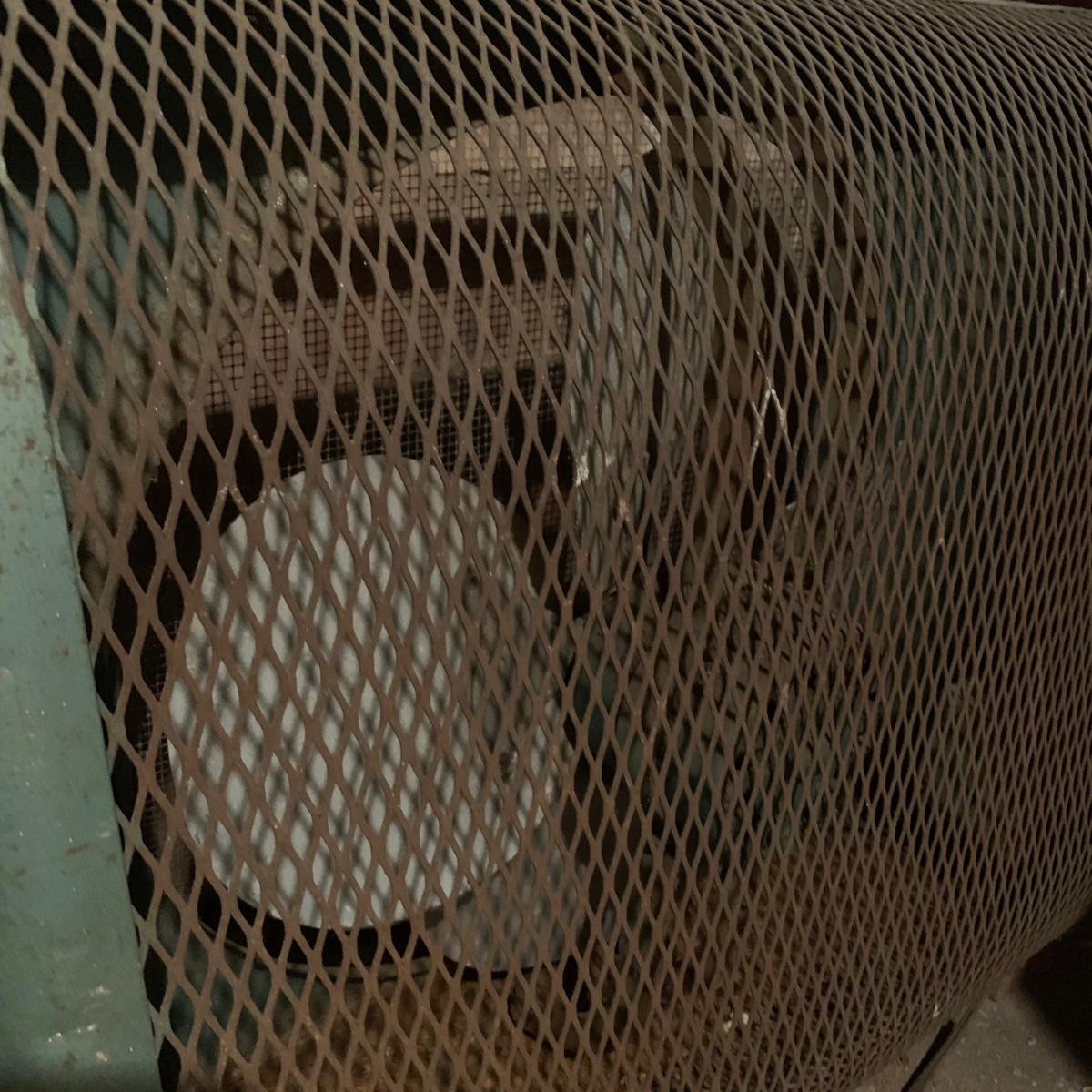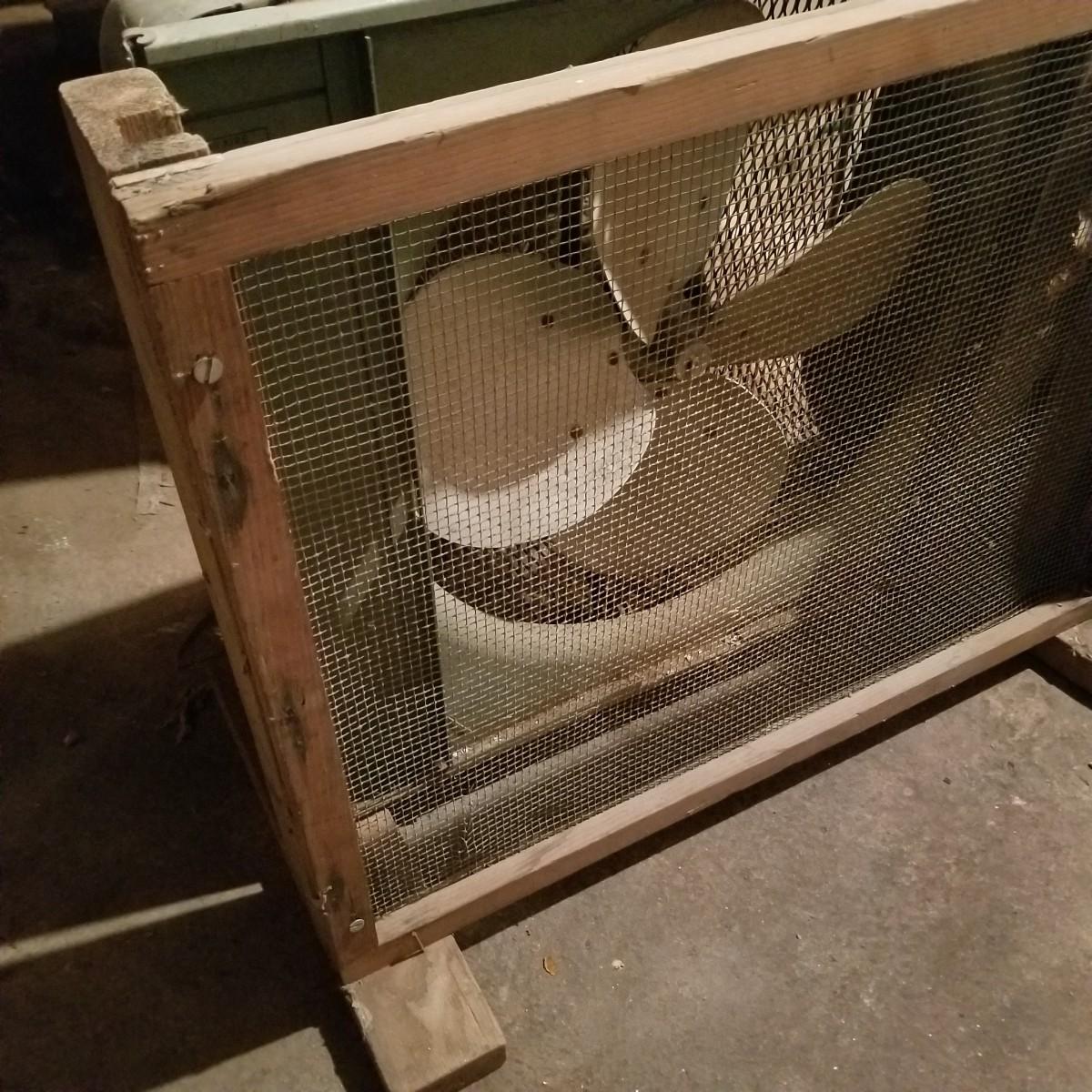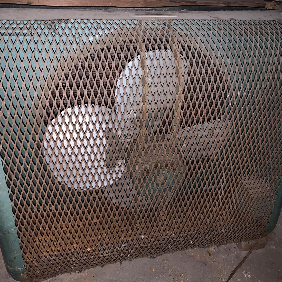 This lot includes one large metal fan. The fan is in fair condition as the metal is rusting and the wood attachment is slightly wobbly. The cord is also a bit rusted (see photos). Cannot confirm the fan works. The fan is loosely attached to a wood base and can separate into two pieces. The fan is heavy. It measures about 32in x 13in x 27in. Local pickup only.