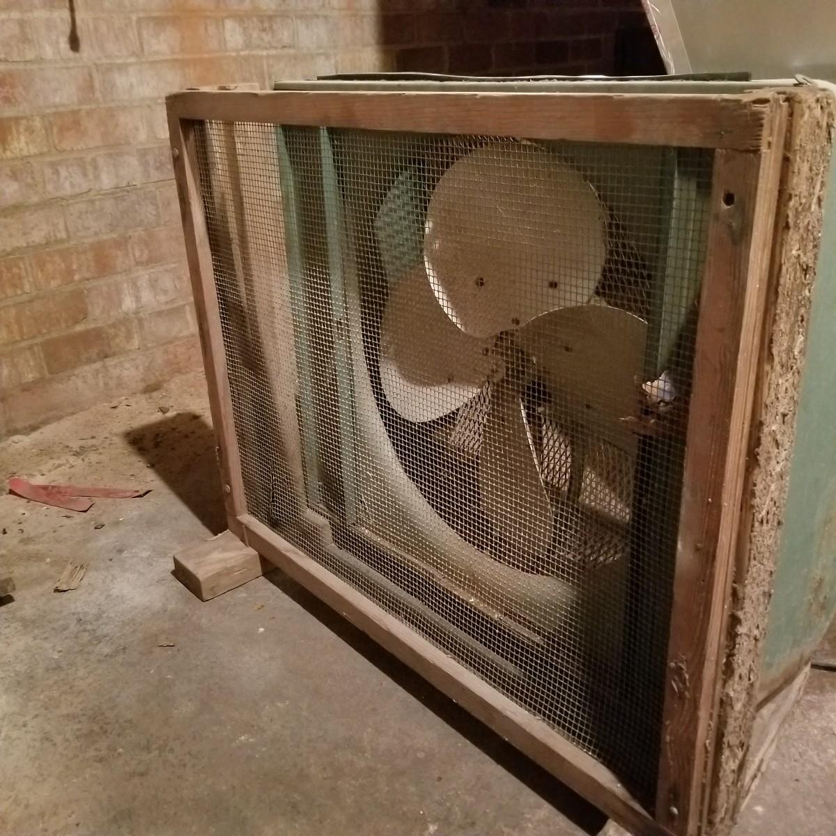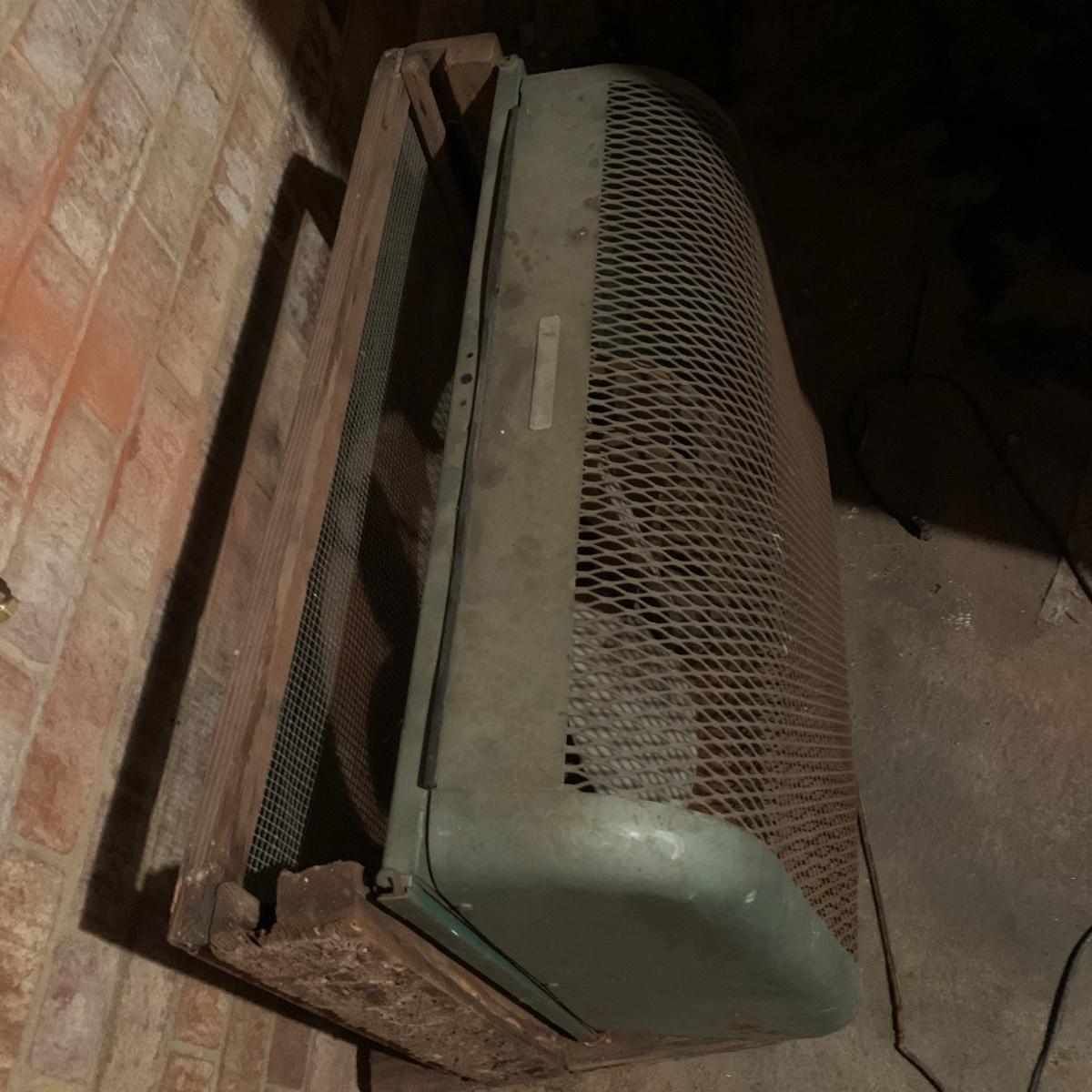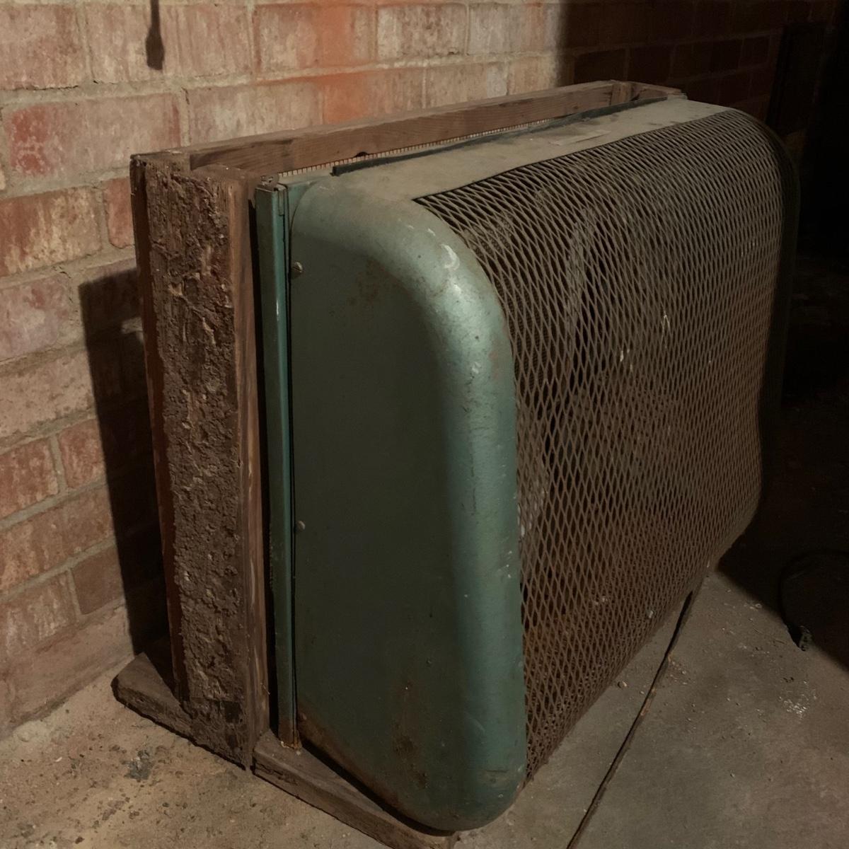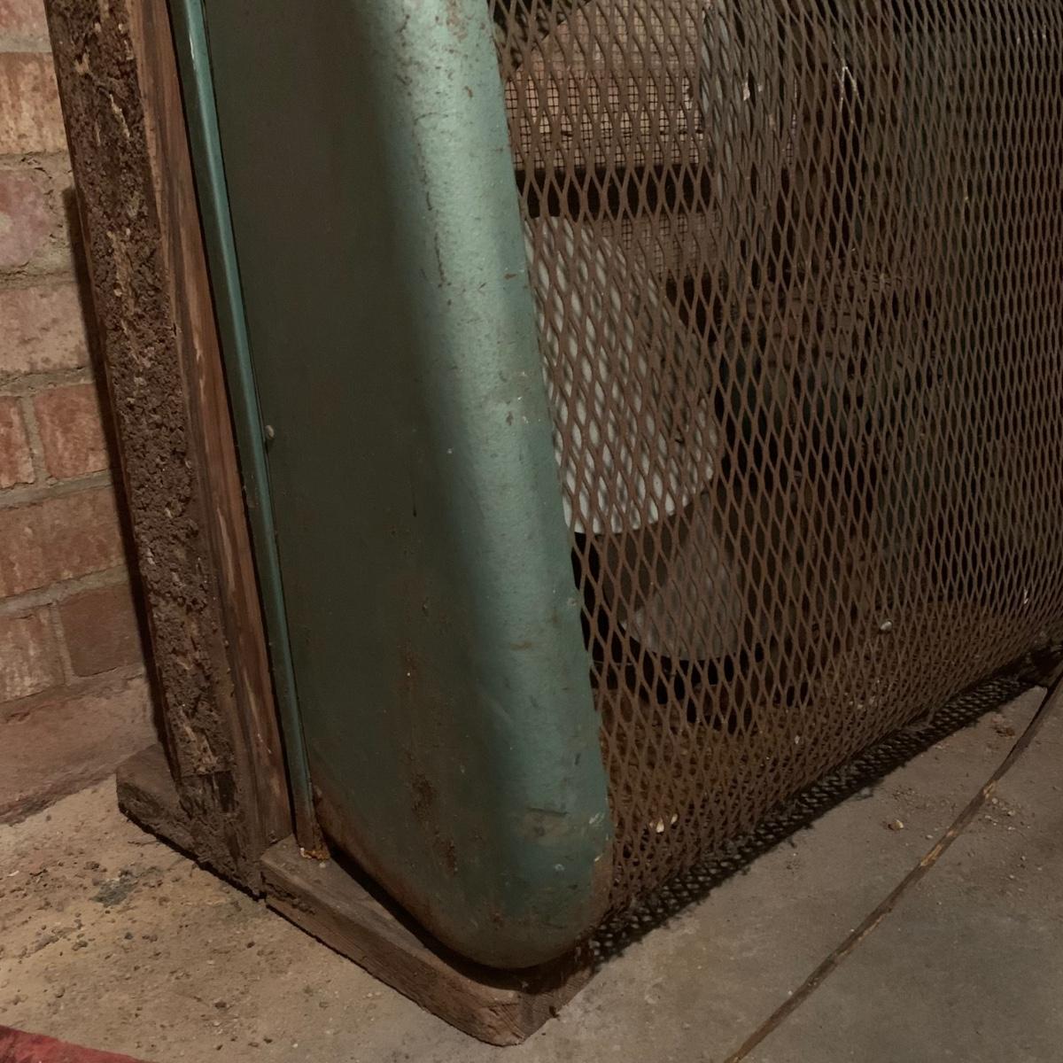 This lot includes one large metal fan. The fan is in fair condition as the metal is rusting and the wood attachment is slightly wobbly. The cord is also a bit rusted (see photos). Cannot confirm the fan works. The fan is loosely attached to a wood base and can separate into two pieces. The fan is heavy. It measures about 32in x 13in x 27in. Local pickup only.