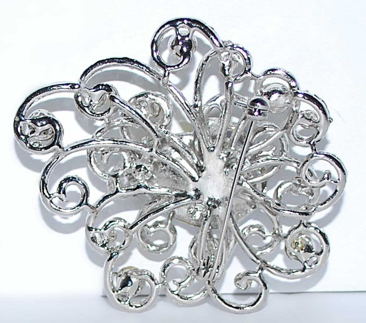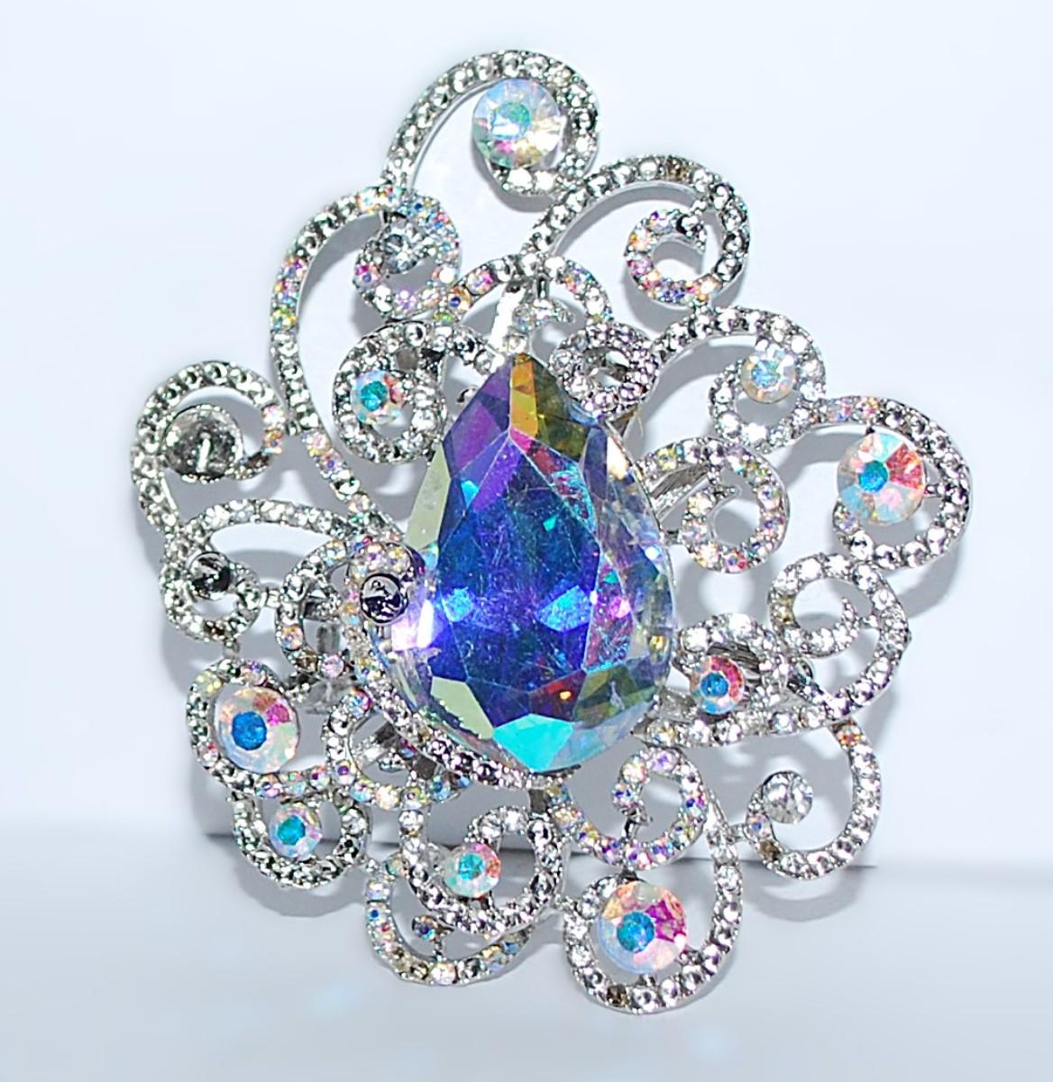 Large IRIDESCENT SPIRAL GARDEN BROOCH (3" x 2½") with Multi-Color Stones on a Silver Tone Setting