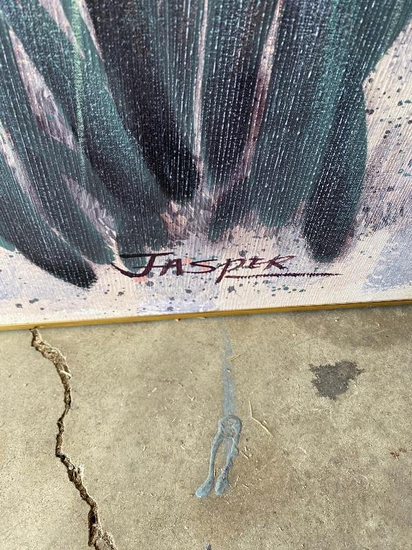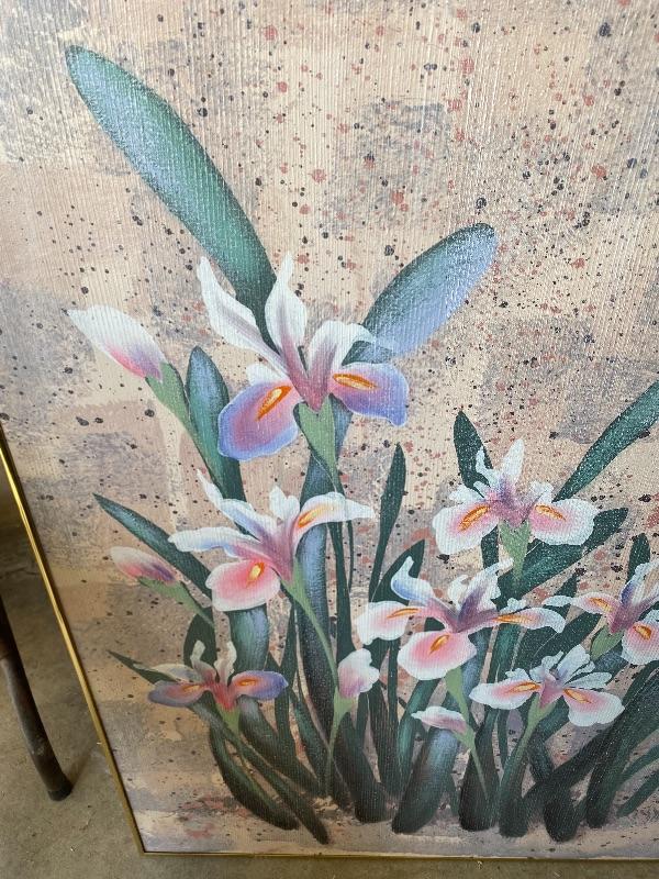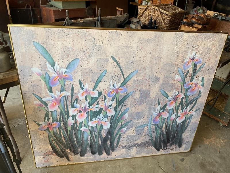 Large painting of Irises. Signed Jasper. Sold by Windsor Art Products. Over 4' wide.