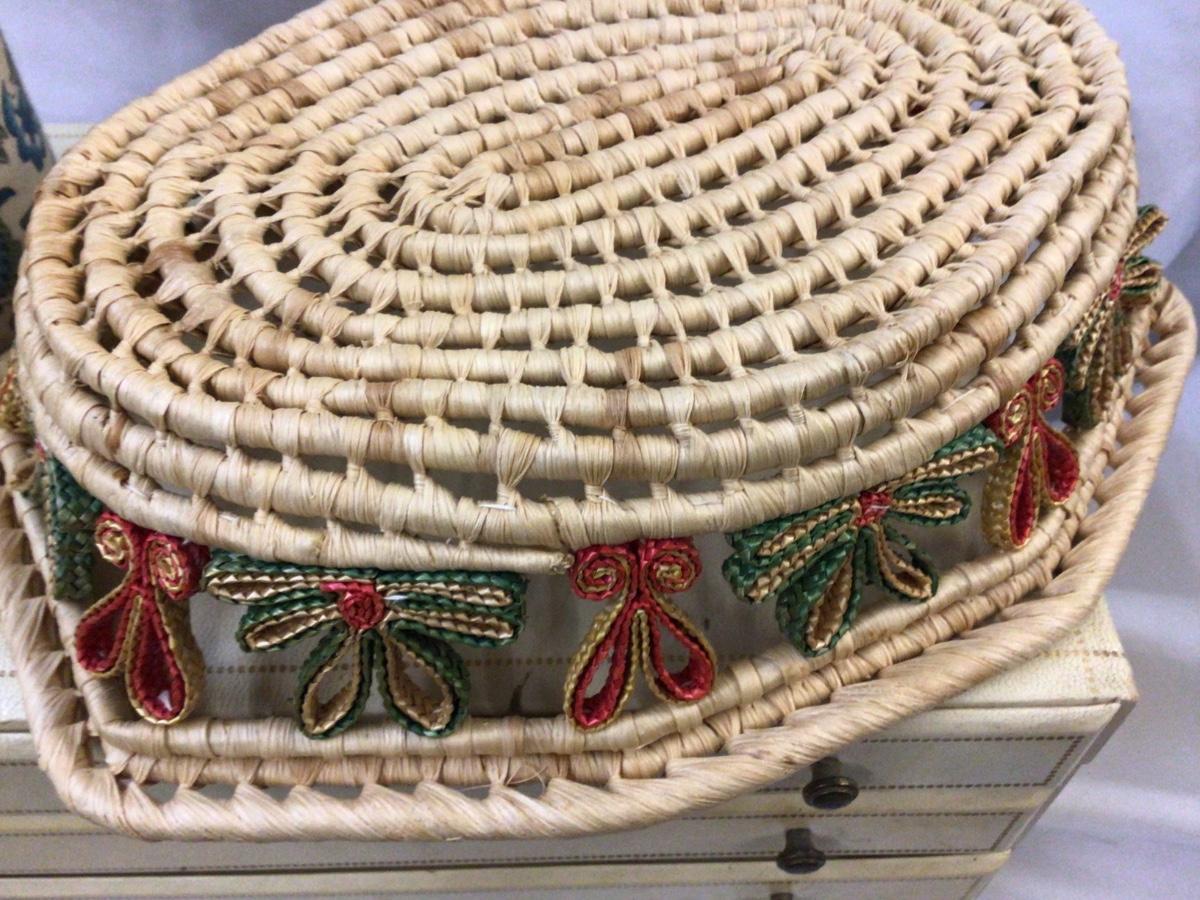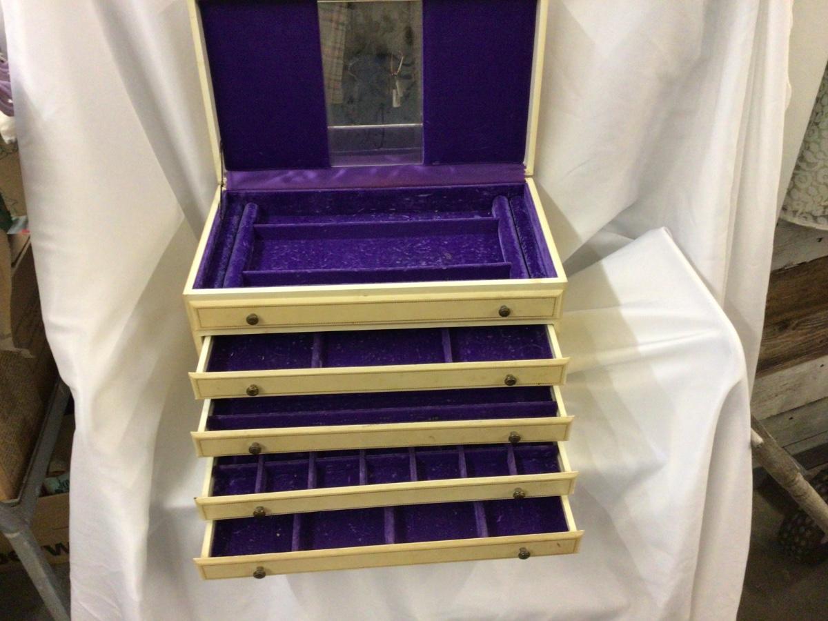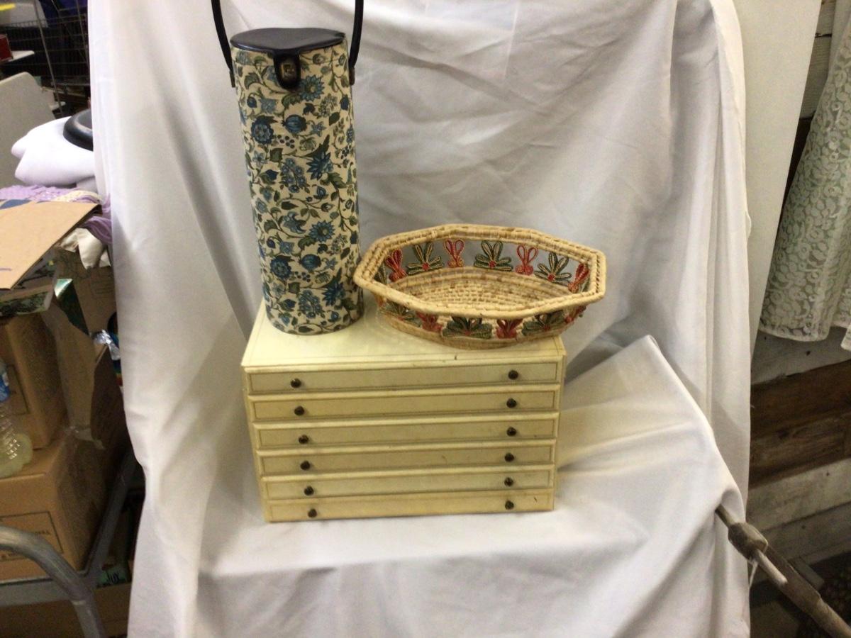 You get this great large 6 draw jewelry box white and purple. You also get a nice oval hand weaved basket, and a vintage wine holder or cooler.