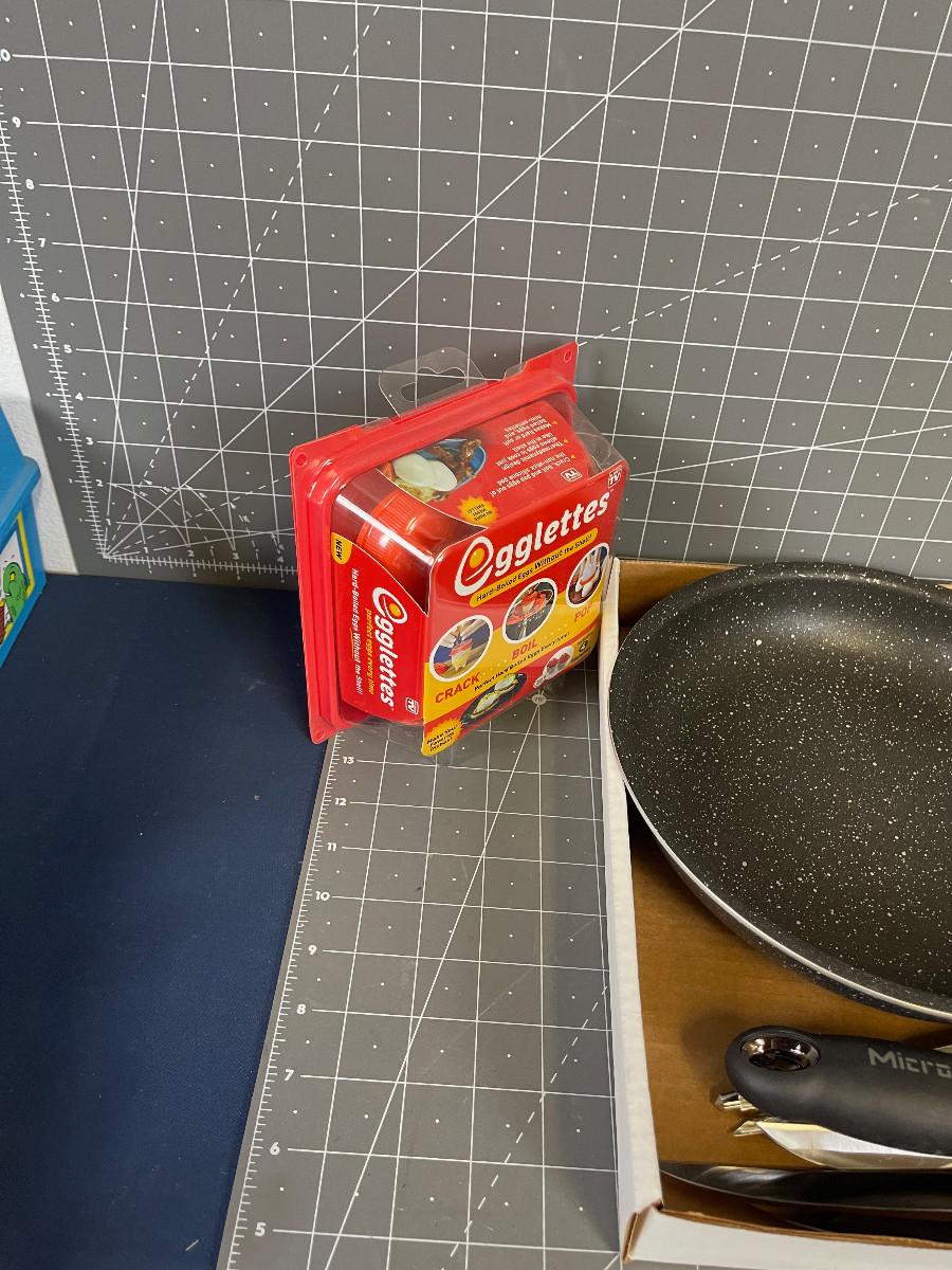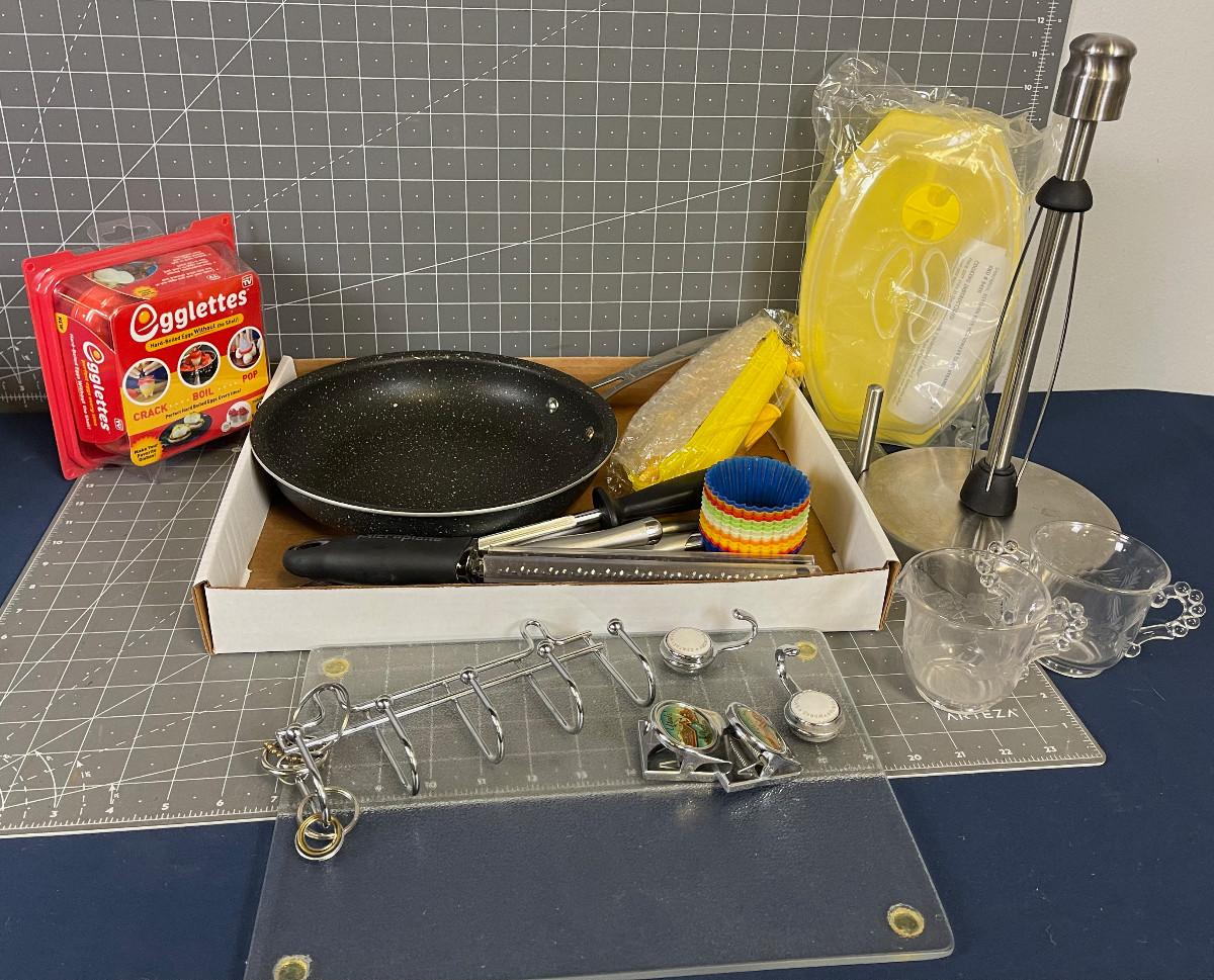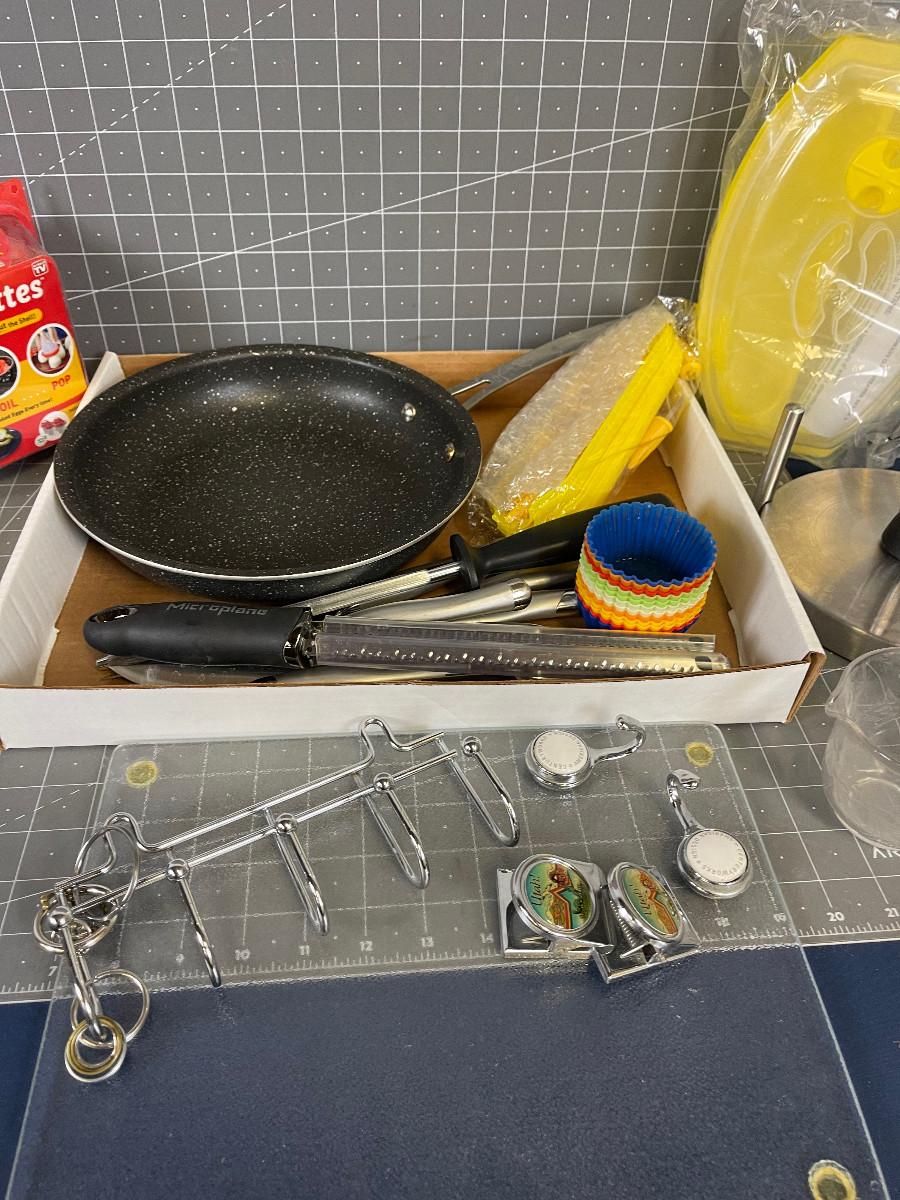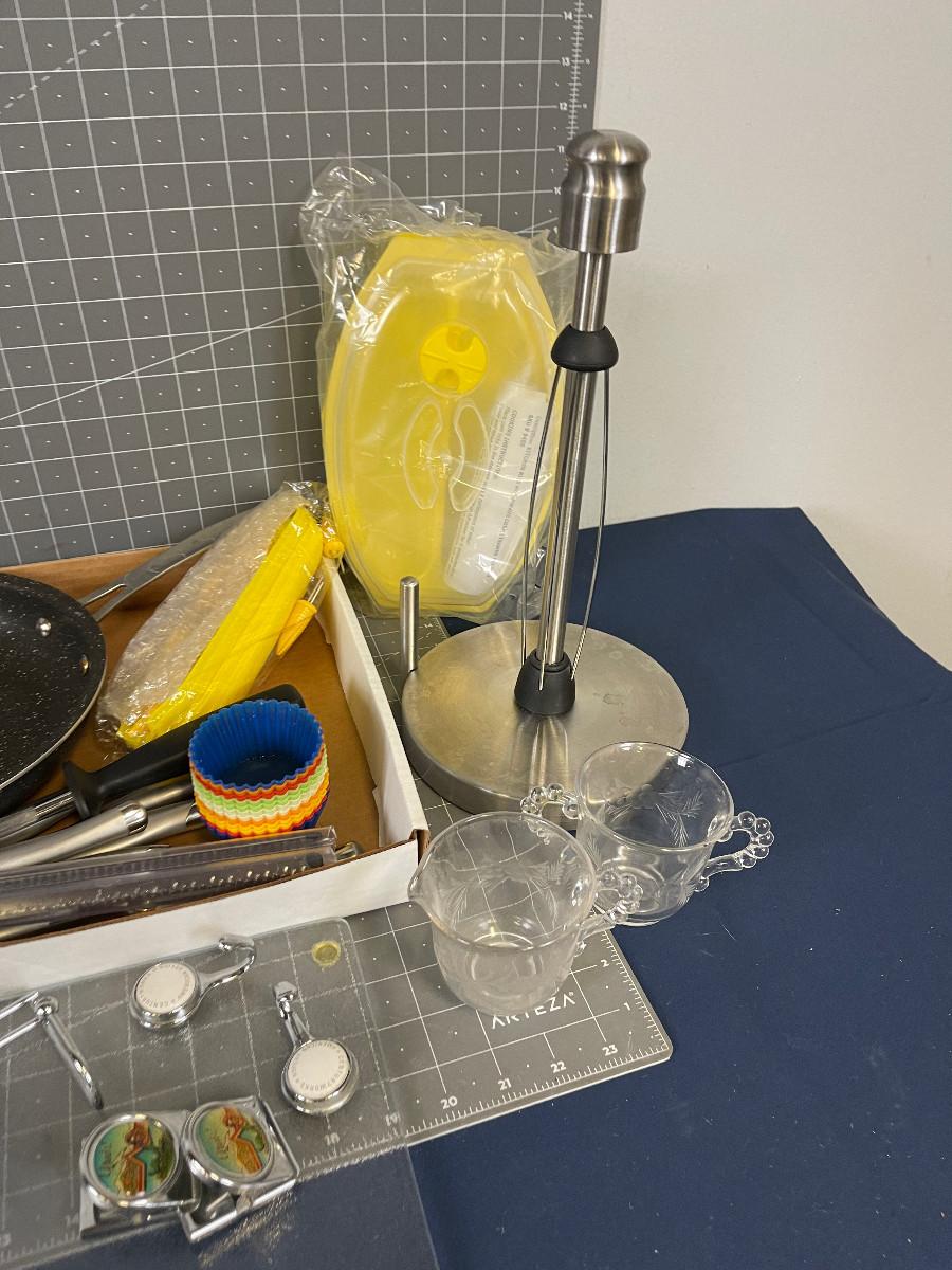 Various newer and used items: Pan, Steak Knives, Paper Towel Holder