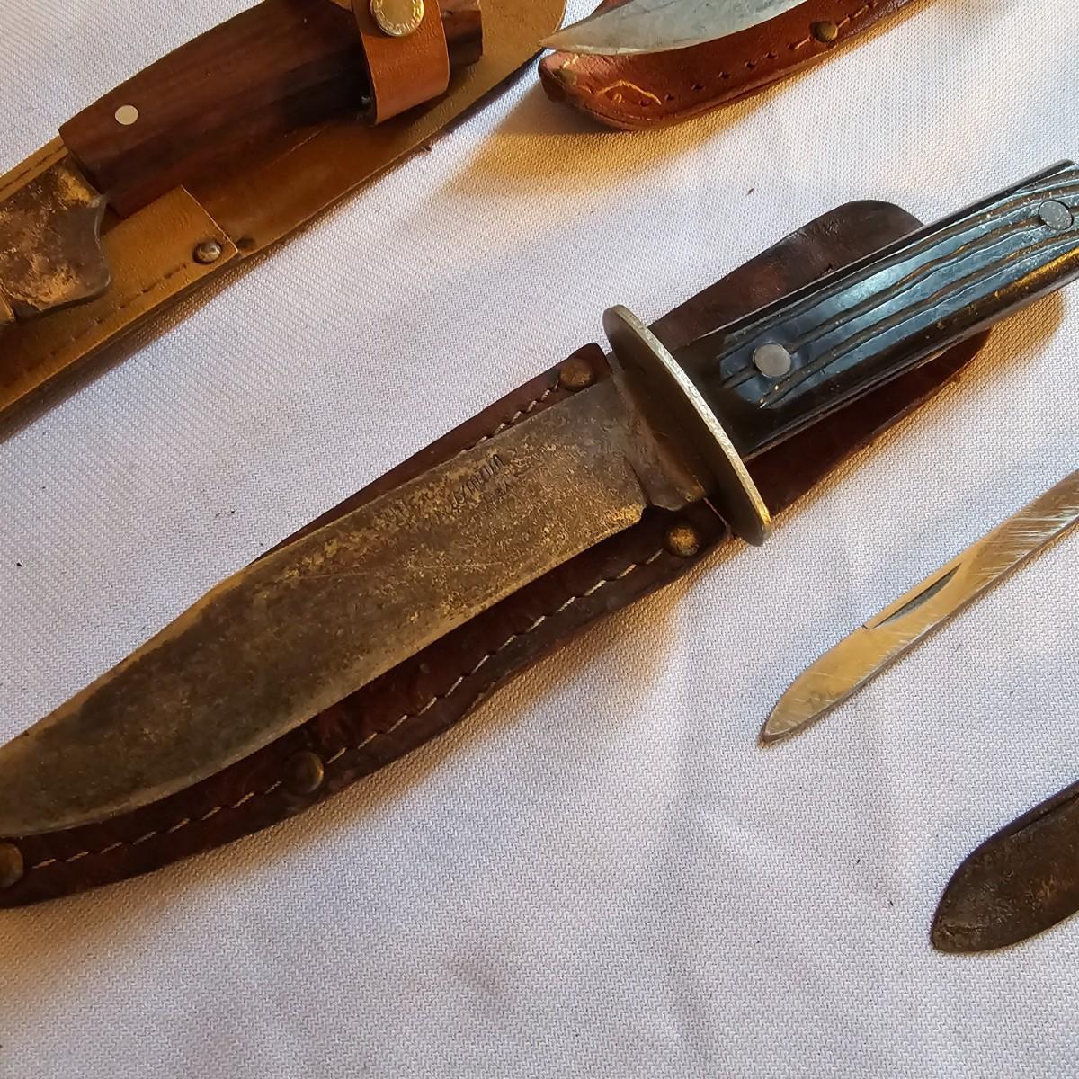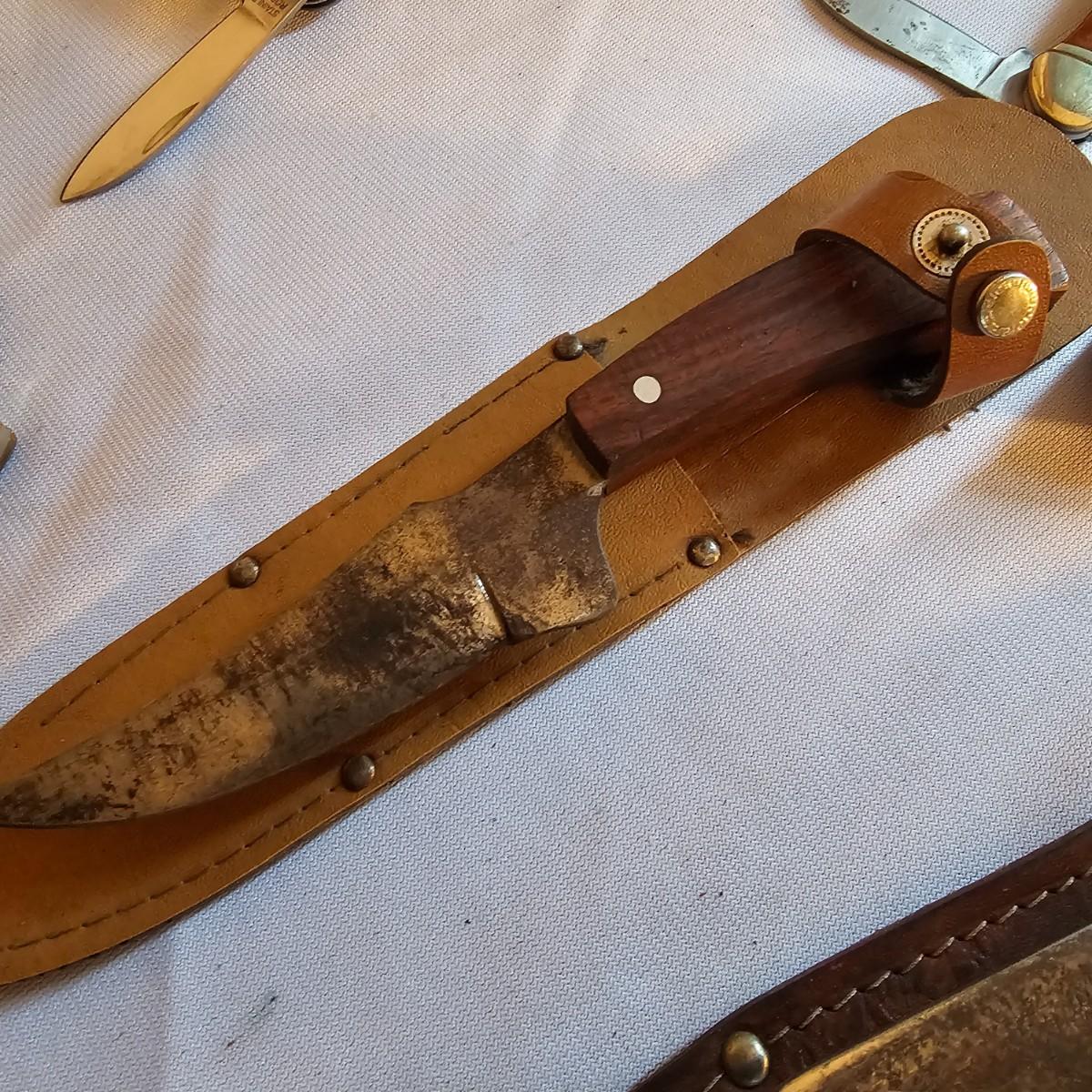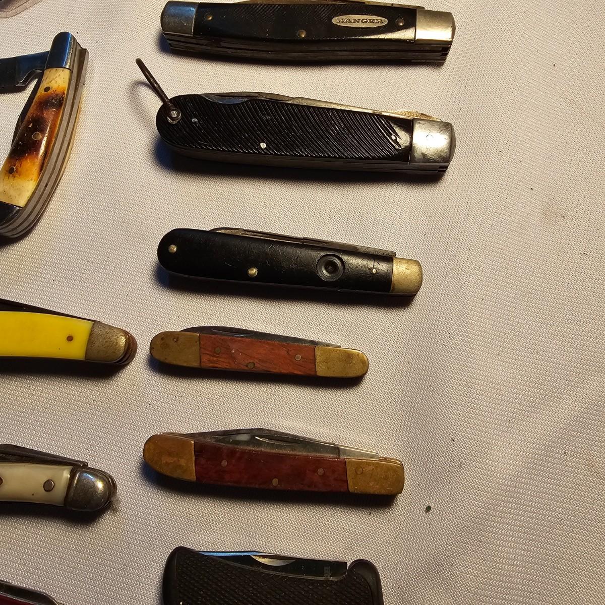 A vast amount of knives in many different styles and shapes. Standard one, two and three blade knives, one handers, lockbacks, more. There are multiples on many of these as they are in box lots. Three hunting knives with sheaths, longest 9". Items from Barlow, Puma, Frost Cutlery. Some items have carry pouches or belt clips. Over 100 items here. See photos for details. Shipping available