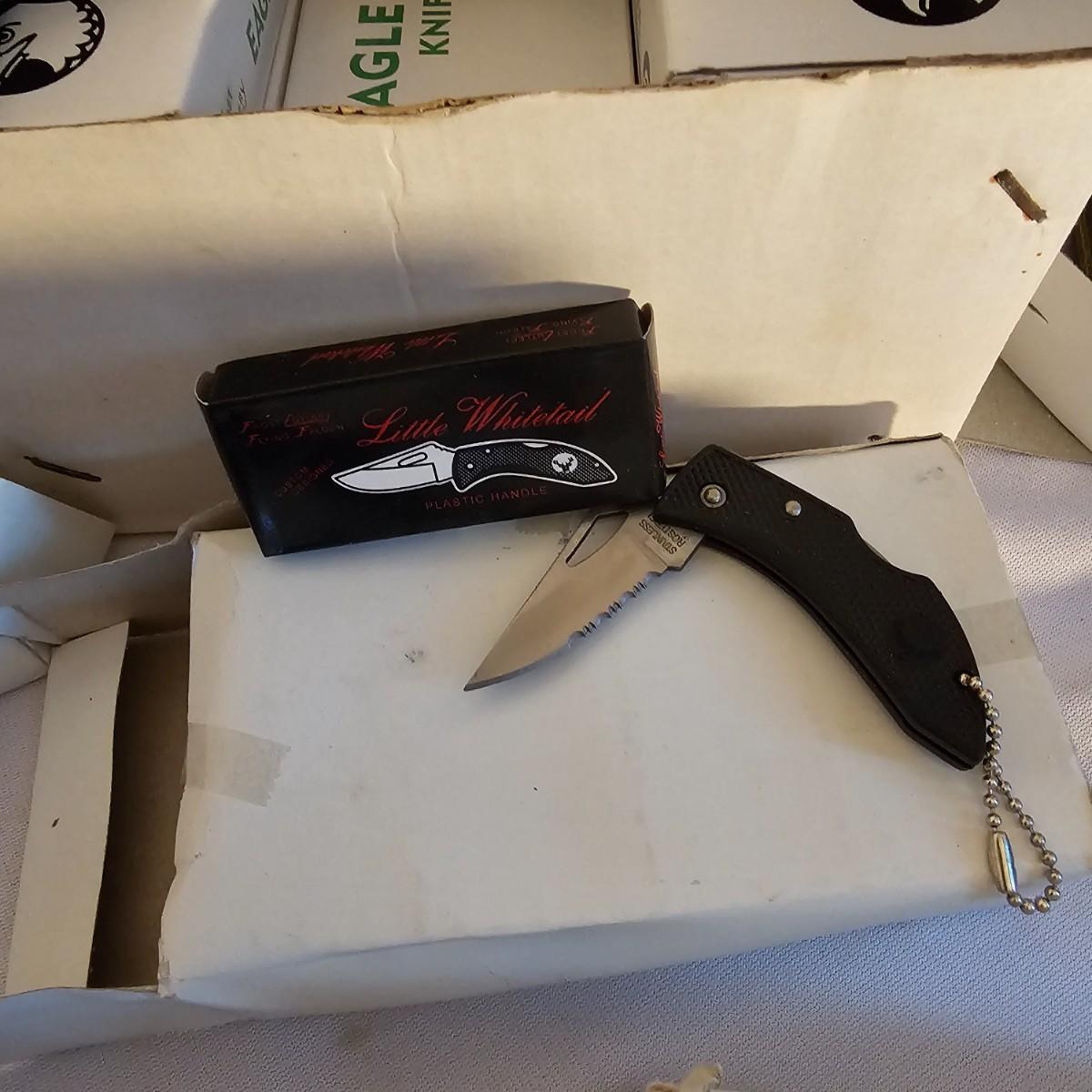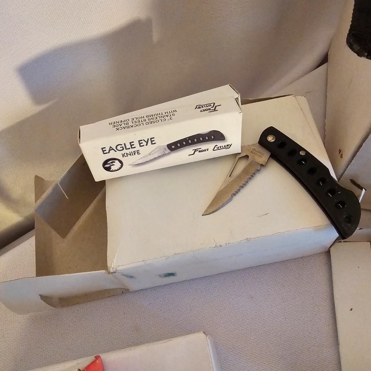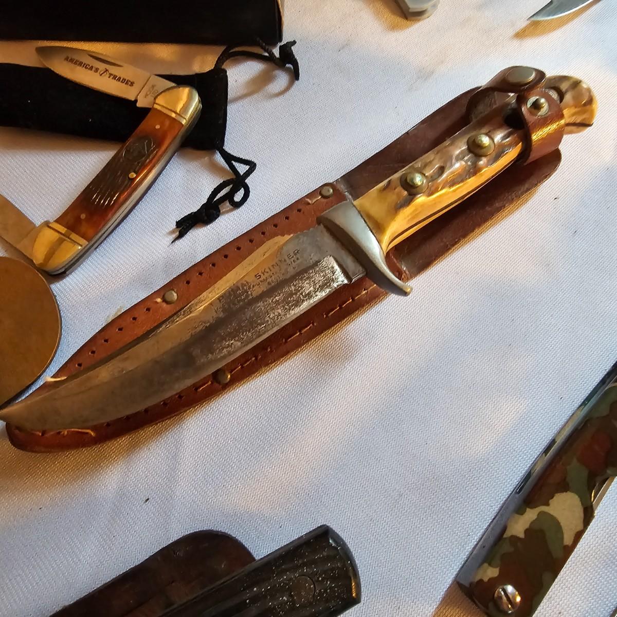 A vast amount of knives in many different styles and shapes. Standard one, two and three blade knives, one handers, lockbacks, more. There are multiples on many of these as they are in box lots. Three hunting knives with sheaths, longest 9". Items from Barlow, Puma, Frost Cutlery. Some items have carry pouches or belt clips. Over 100 items here. See photos for details. Shipping available