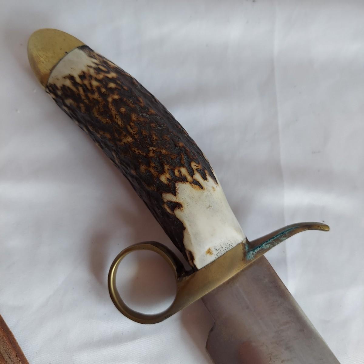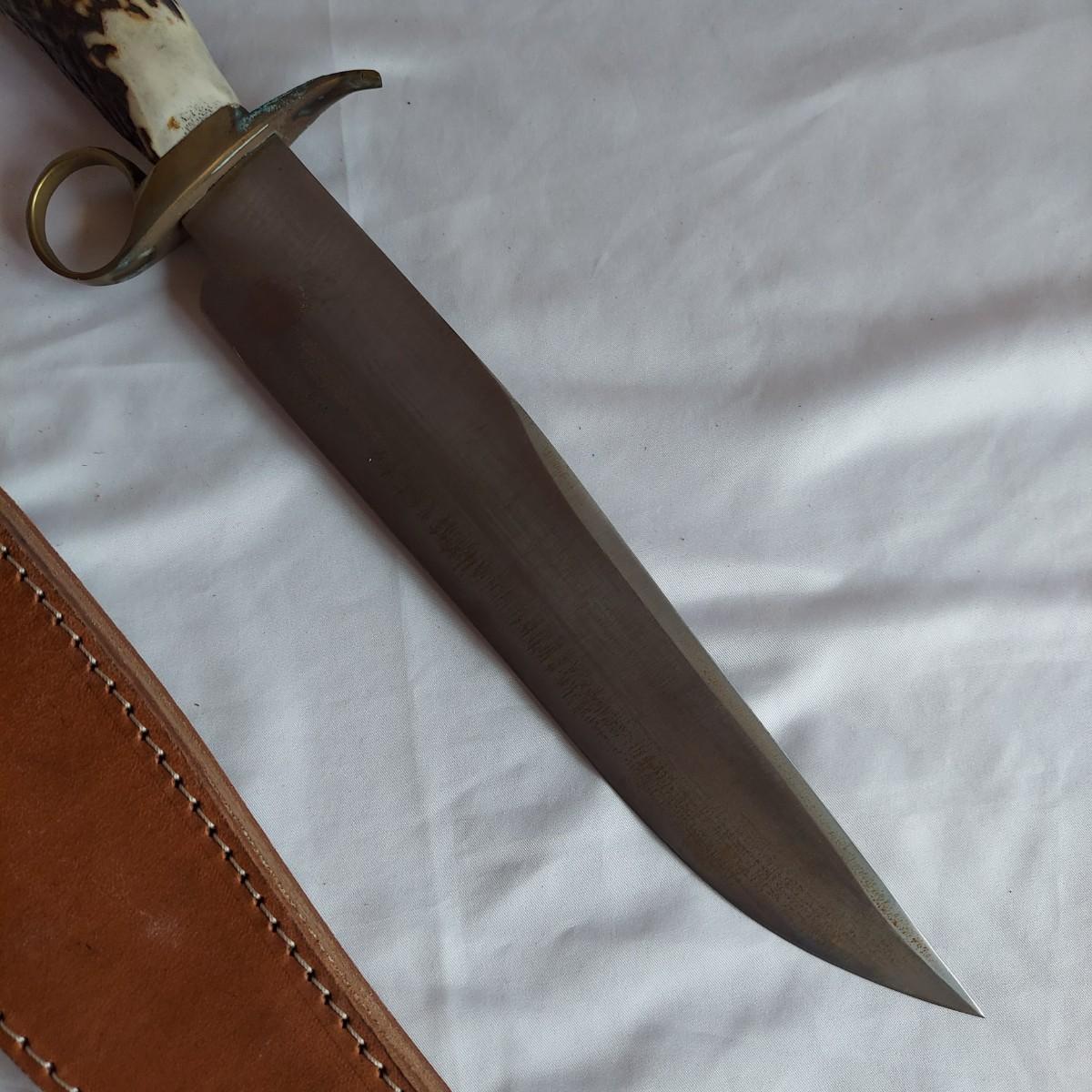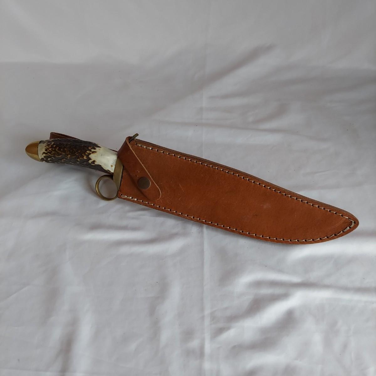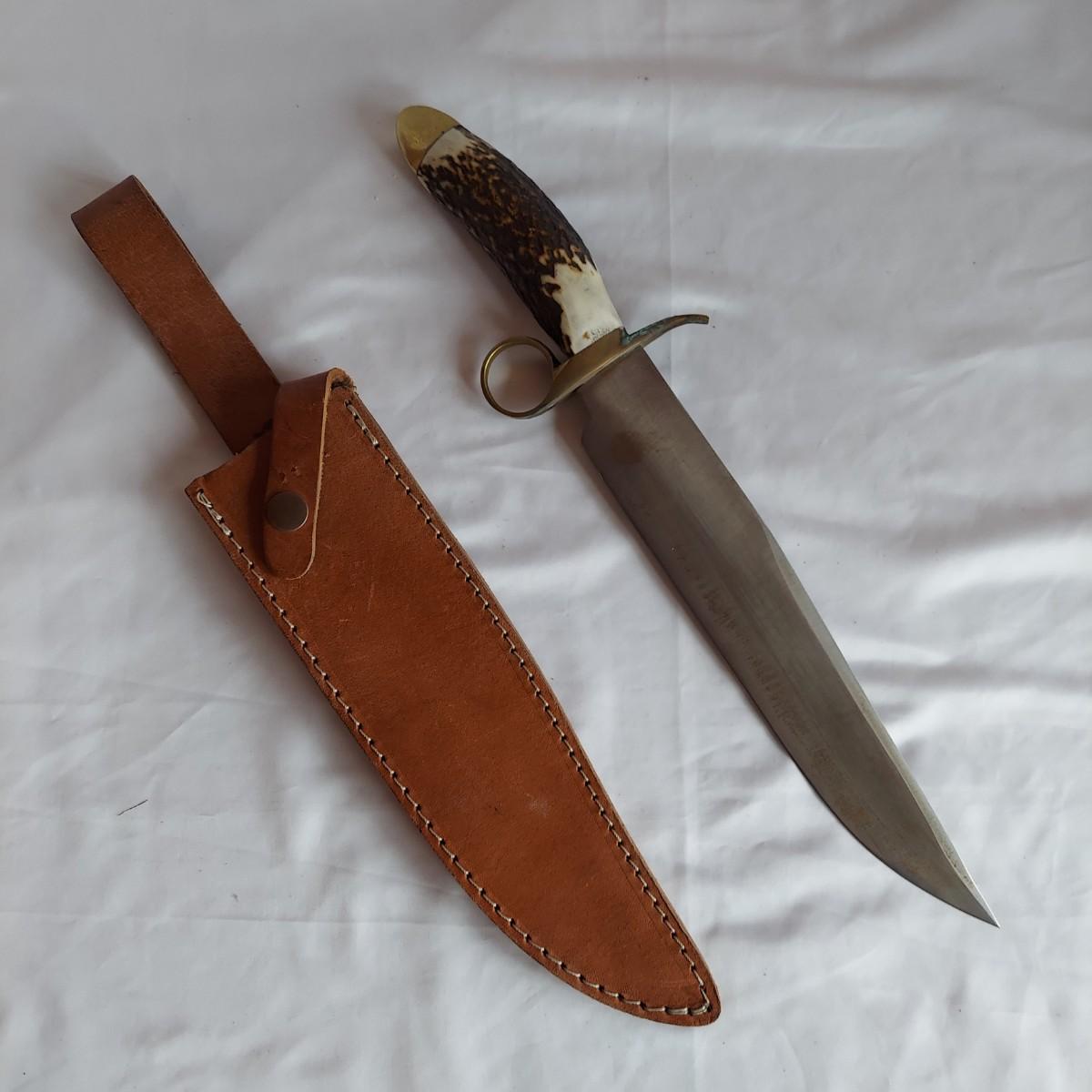 Large Bowie style knife with hardened steel blade. Has some rust on blade. There is an antler bone grip with brass guard. There is a leather sheath style holder with belt loop. The knife is approximately 15" total with a 10" blade. Shipping available. Shipping can be costly. We suggest contacting our preferred local shipping provider, Postage Express, with dimensions and getting an estimate before bidding: (828) 670-5501or postageexpress@yahoo.com.