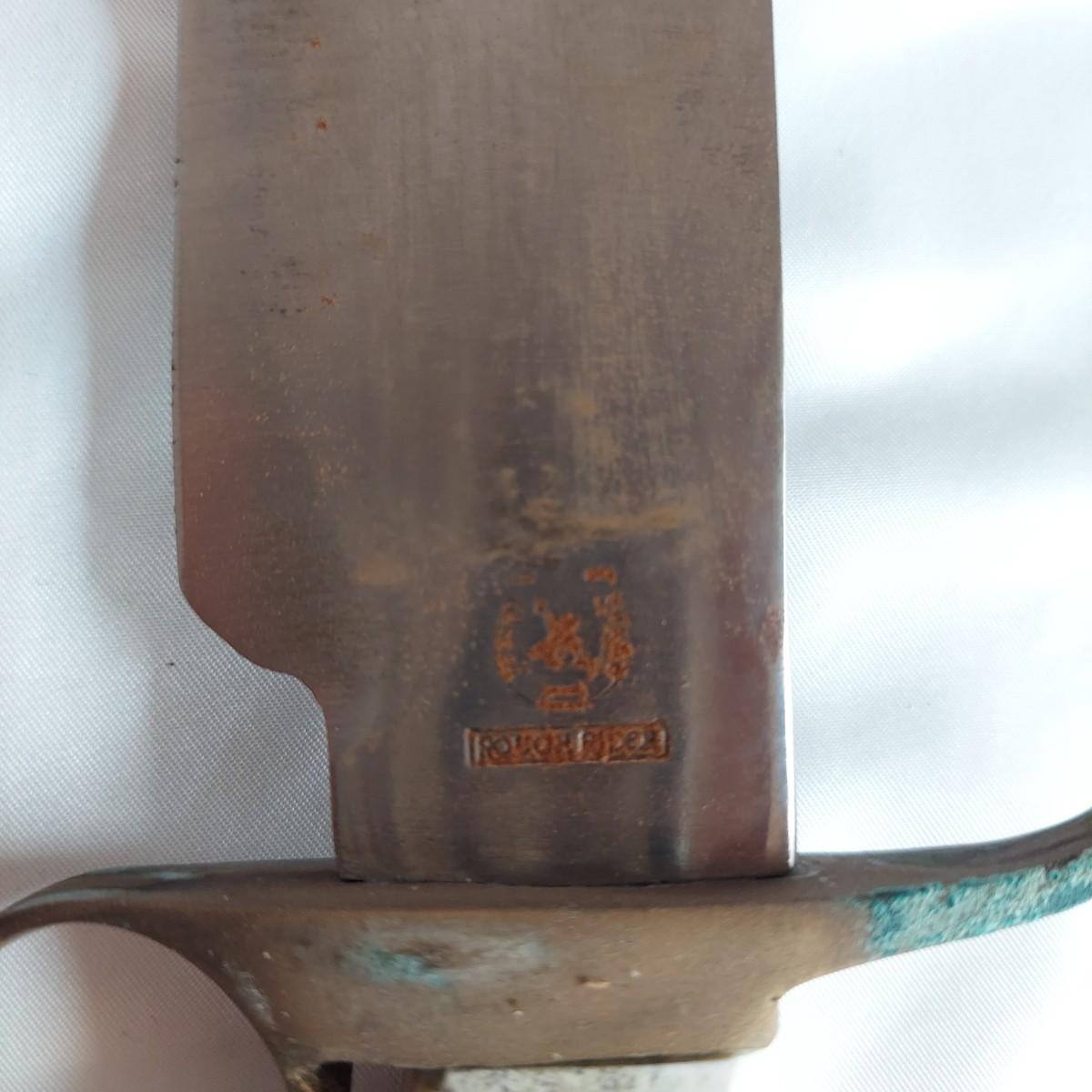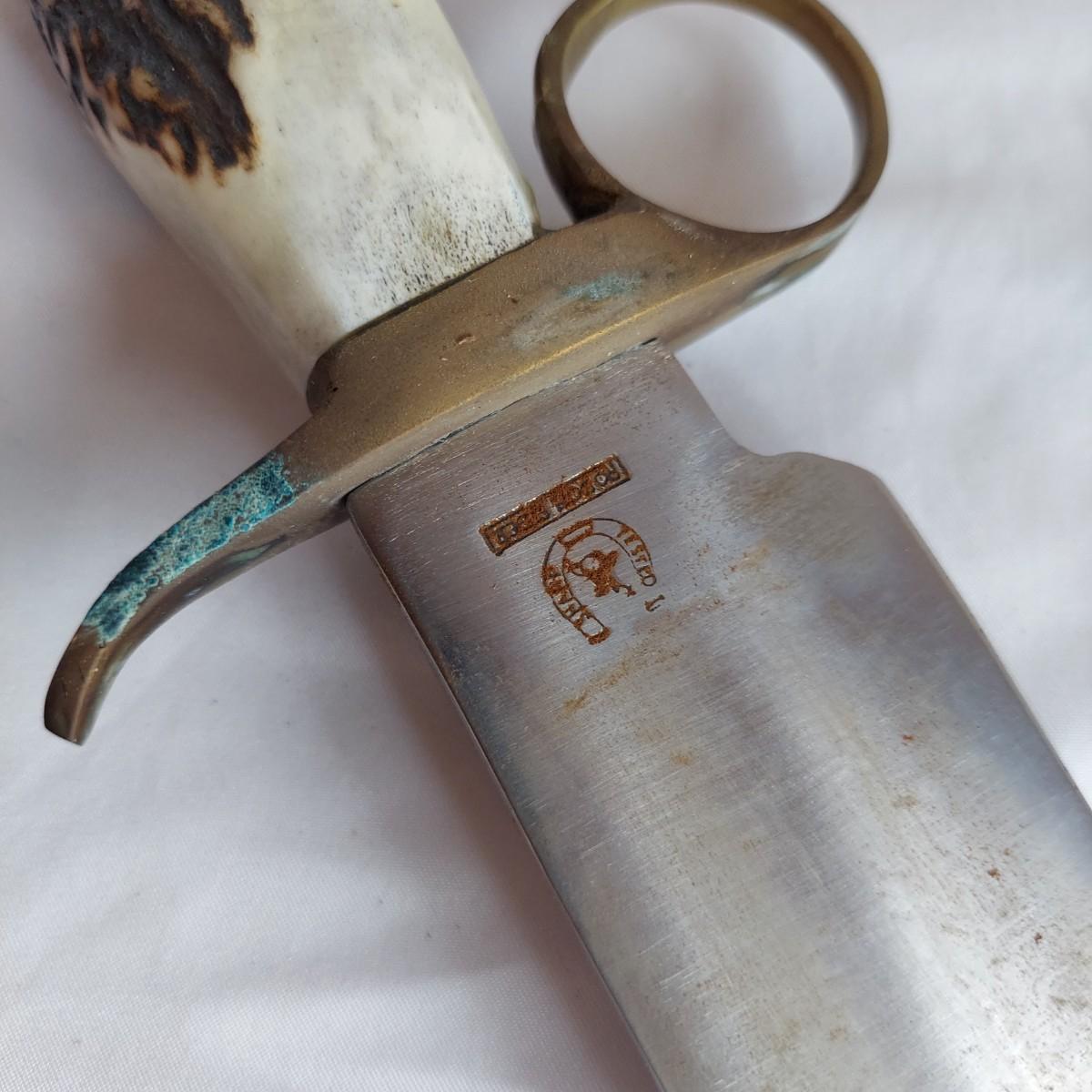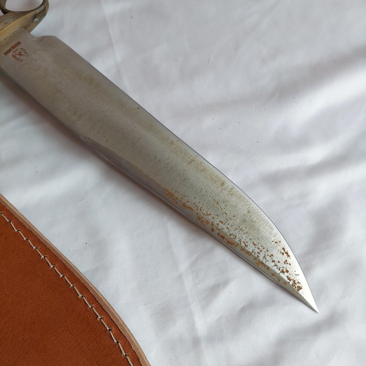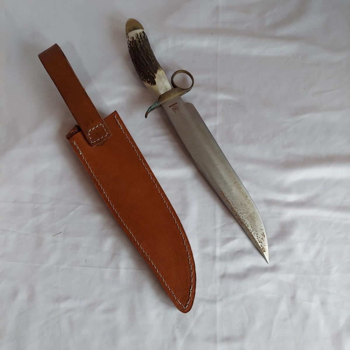Large Bowie style knife with hardened steel blade. Has some rust on blade. There is an antler bone grip with brass guard. There is a leather sheath style holder with belt loop. The knife is approximately 15" total with a 10" blade. Shipping available. Shipping can be costly. We suggest contacting our preferred local shipping provider, Postage Express, with dimensions and getting an estimate before bidding: (828) 670-5501or postageexpress@yahoo.com.