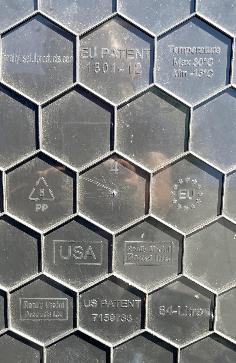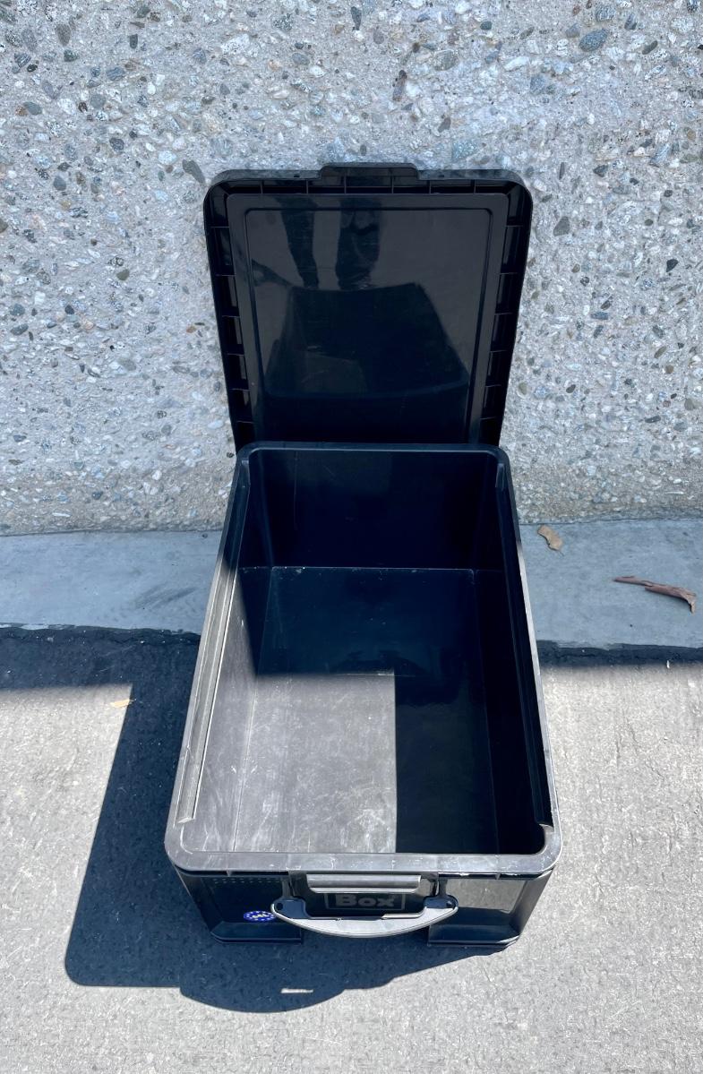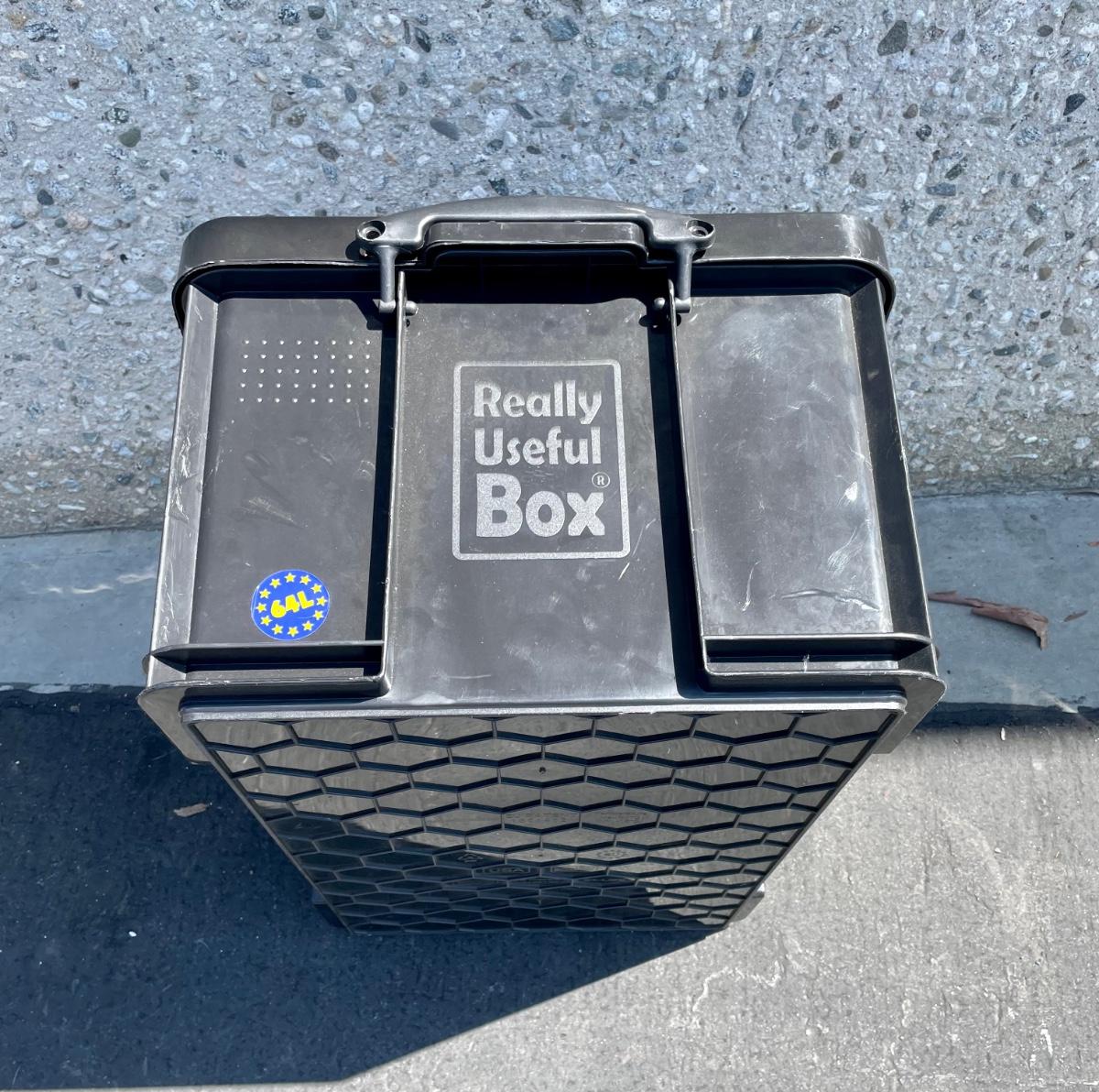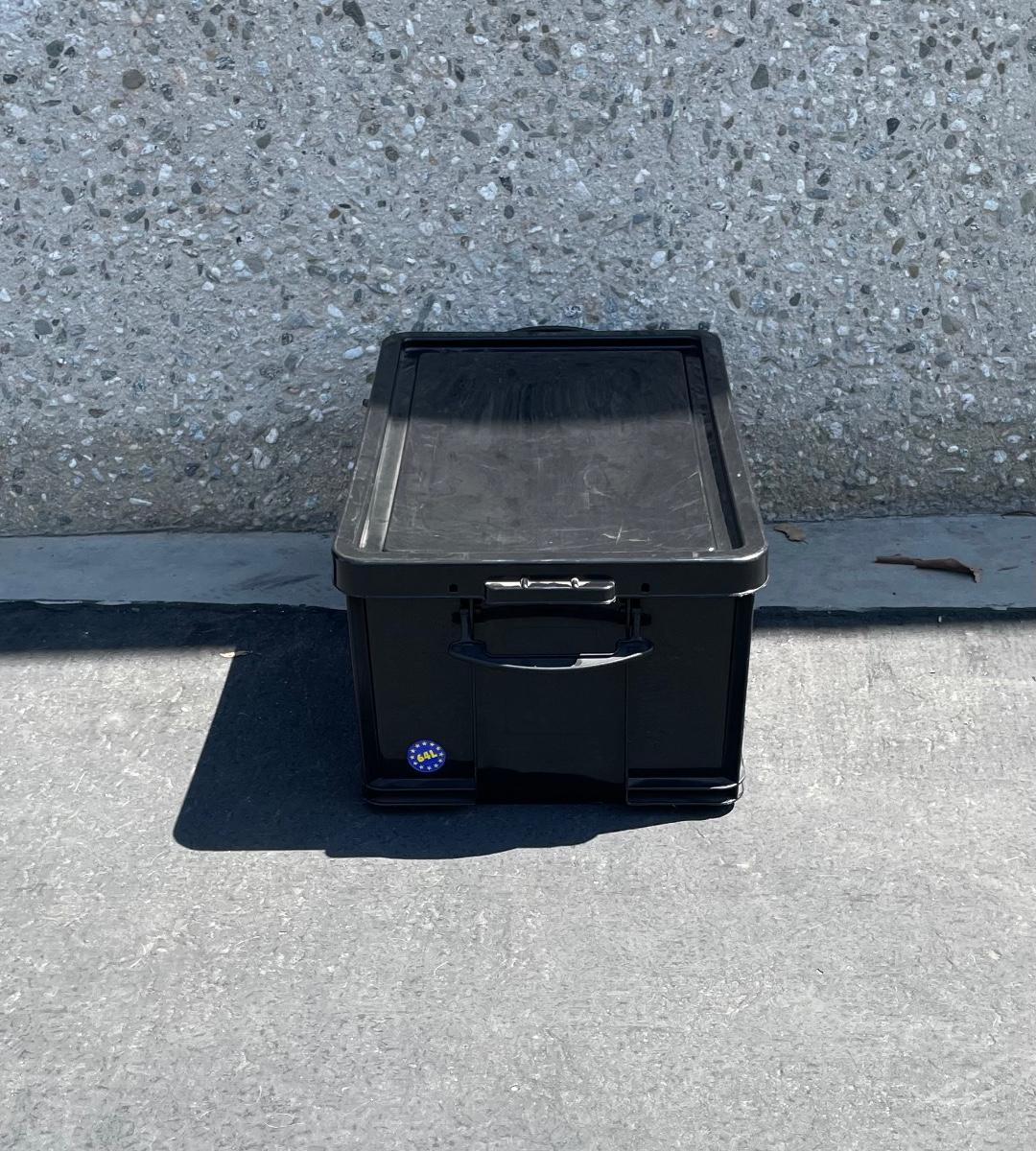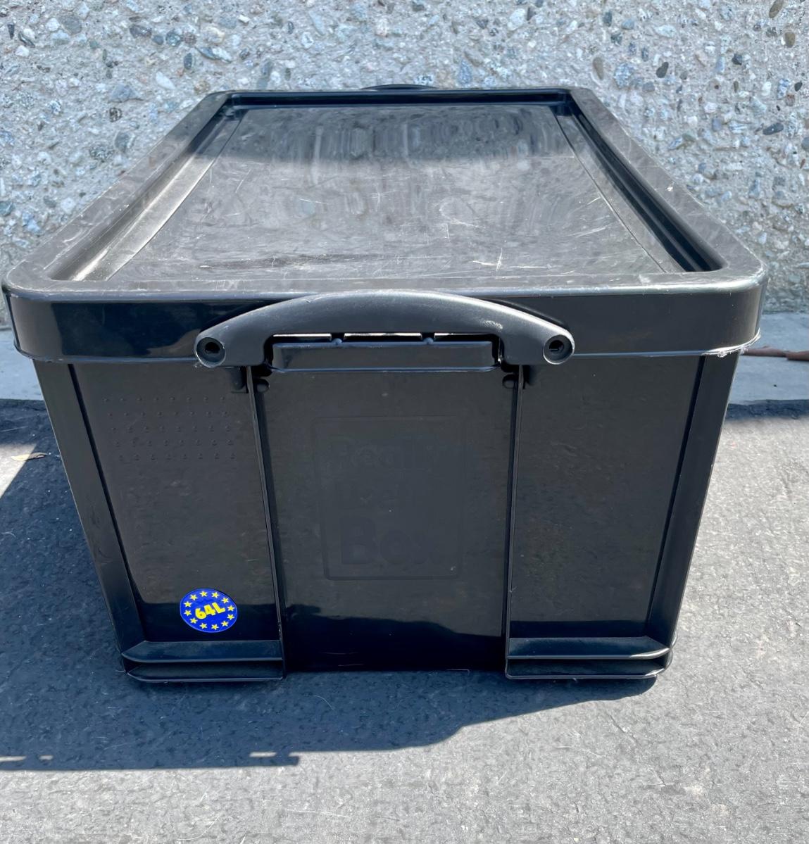 Black heavy duty lidded storage container, holds 64 liters. Made by Really Useful Boxes Inc.