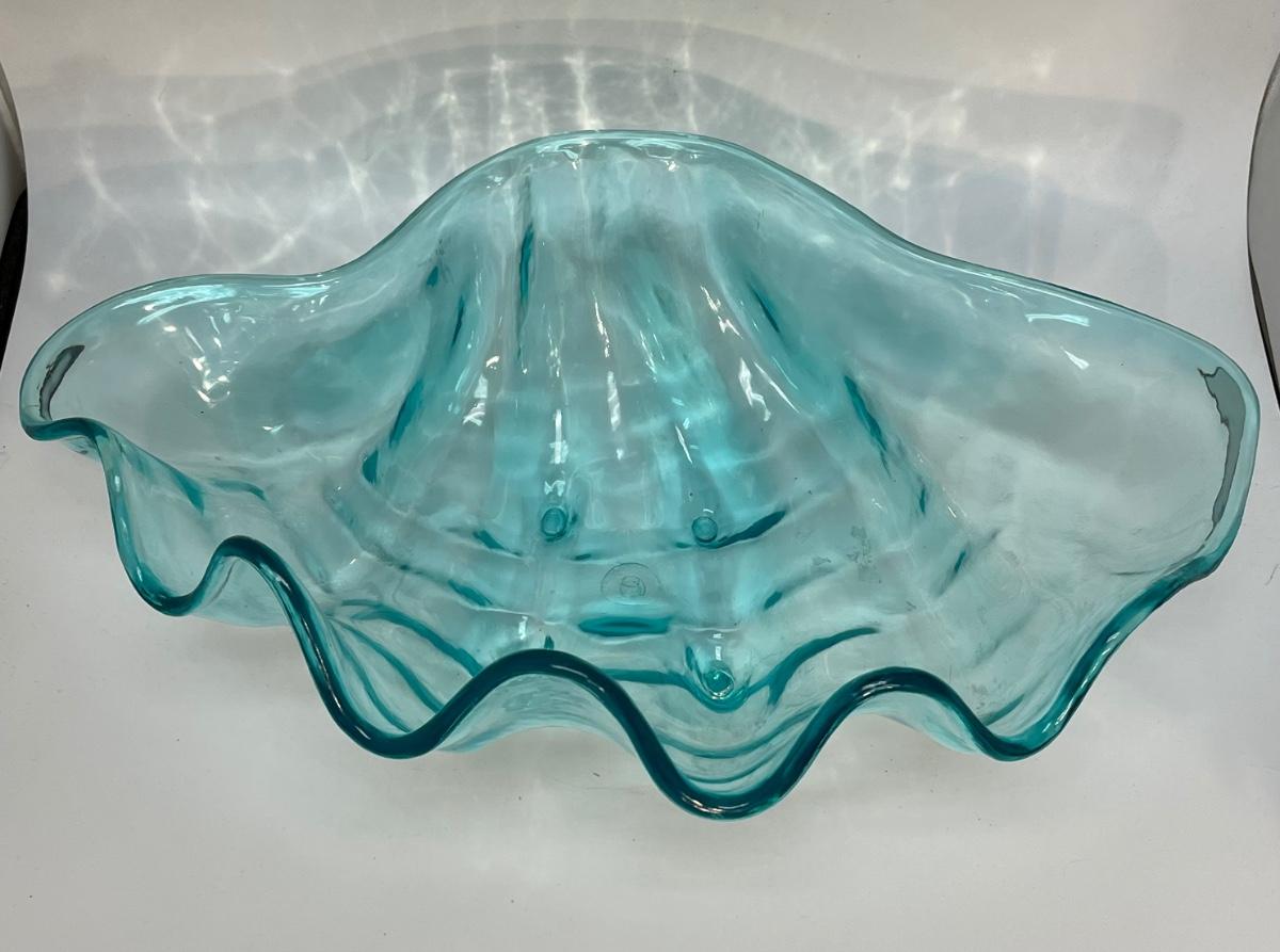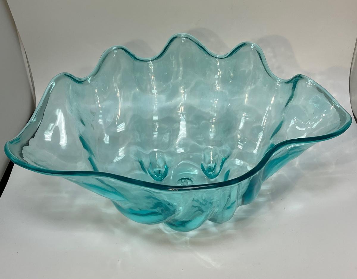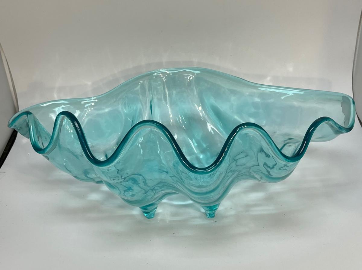 Light blue clam shell bowl. Large size plastic bowl. Good for display or as a serving bowl.