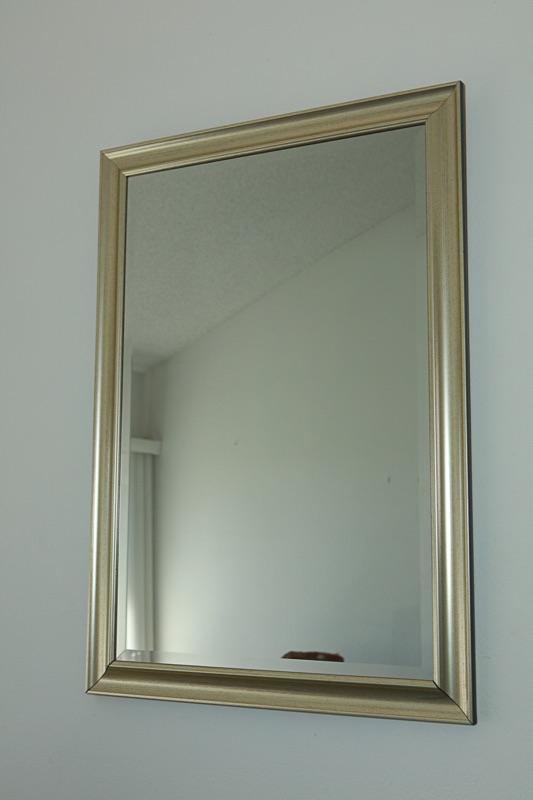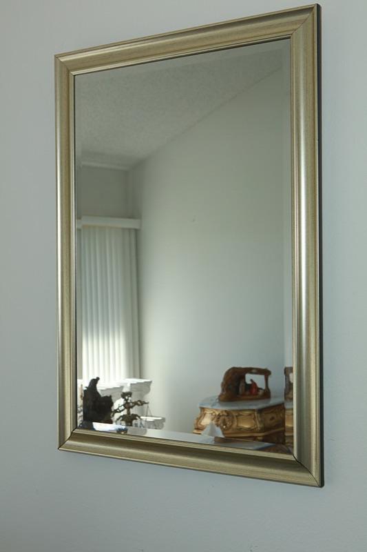 Large rectangular wall mirror. Light gold colored frame. Measures approx. 29"x41".