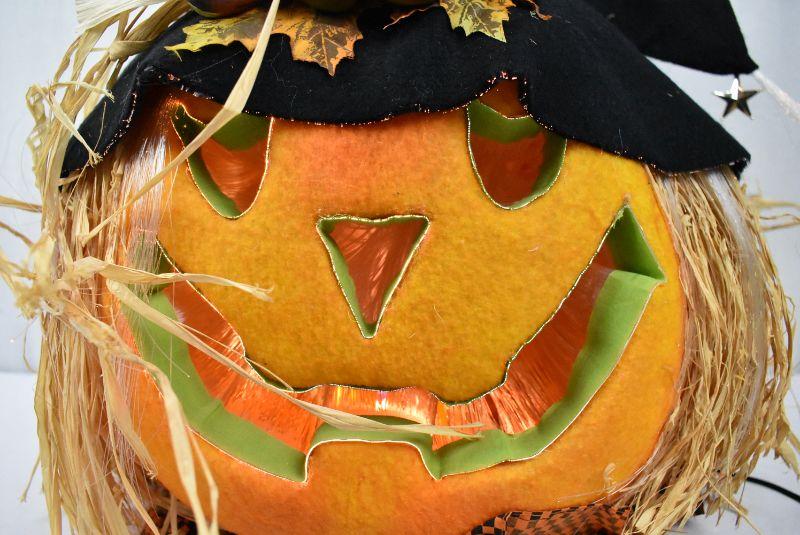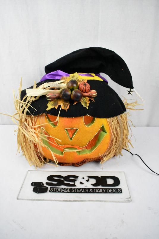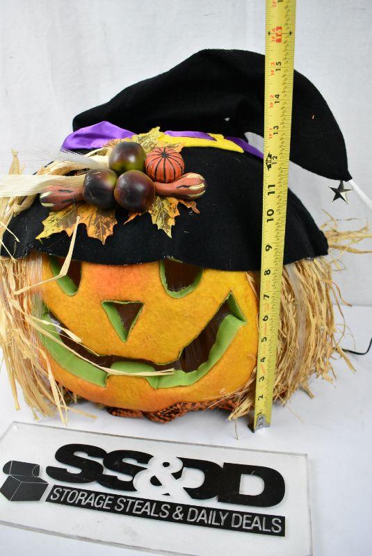 Large light up pumpkin with scarecrow hair and a witch hat. Works