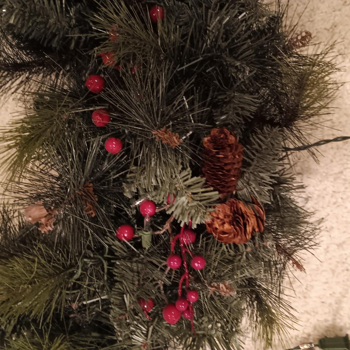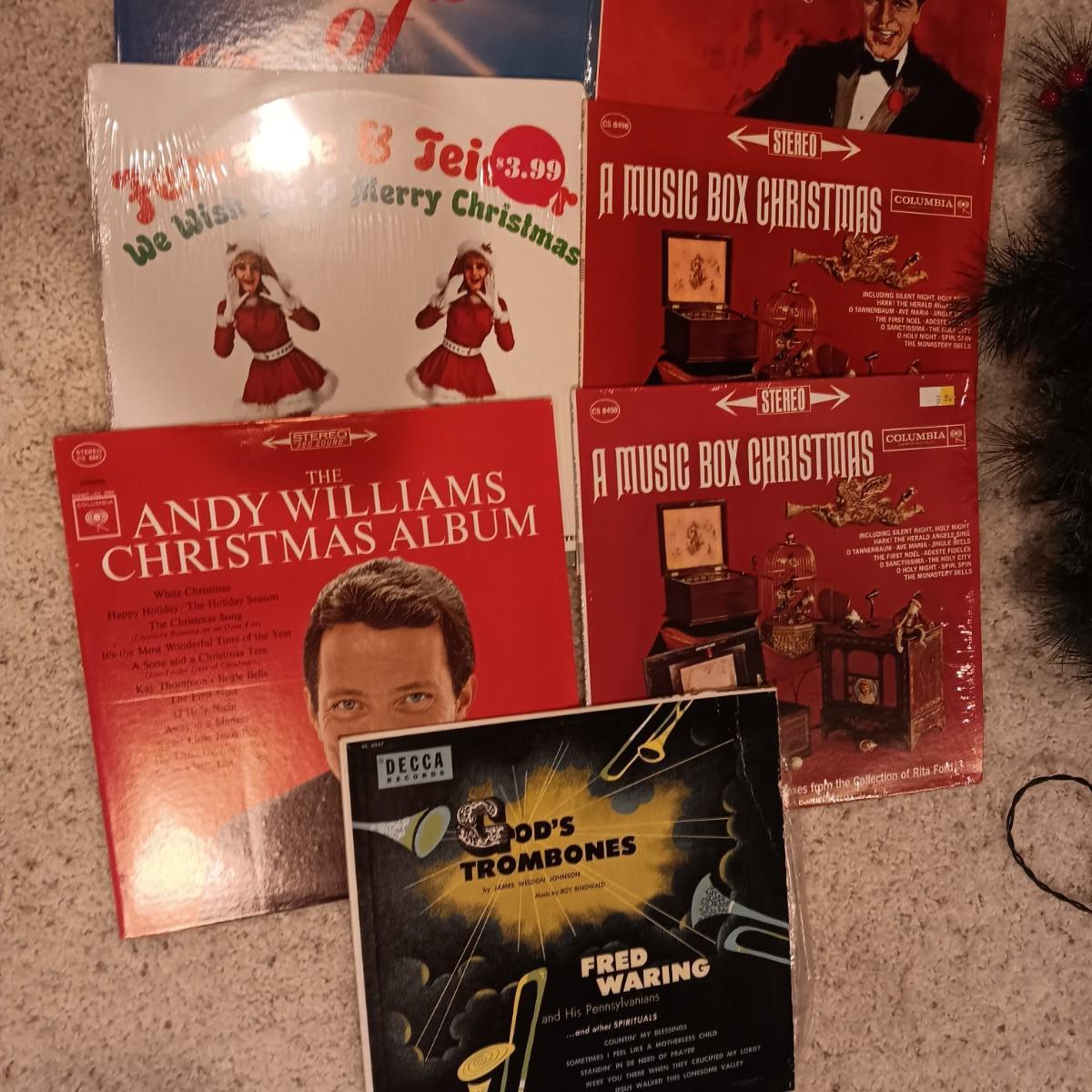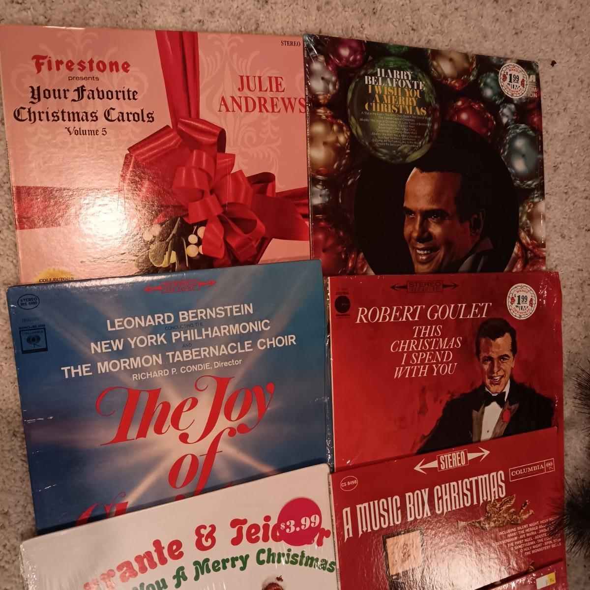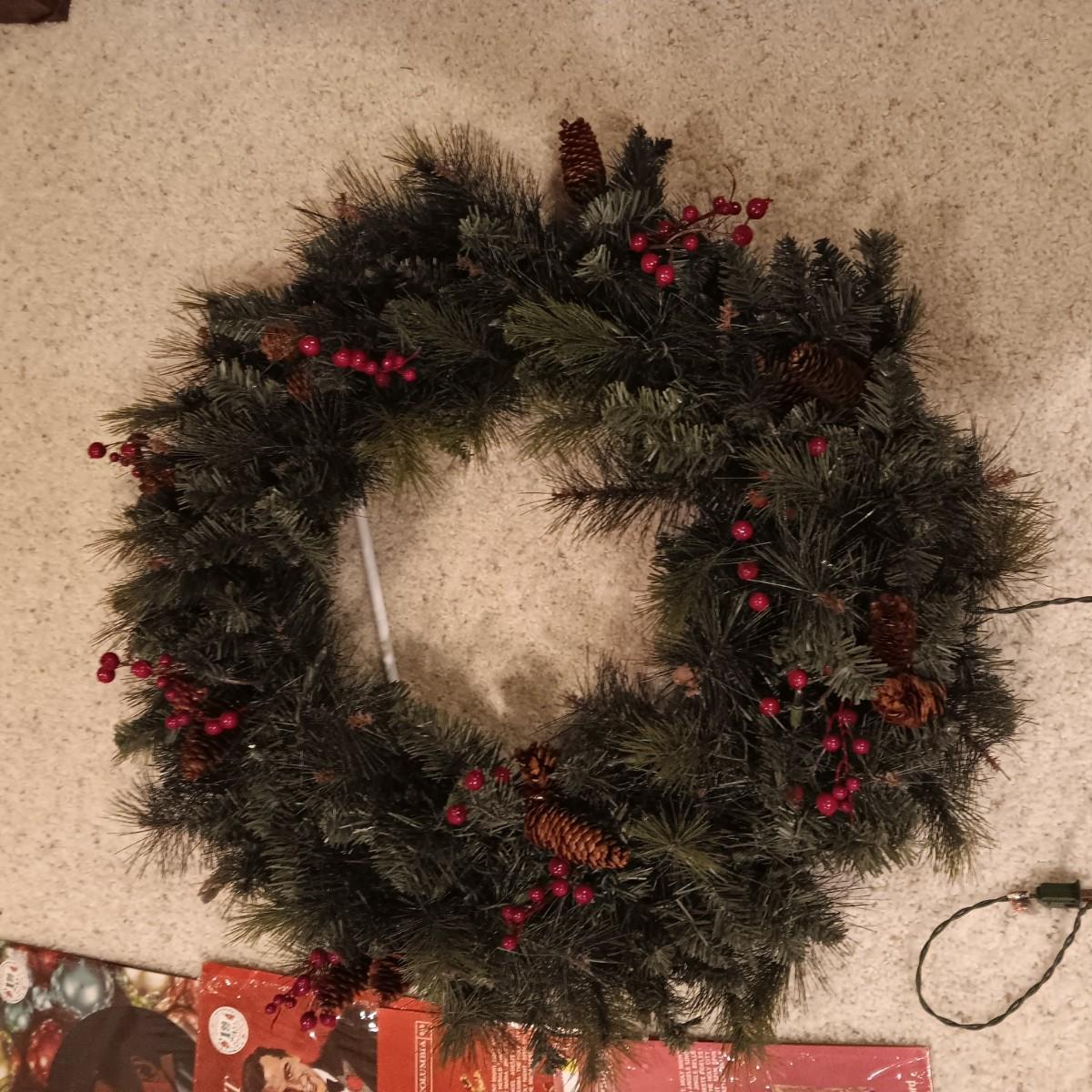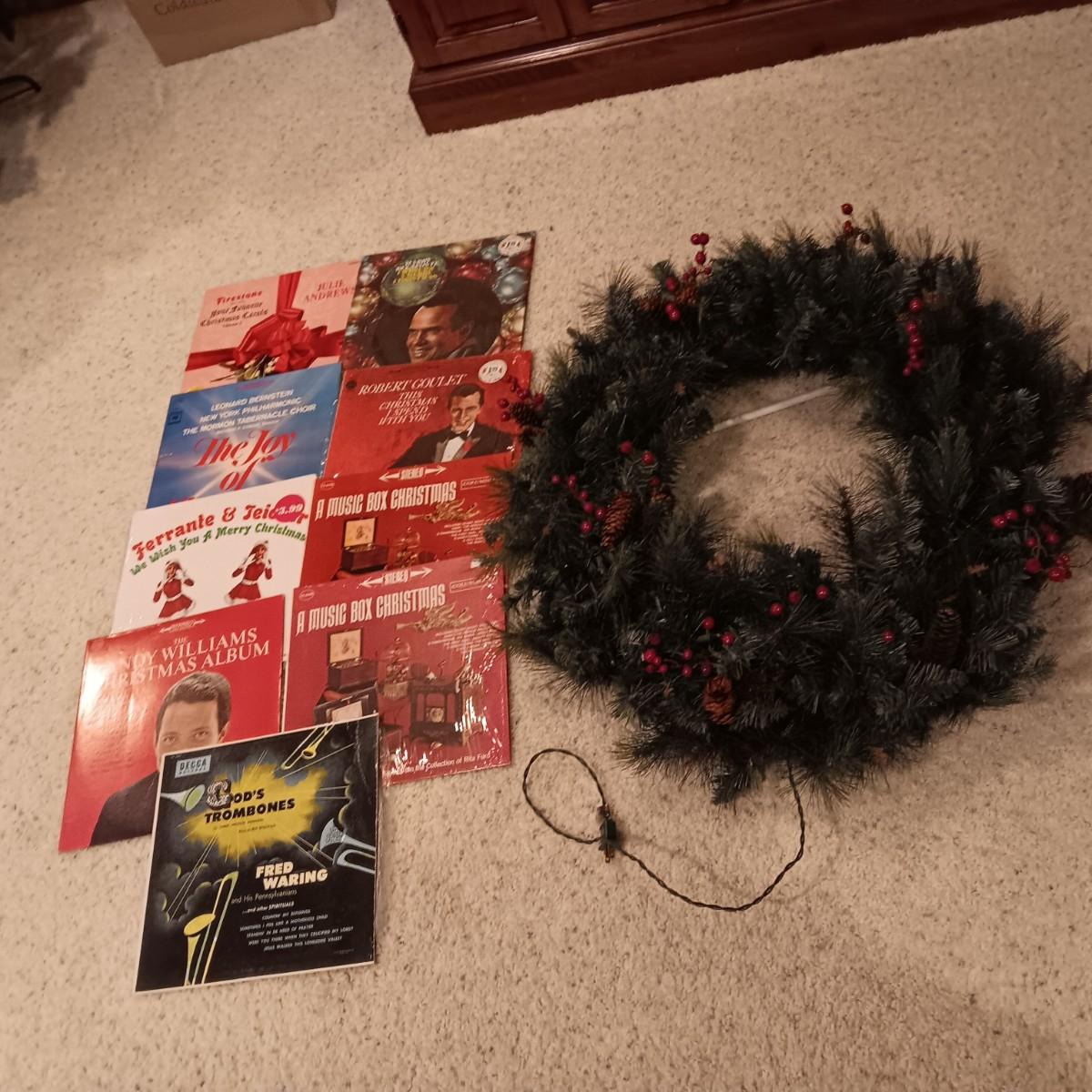 LARGE LIGHTED CHRISTMAS WREATH AND CHRISTMAS MUSIC ON VINYL RECORDS