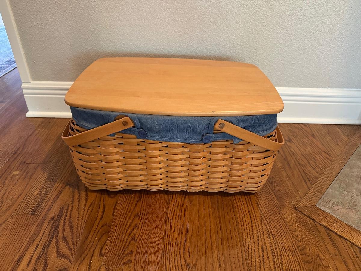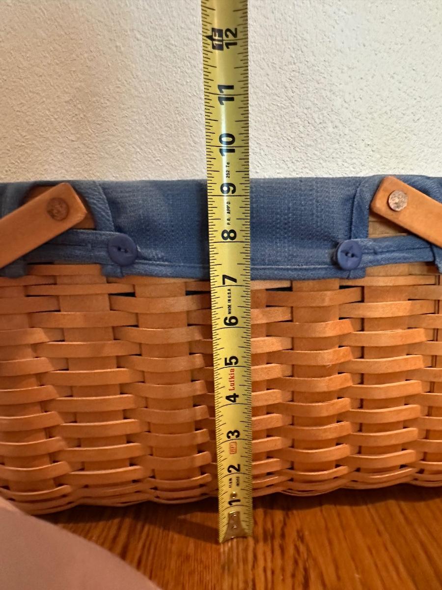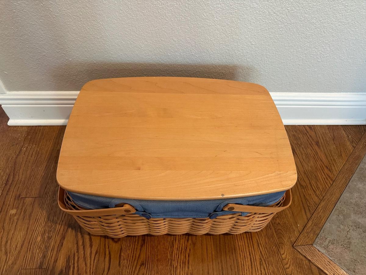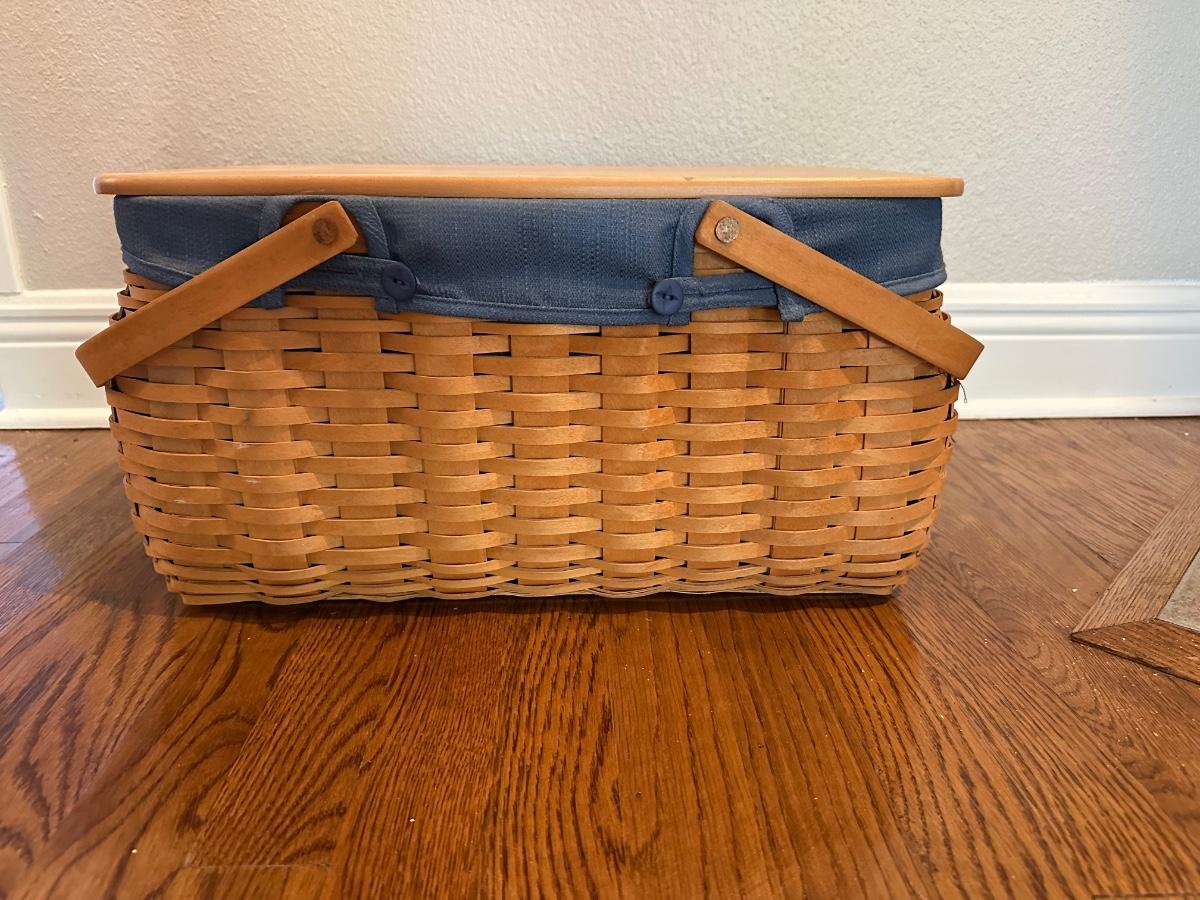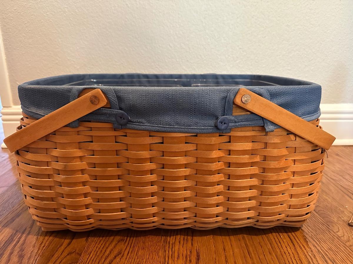 Large Longaberger Basket with Lid, Blue Fabric Liner & Divided Protector