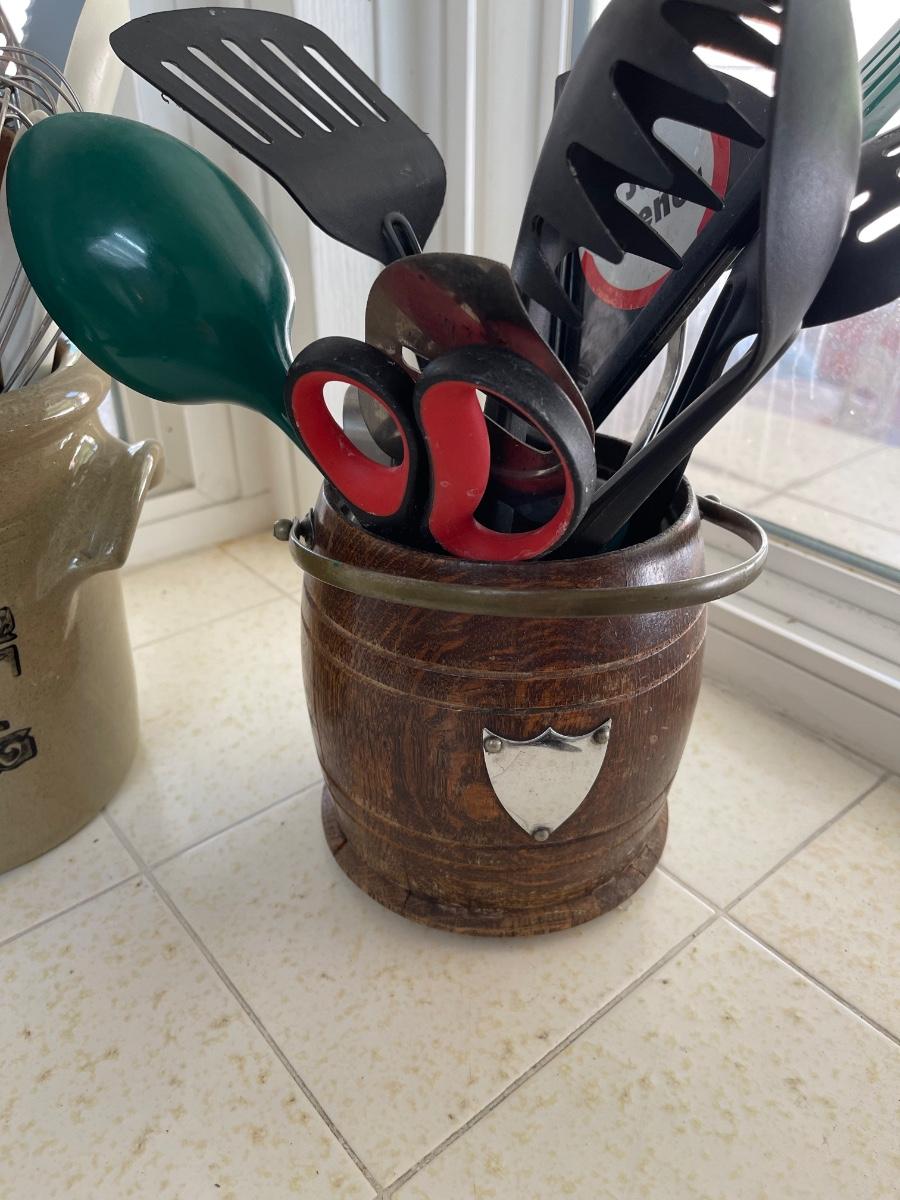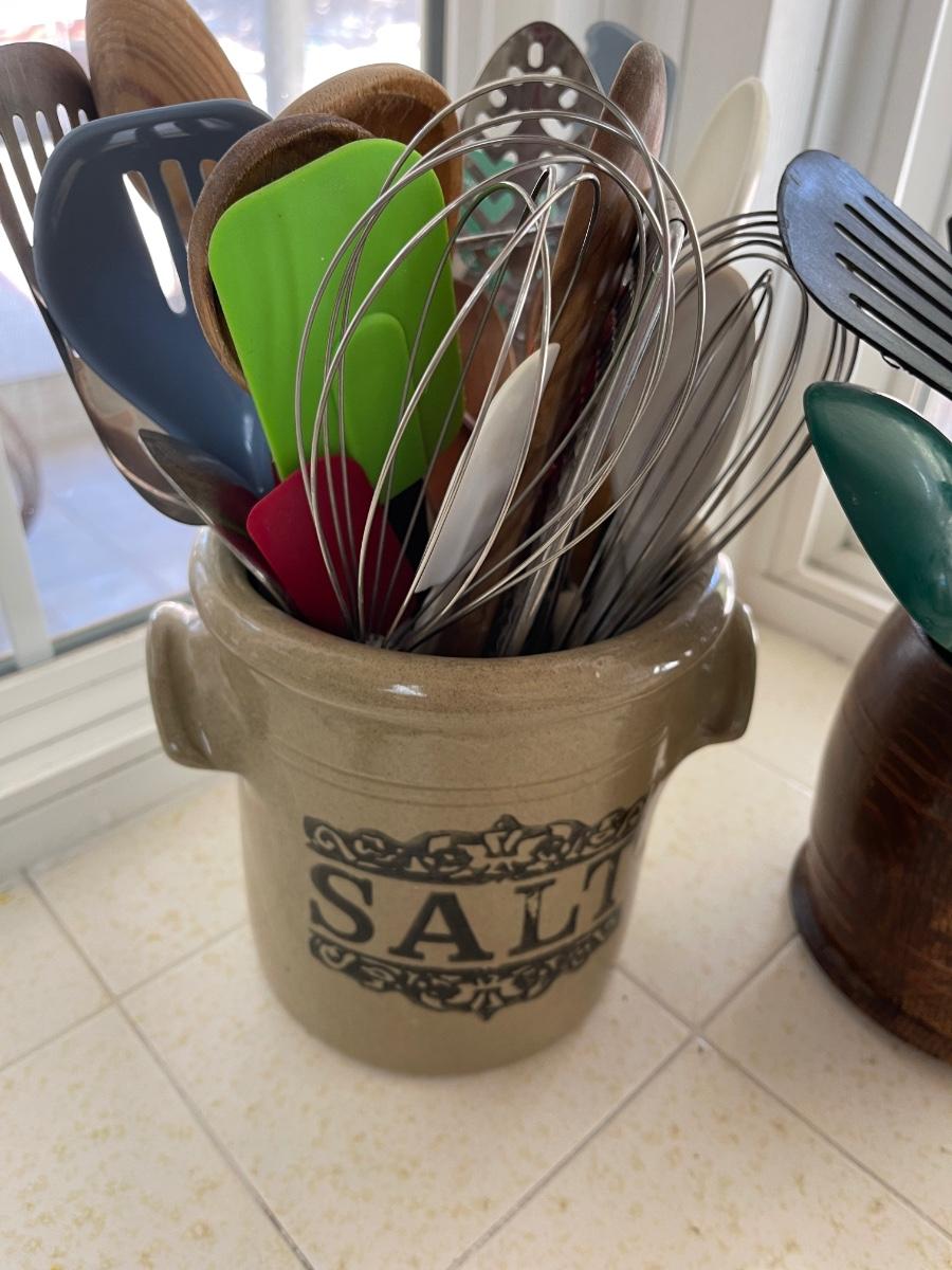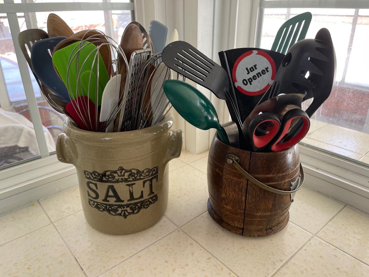 Large lot 2 crocks with kitchen utensils, tools, etc