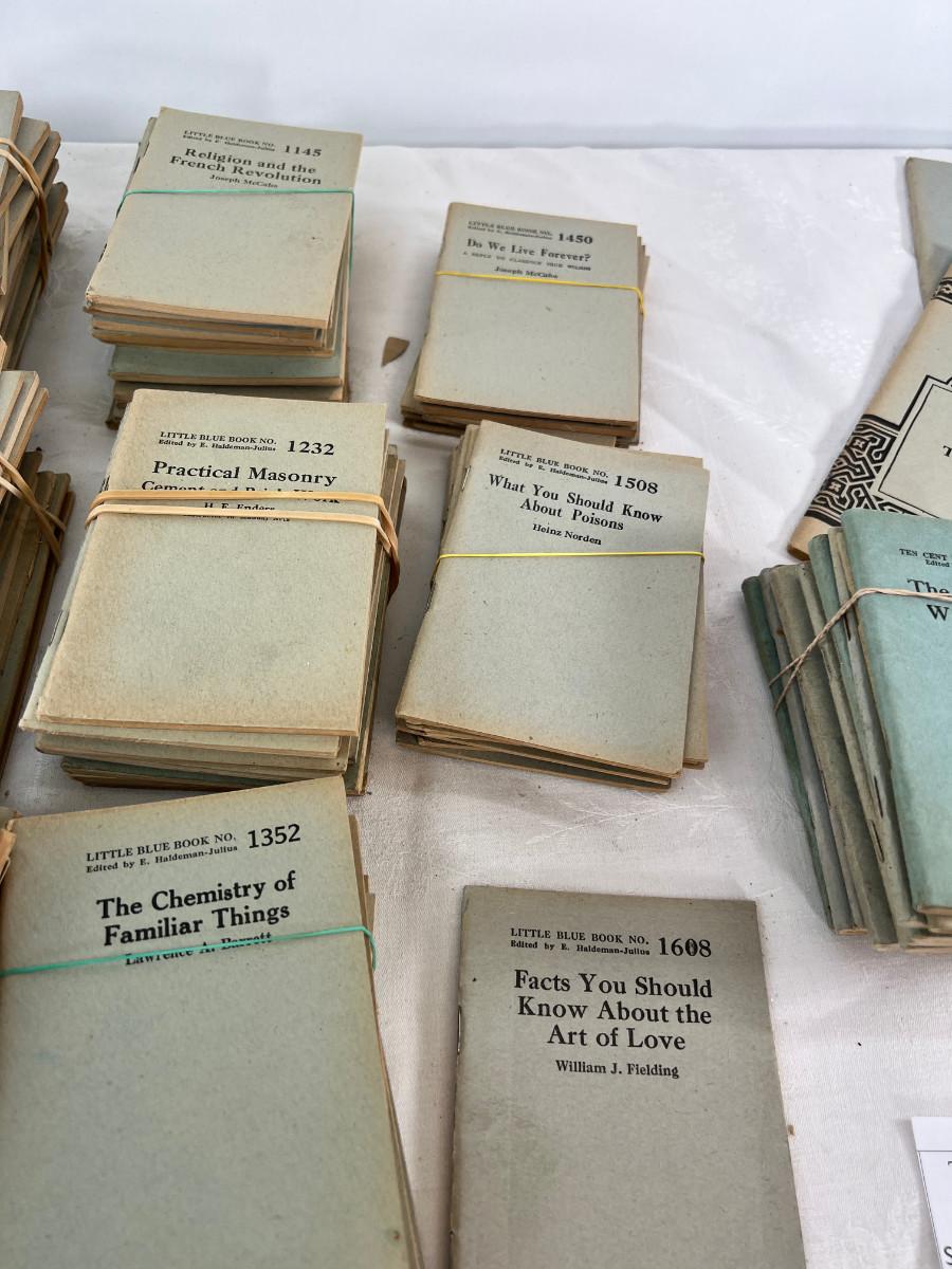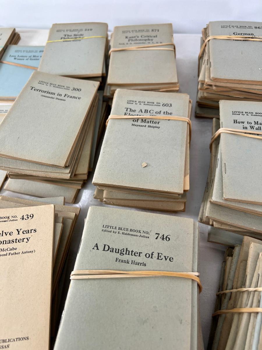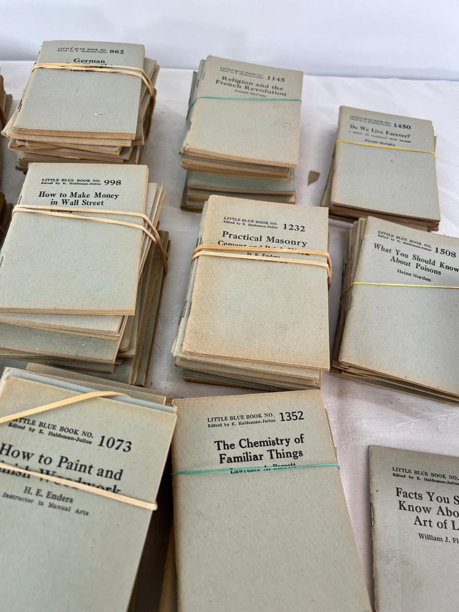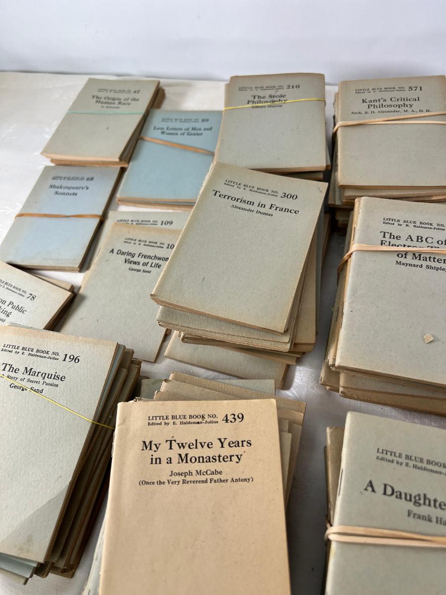 This lot is sorted by number but not complete. This is my collection and it has taken me a lot of years to find this many. Little Blue Books are a series of small staple-bound books published from 1919 through 1978 by the Haldeman-Julius Publishing Company of Girard, Kansas. They were extremely popular, and achieved a total of 300-500 million booklets sold over the series' lifetime.