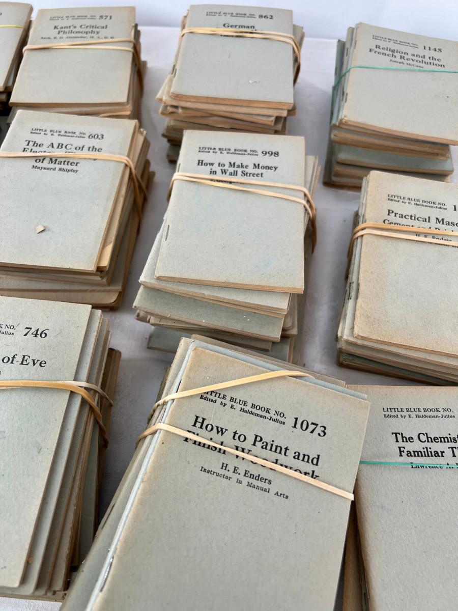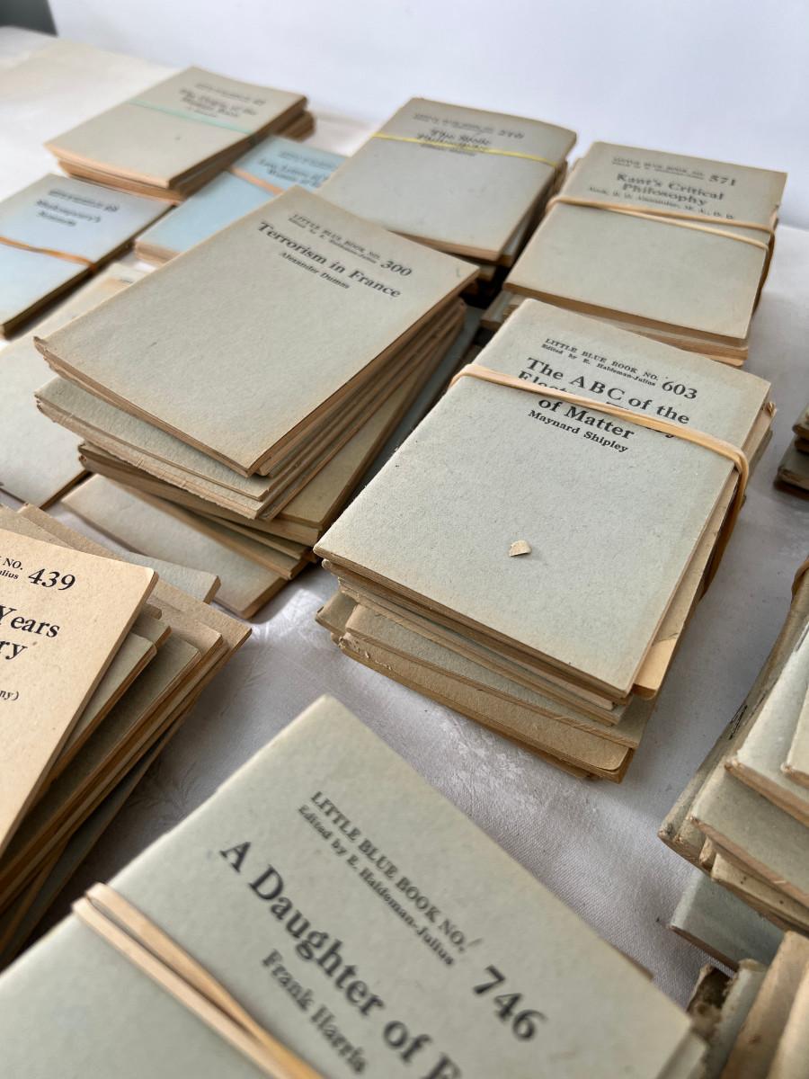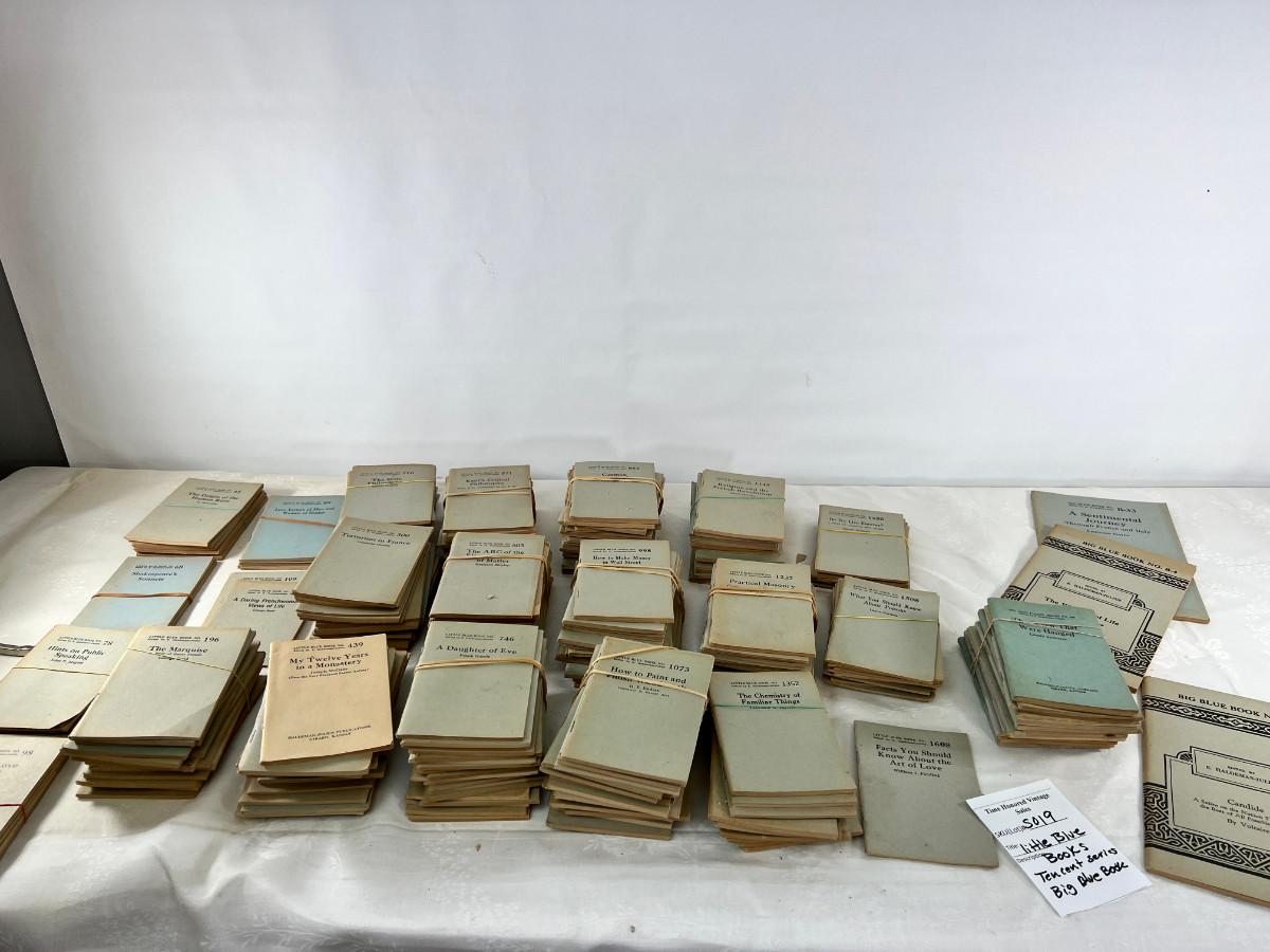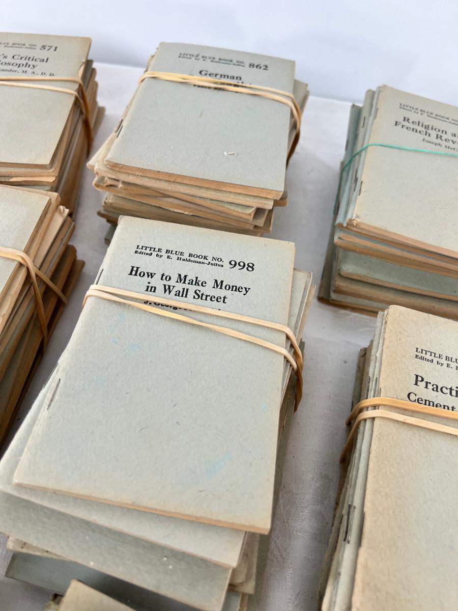 This lot is sorted by number but not complete. This is my collection and it has taken me a lot of years to find this many. Little Blue Books are a series of small staple-bound books published from 1919 through 1978 by the Haldeman-Julius Publishing Company of Girard, Kansas. They were extremely popular, and achieved a total of 300-500 million booklets sold over the series' lifetime.