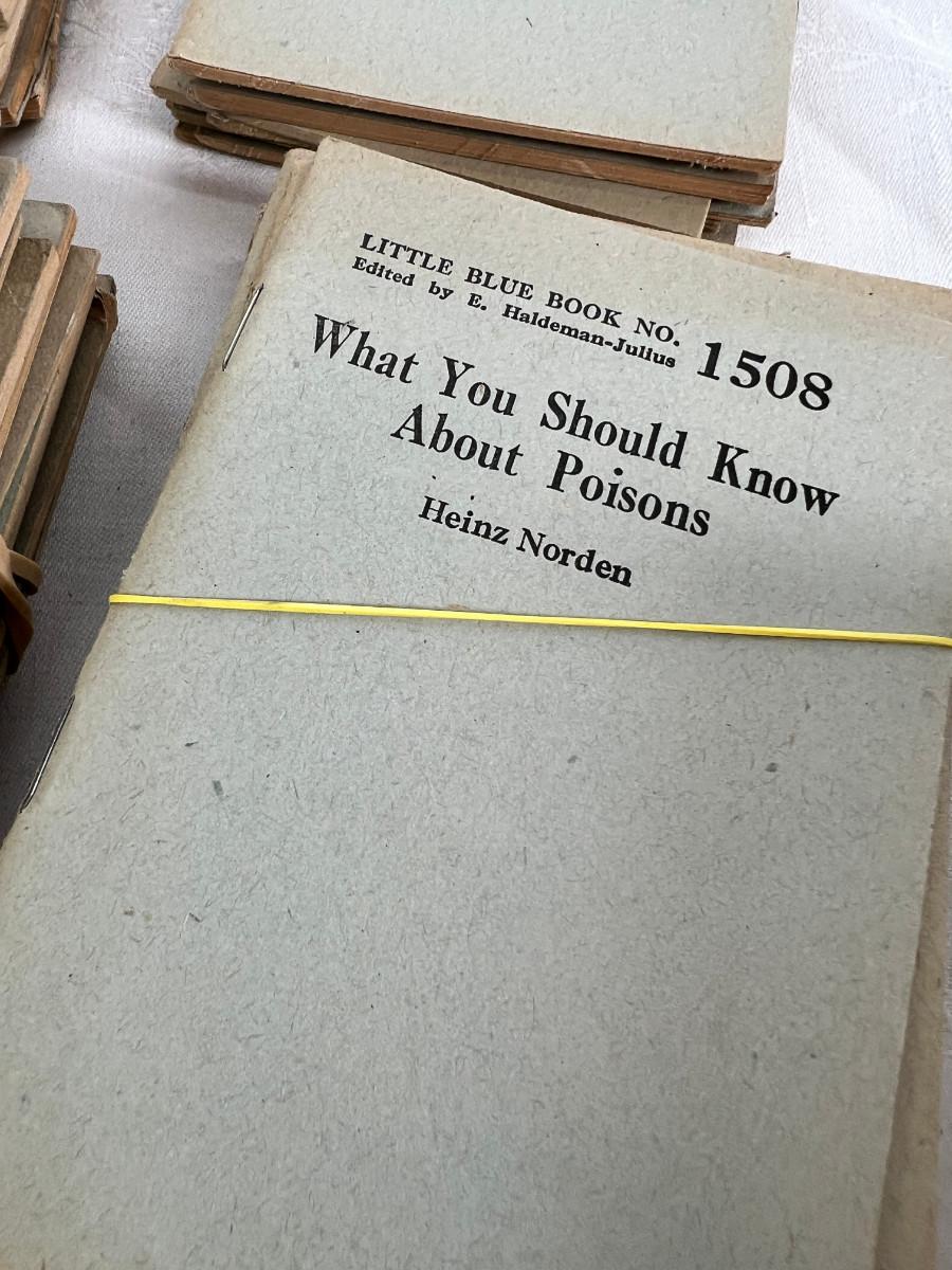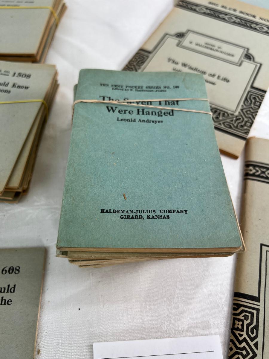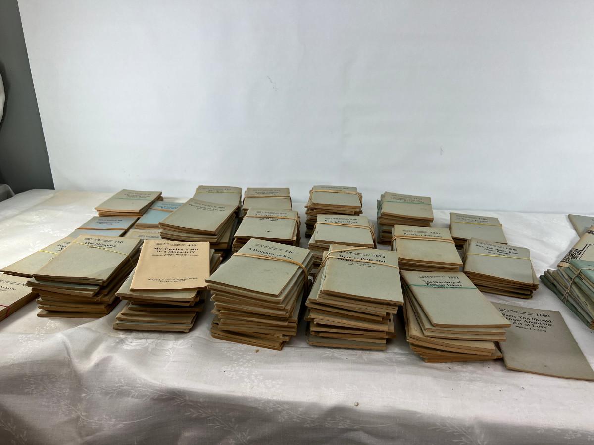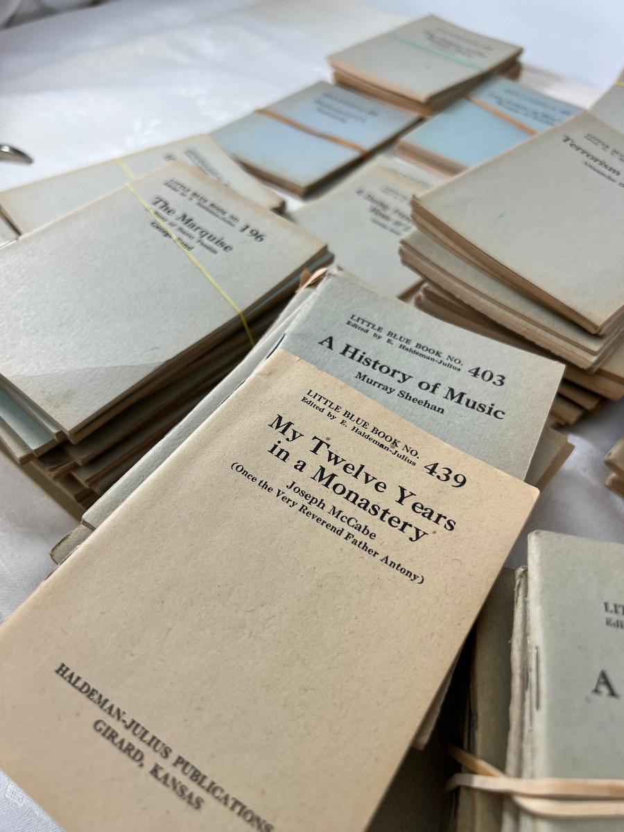 This lot is sorted by number but not complete. This is my collection and it has taken me a lot of years to find this many. Little Blue Books are a series of small staple-bound books published from 1919 through 1978 by the Haldeman-Julius Publishing Company of Girard, Kansas. They were extremely popular, and achieved a total of 300-500 million booklets sold over the series' lifetime.