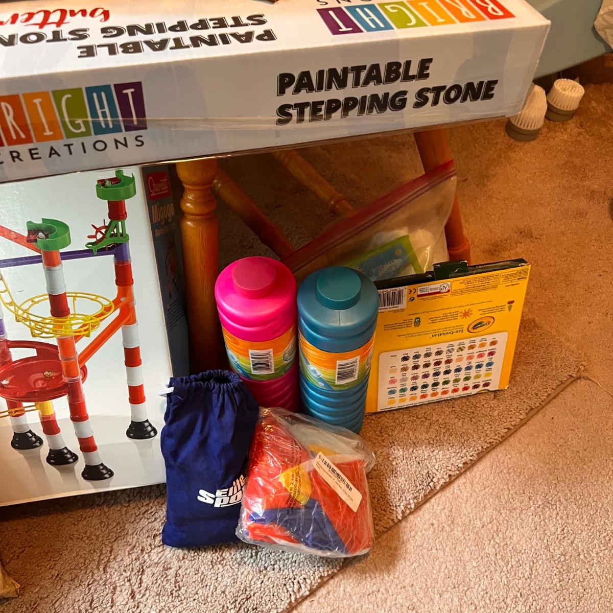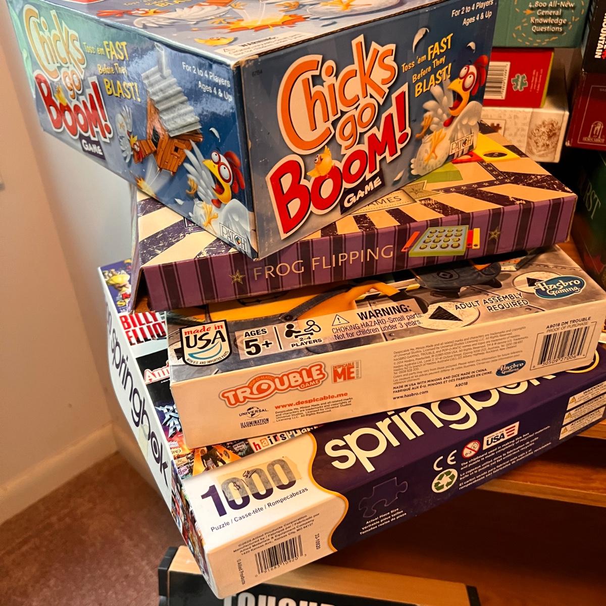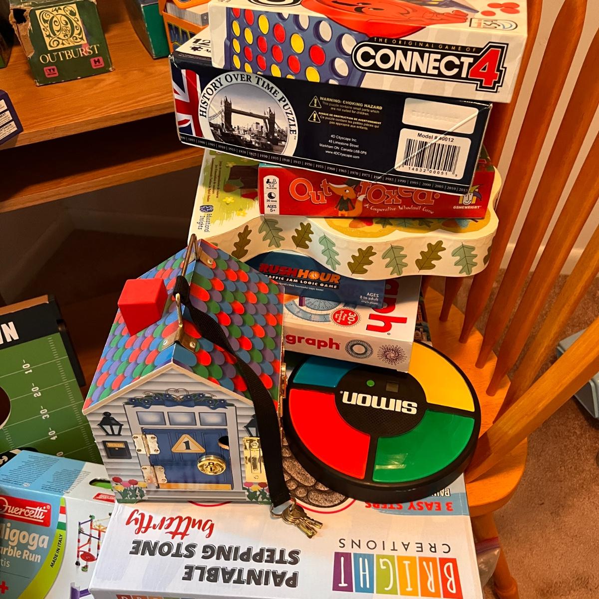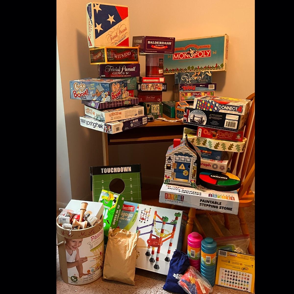 Kids and adult board games and puzzles as well bubbles, chalk, new stepping stone craft.
