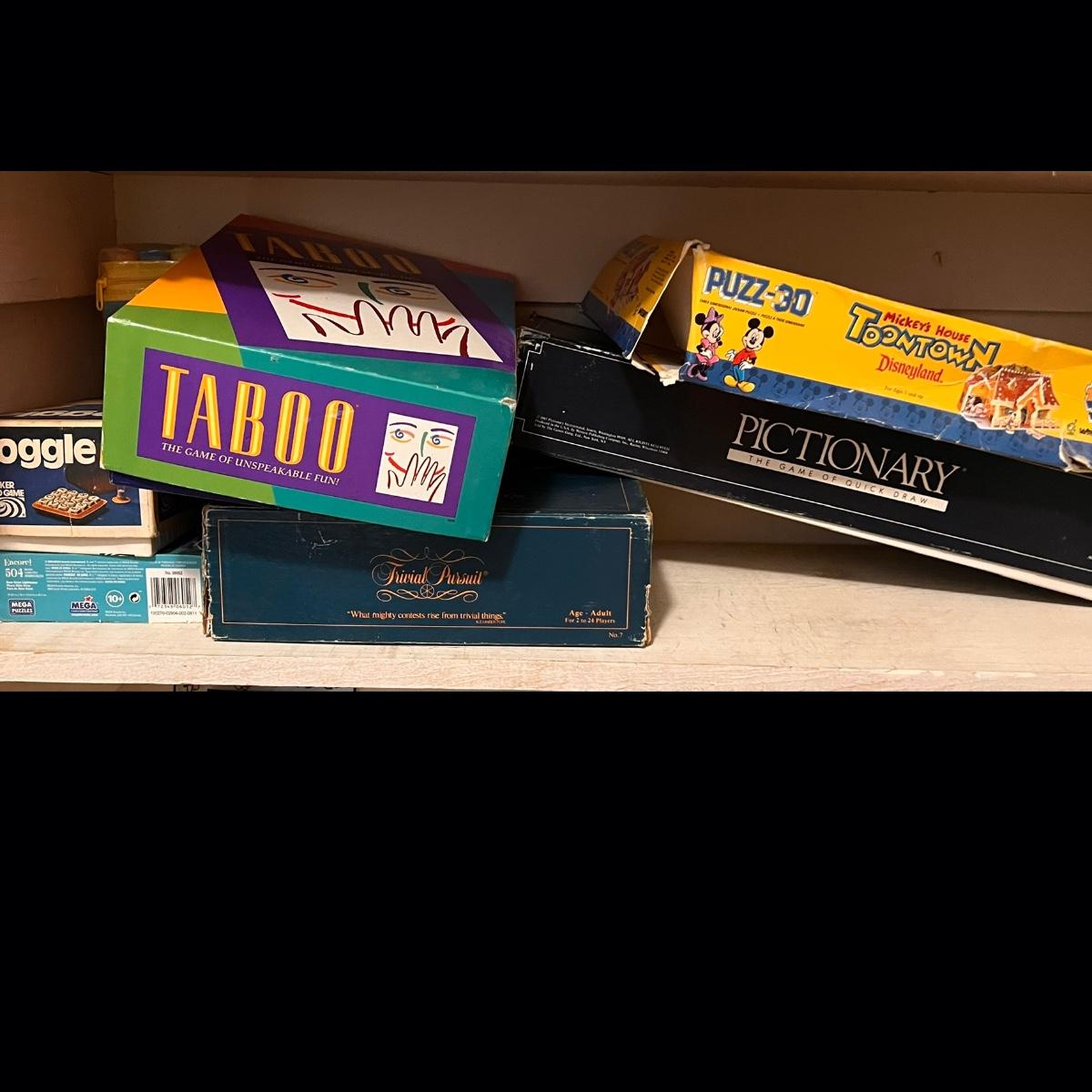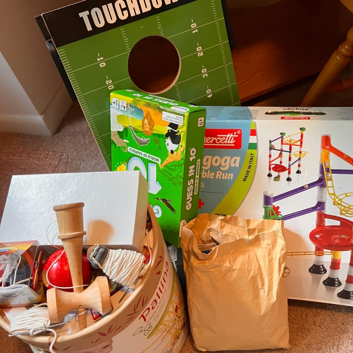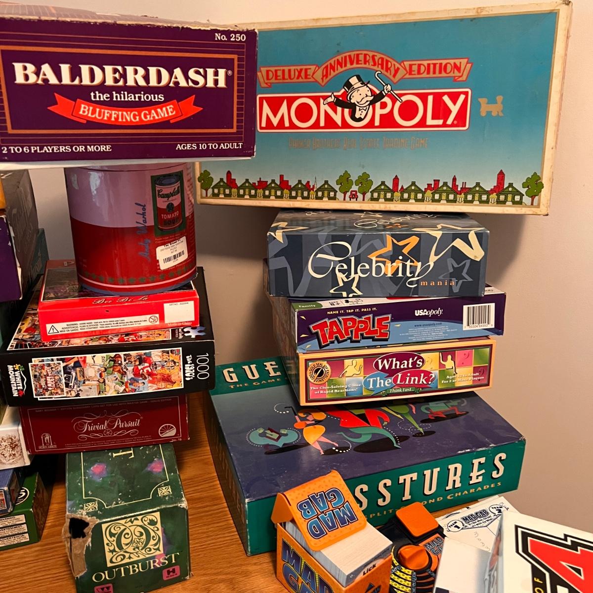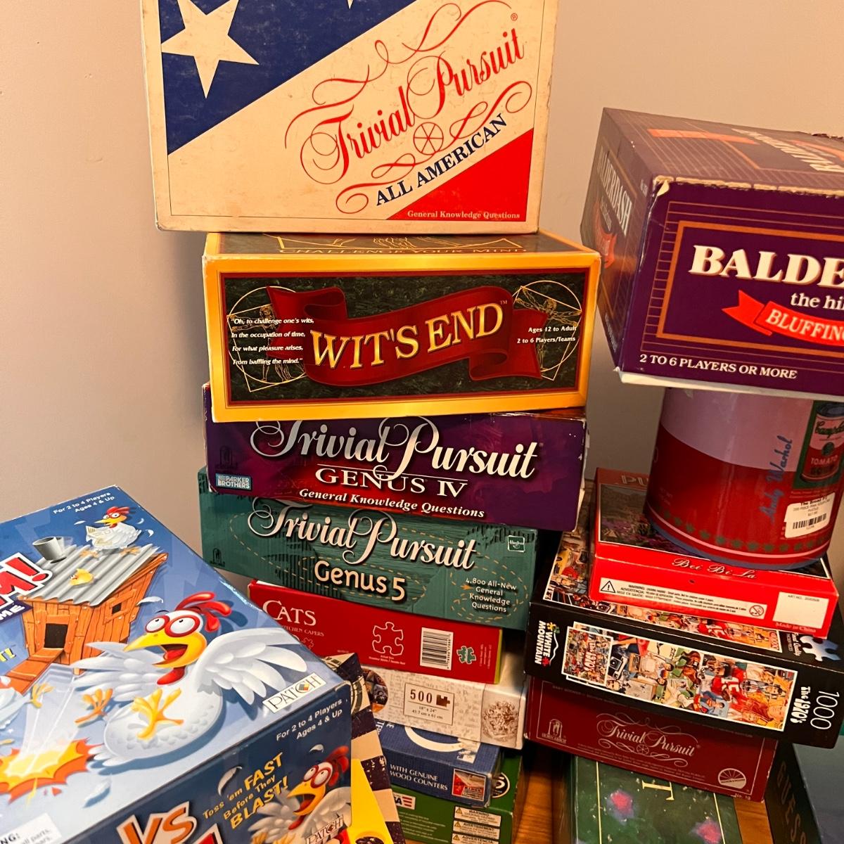 Kids and adult board games and puzzles as well bubbles, chalk, new stepping stone craft.