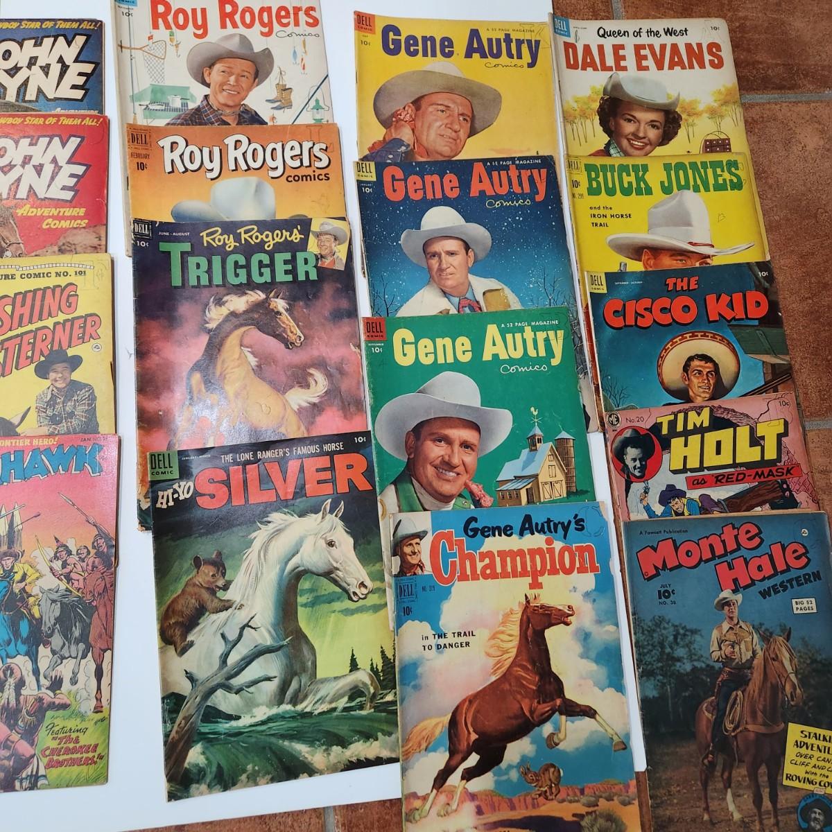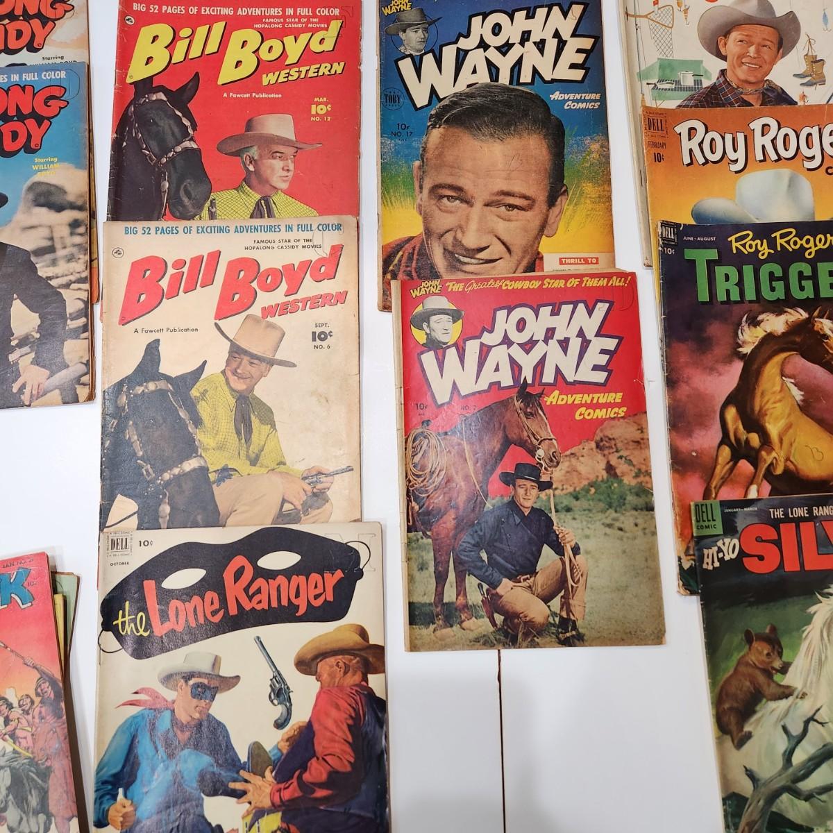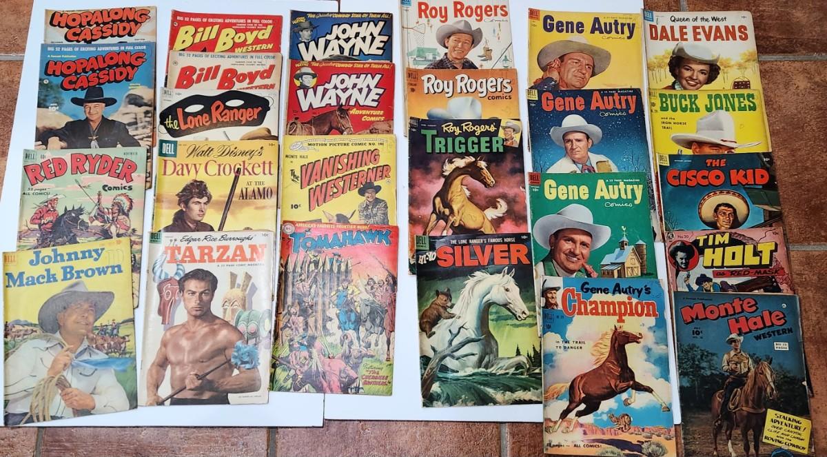 John Wayne Buck Jones Tim Holt, Monte Hale, Dale Evans, Gene Autry, Roy Rogers, Trigger Bill Boyd Papa Hopalong Cassidy,Tomahawk Tarzan, David Crockett Johnny mack Brown, Red Rider.