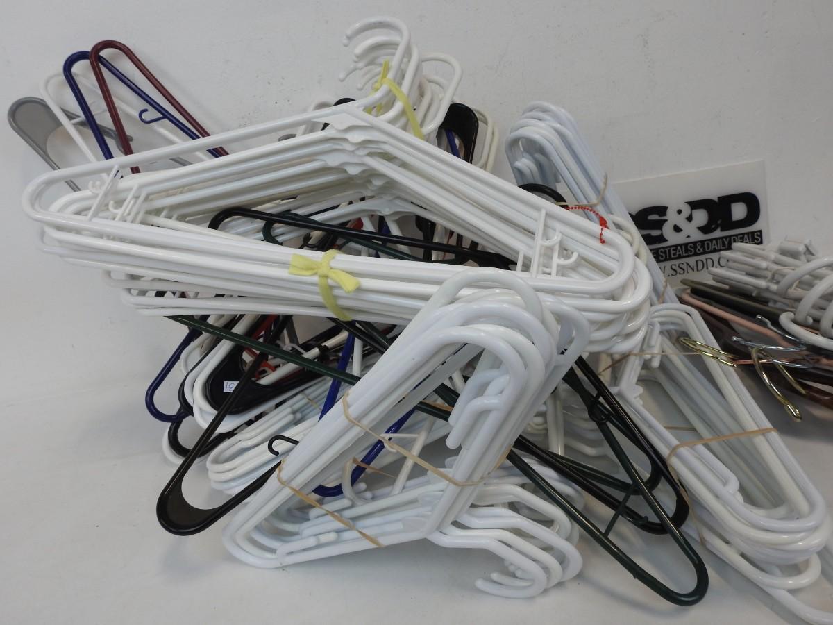 Large Lot Hangers: Plastic, Wooden, Velvet. 50+ Mostly adult size, some kids size
