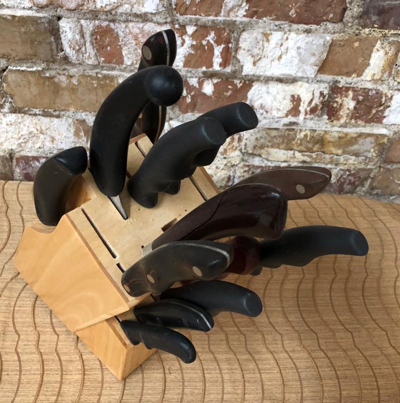 Here are some dozen assorted brand carving knives and a block....Includes Cutco...Excellent condition showing little or no sign of use...