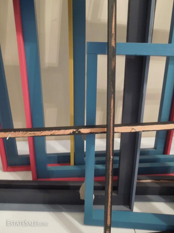 Largest is 49 x 24. smallest is 17 x 17. Solid pine painted in blues, red, yellow and black. No glass or mounting. Some are edged.