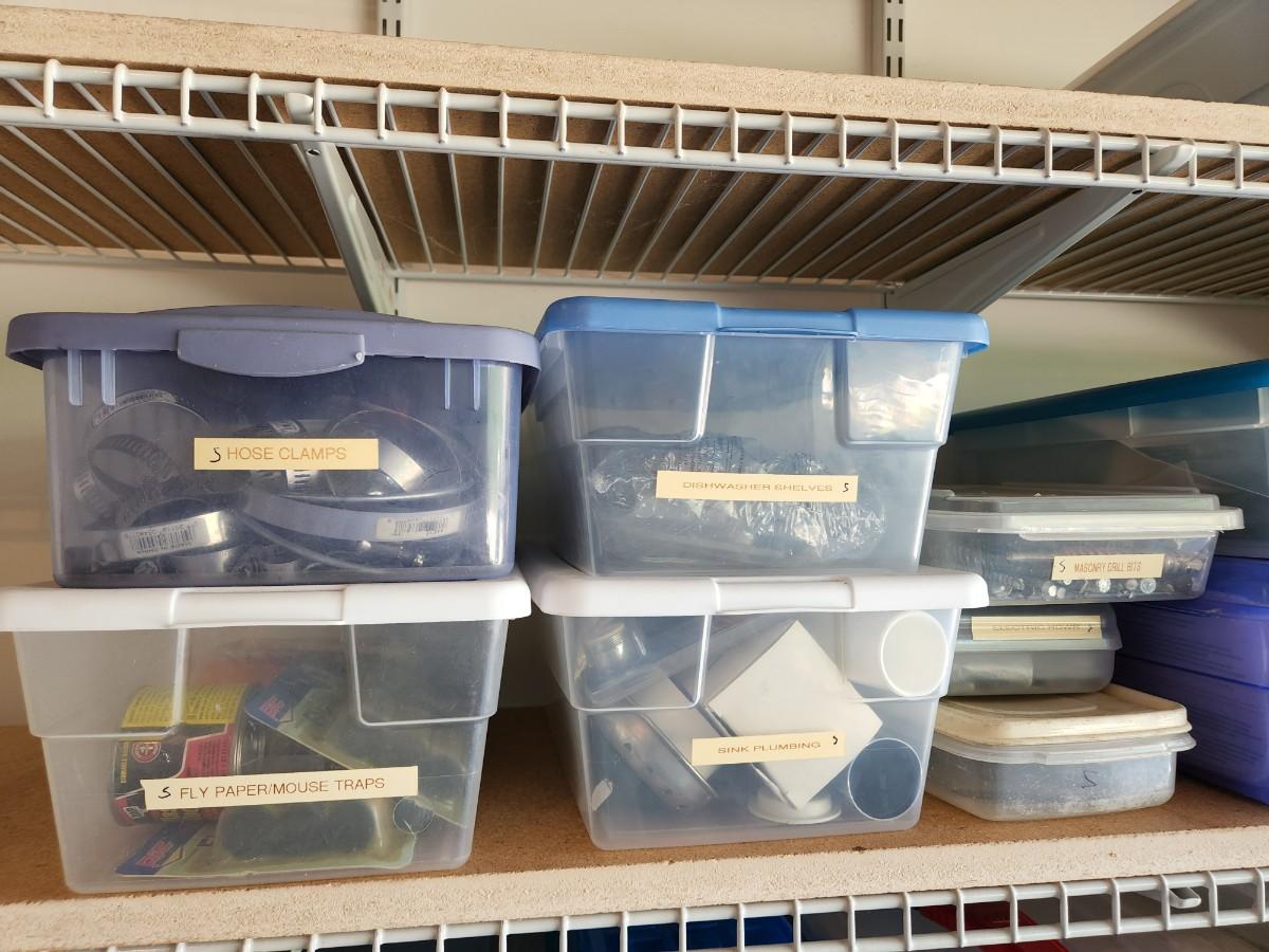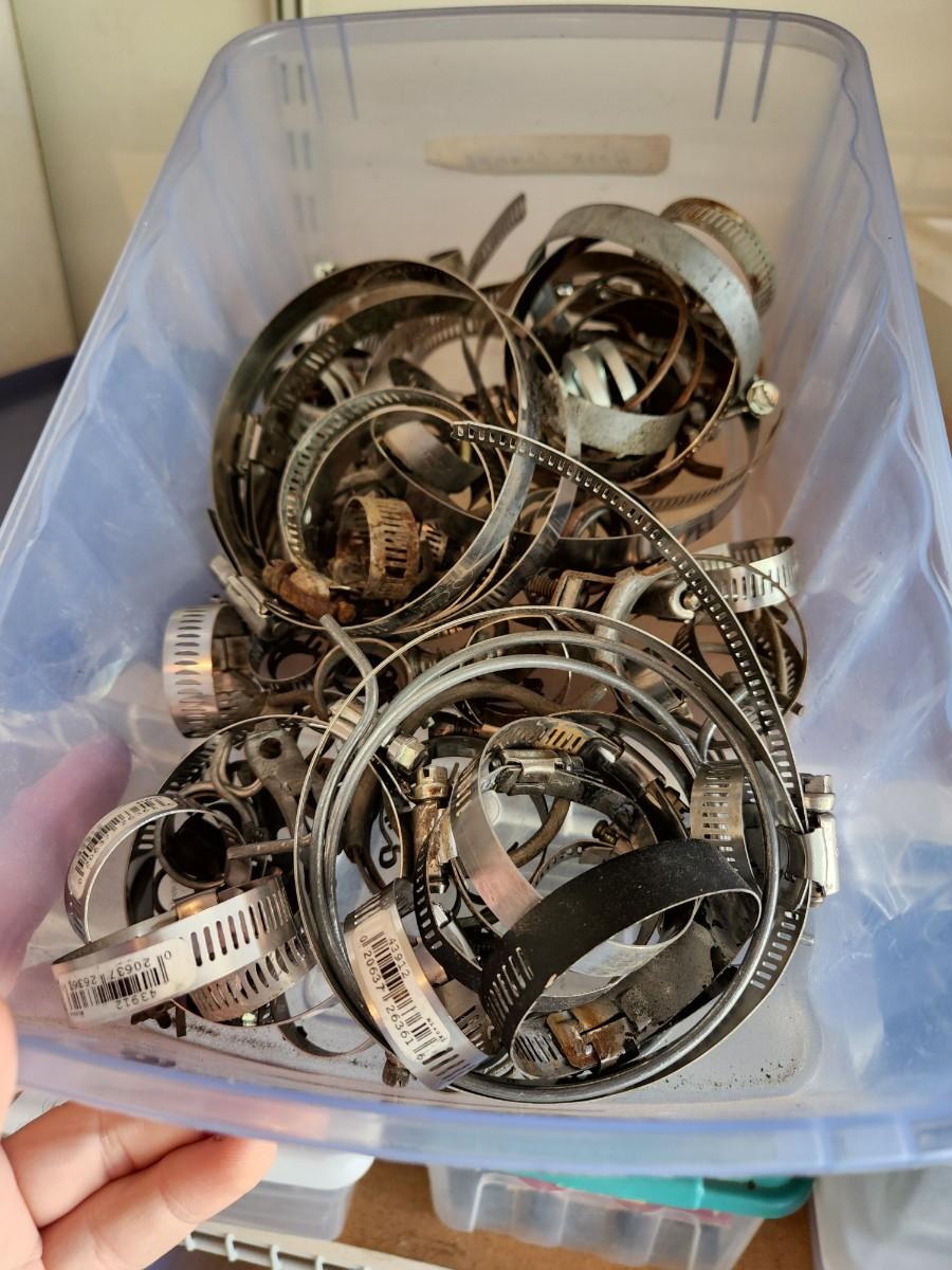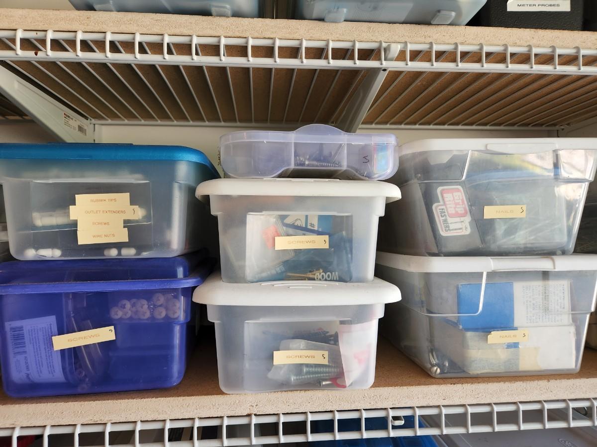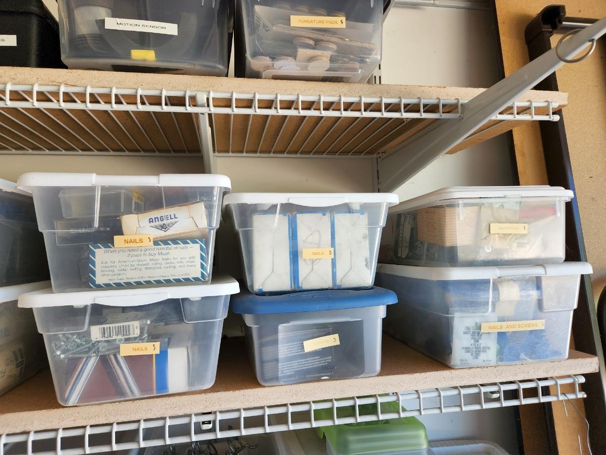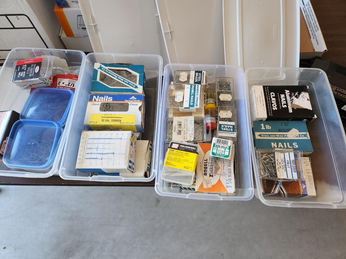Large Lot of 20 Filled Containers Clamps, Fly sticker, Nails, Drill Bits ,Nuts, + more