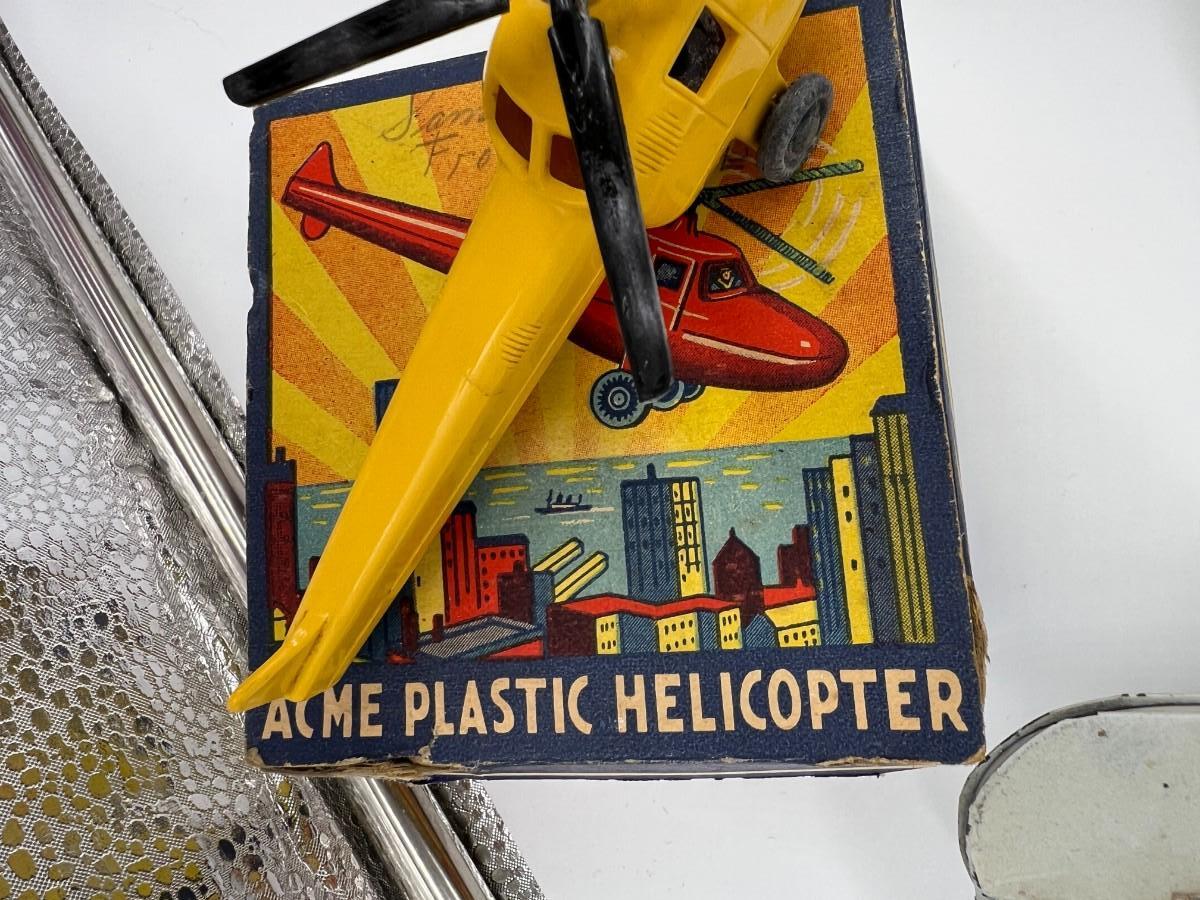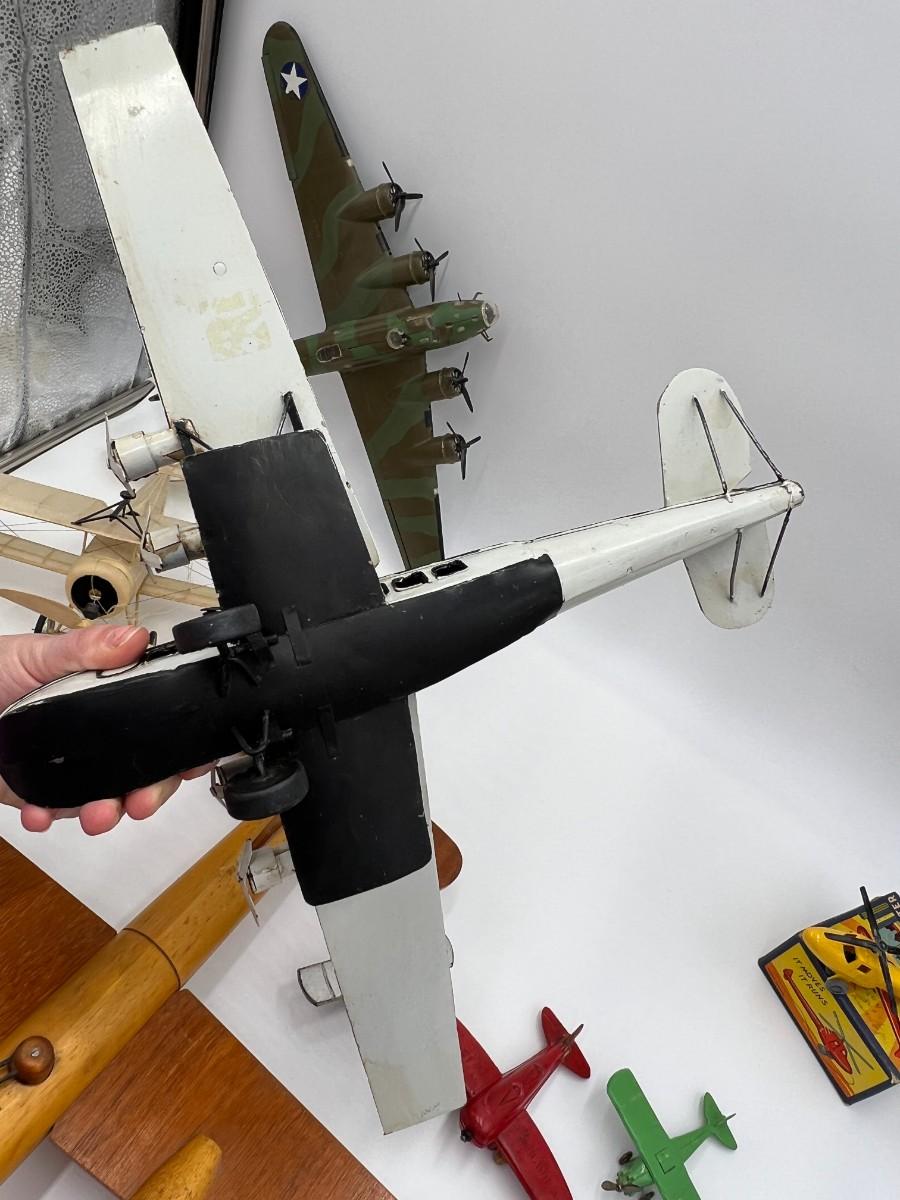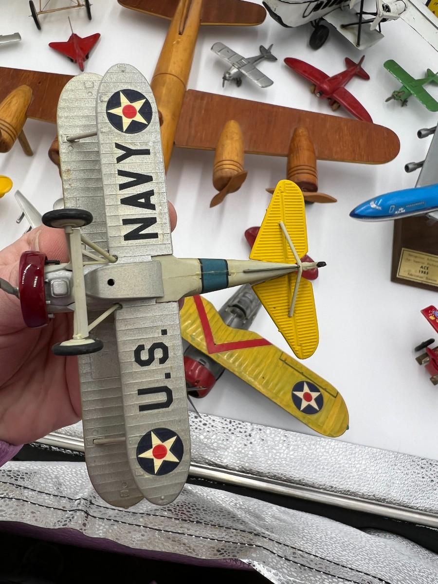 Fantastic large lot of vintage air planes, military planes, commercial plane, and helicopter. Includes a US Army plane, Jolin Company Applston Wisconsin wood plane, ACME plastic helicopter in original toy box, Tootsie Toy cast iron plane, Sun Rubber Company Barberton N.D. plane, UX 214 plane (with broken propeller), US Navy planes, N-X-211, Capital Viscount, Boeing E-3A. Conditions as shown.