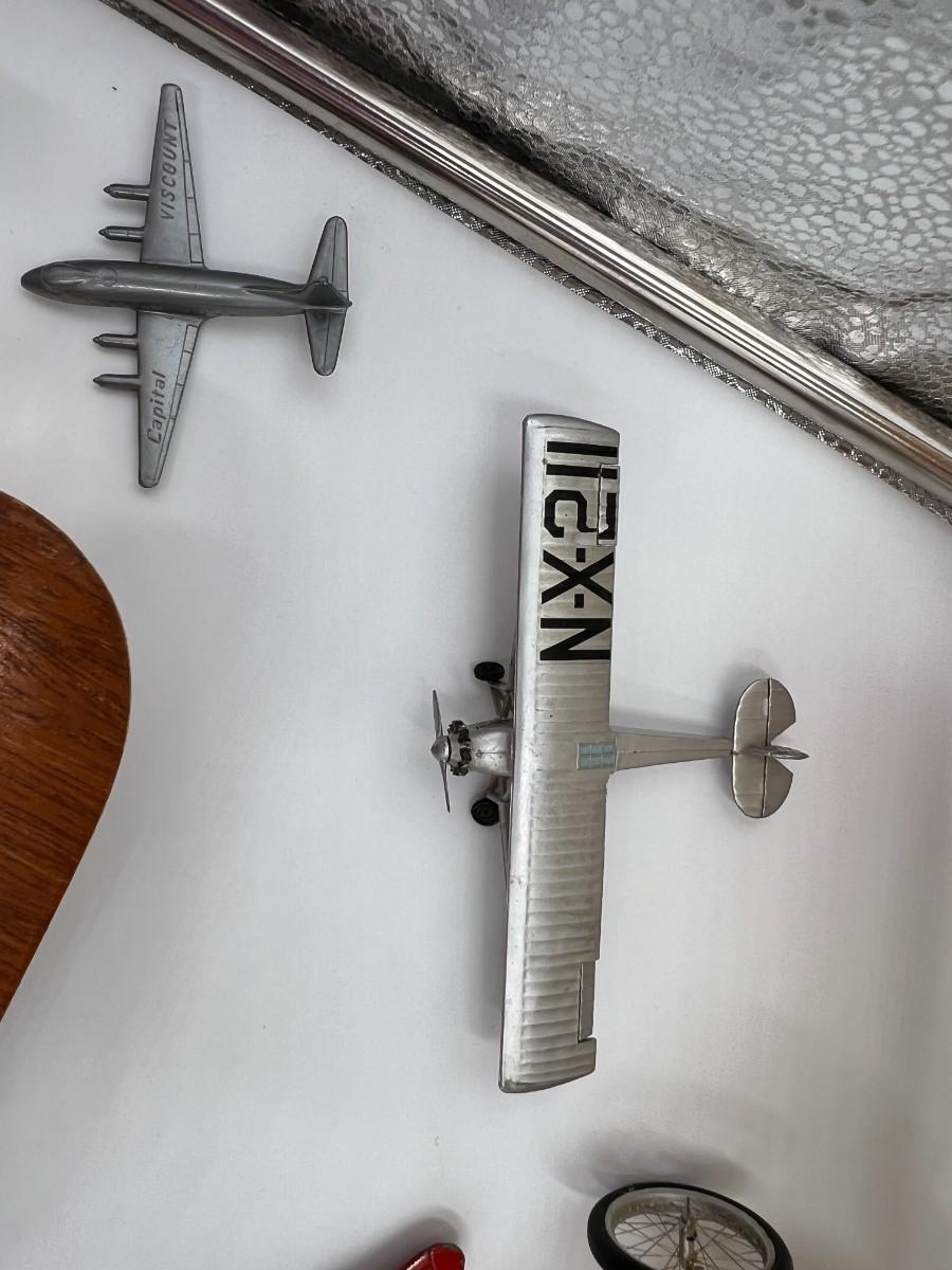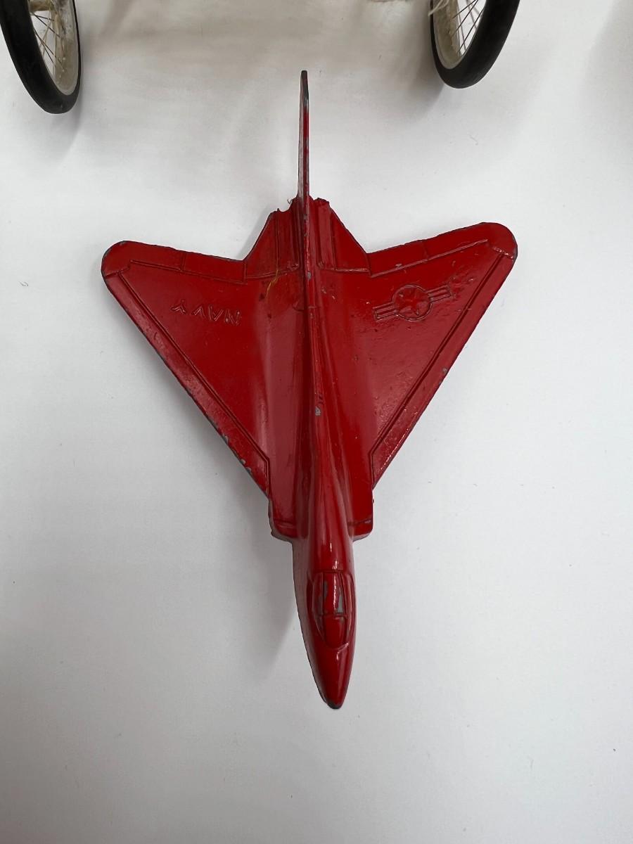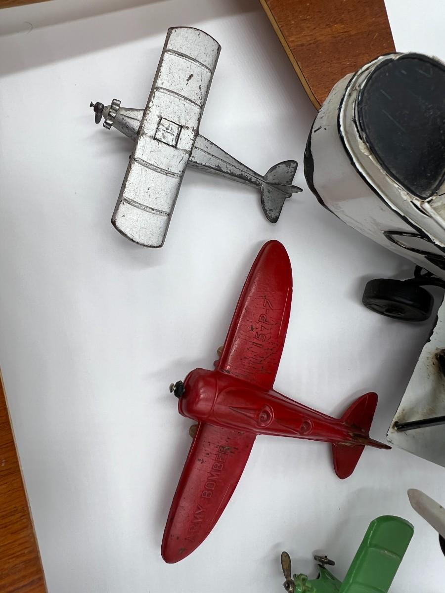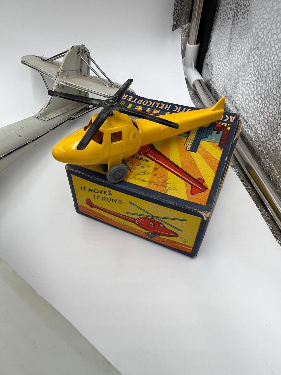 Fantastic large lot of vintage air planes, military planes, commercial plane, and helicopter. Includes a US Army plane, Jolin Company Applston Wisconsin wood plane, ACME plastic helicopter in original toy box, Tootsie Toy cast iron plane, Sun Rubber Company Barberton N.D. plane, UX 214 plane (with broken propeller), US Navy planes, N-X-211, Capital Viscount, Boeing E-3A. Conditions as shown.