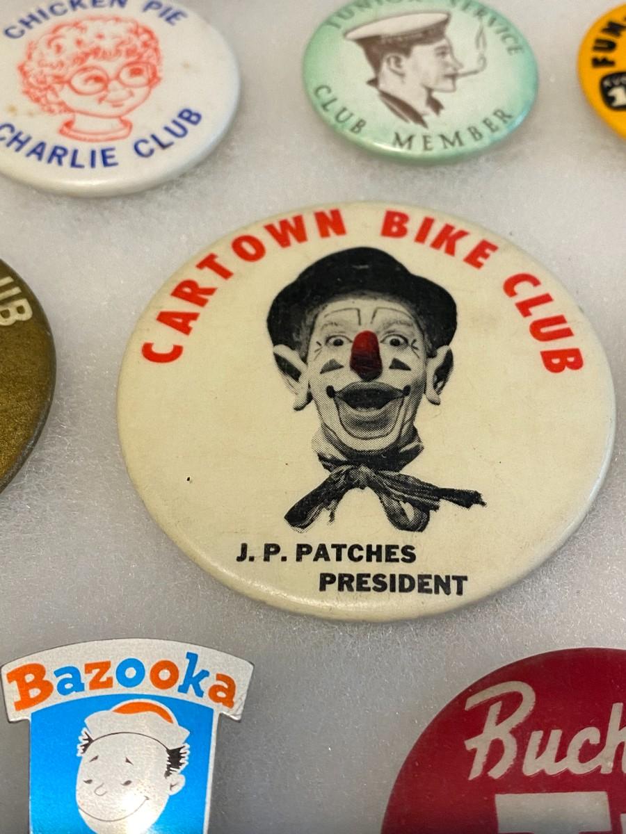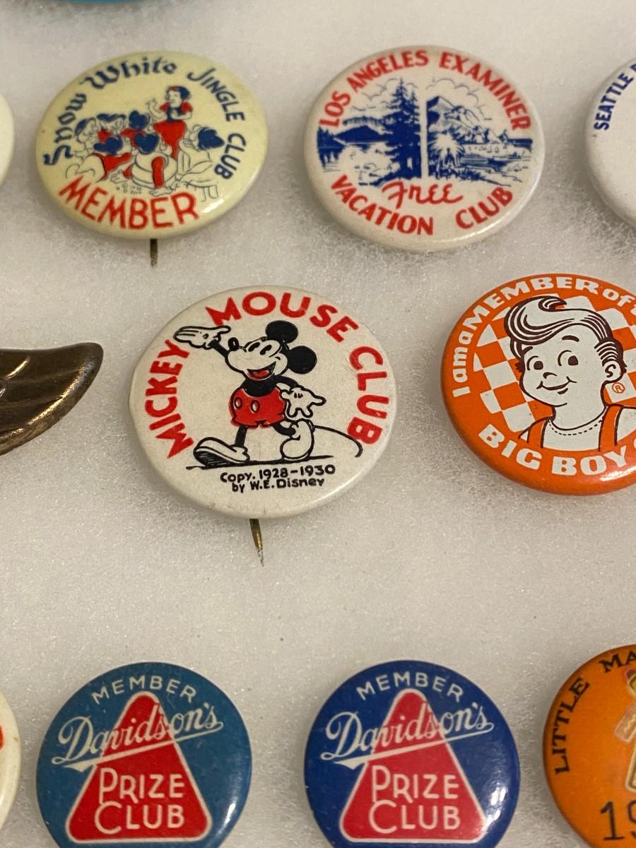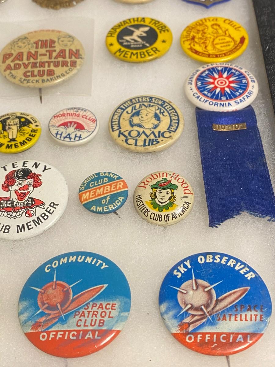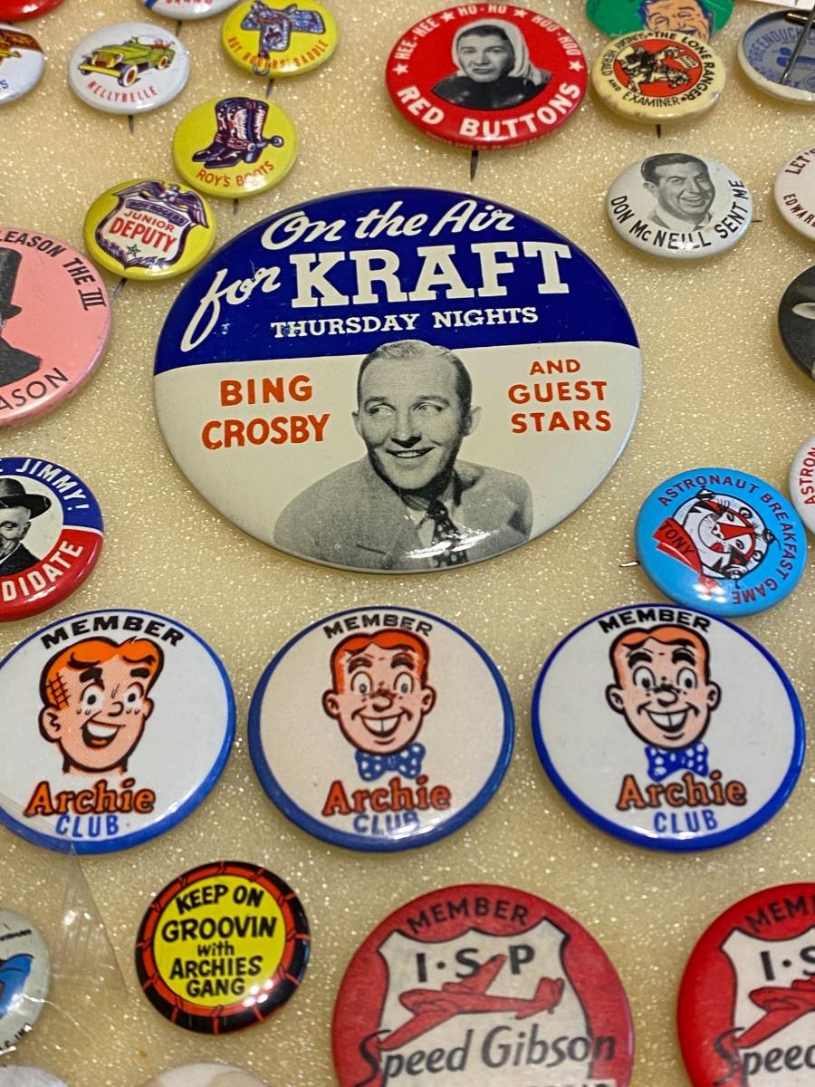 Large Lot of Antique 1900s Buttons Pins Badges and Ribbons of Television Cartoons Characters