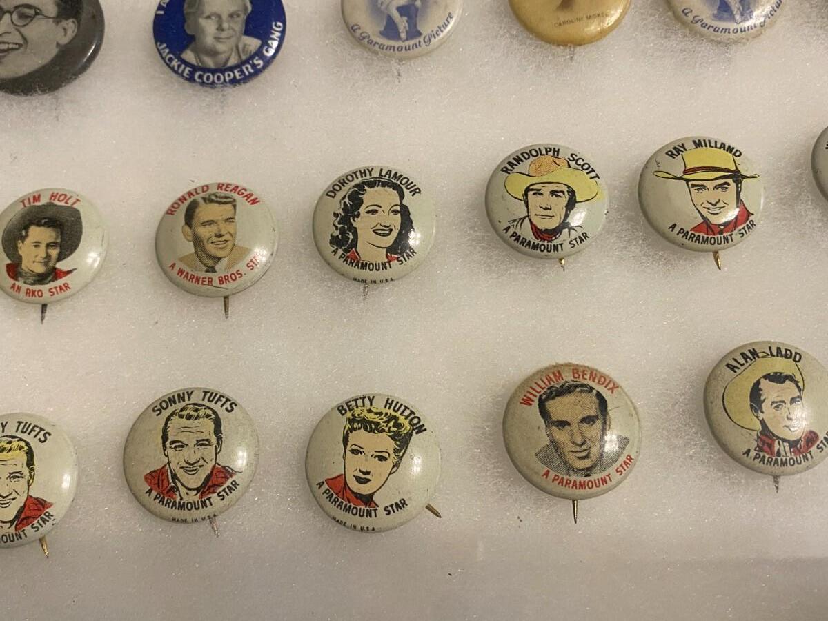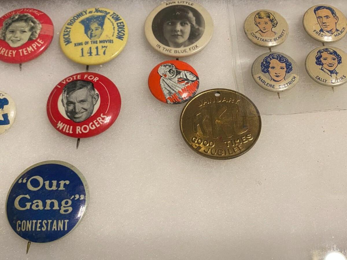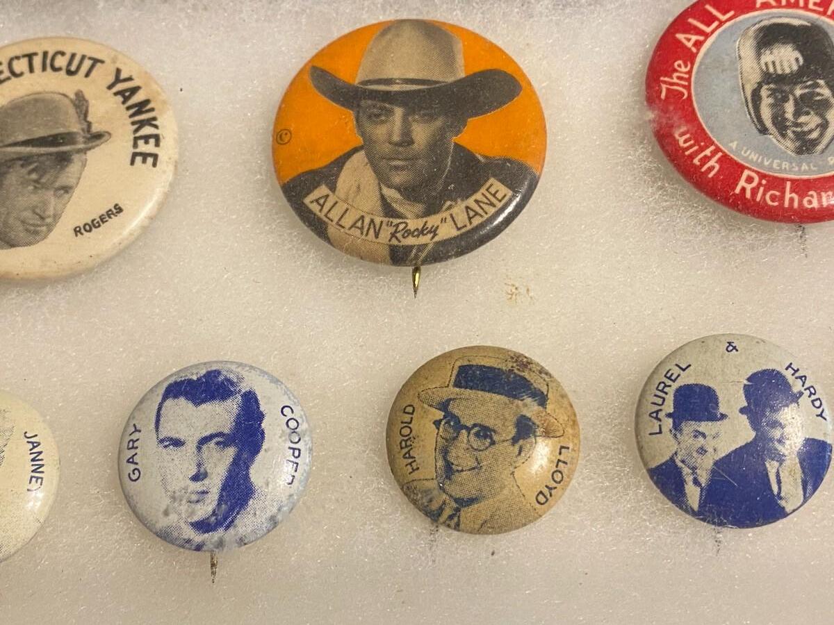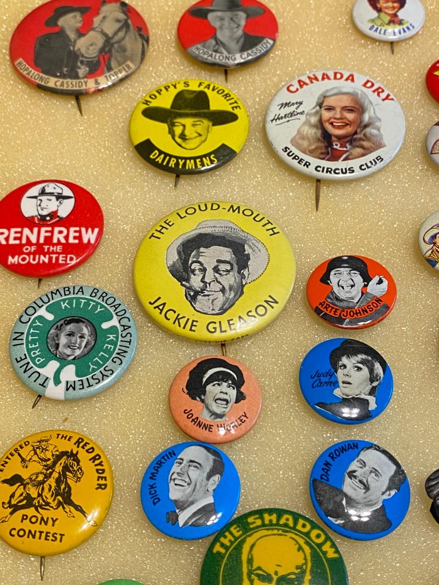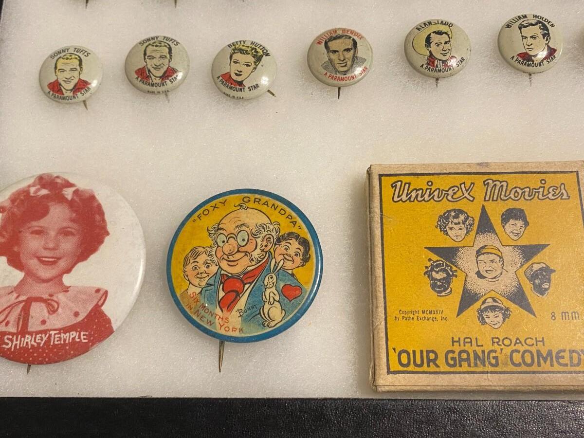 Large Lot of Antique 1900s Buttons Pins Badges and Ribbons of Television Cartoons Characters. Includes Foxy Grandpa button, Betty Hutton button, Paramount Star Buttons, Shirley Temple Button, Ann Little in the Blue Fox, Will Rogers, The Mummy, Mickey Rooney, Allan Lane, Gary Coooper, Harold Lloyd, Laurel & Hardy, Strom Becker, National Boys Magikclub, Komic Club, Robin Hood, Junior Explorers Club, Teeny the Clown, The Pan-Tan Adventure Club, and more! Condition as shown.